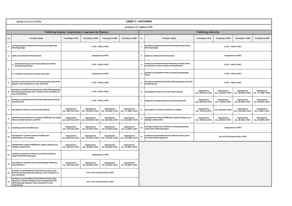 CZĘŚĆ C. FAKTORING OBOWIĄZUJE OD DNIA 4 LIPCA 2015 R. prowizja w % / opłata w PLN Faktoring krajowy i eksportowy (z regresem do Zbywcy) Prowizje i opłaty Lp. Transakcje w PLN Transakcje w EUR Transakcje w USD Faktoring odwrotny Transakcje w GBP Lp. Prowizje i opłaty Transakcje w PLN Transakcje w EUR Transakcje w USD Transakcje w GBP 1. prowizja przygotowawcza (od kwoty przyznanego limitu faktoringowego) 0,10% - 3,00% (+VAT) 1. prowizja przygotowawcza (od kwoty przyznanego limitu faktoringowego) 0,10% - 3,00% (+VAT) 2. opłata za aranżowanie finansowania negocjowana (+VAT) 2. opłata za aranżowanie finansowania negocjowana (+VAT) 0,10% - 3,00% (+VAT) 3. prowizja za administrowanie fakturami (od kwoty brutto przesłanych w danym miesiącu wierzytelności) 0,10% - 3,00% (+VAT) 2) minimalna miesięczna prowizja operacyjna negocjowana (+VAT) 4. prowizja za odnowienie limitu (od kwoty odnawianego limitu) 0,10% - 3,00% (+VAT) 4. prowizja za odnowienie limitu (od kwoty przyznanego limitu, dotyczy umów zawartych na czas określony) 0,10% - 3,00% (+VAT) 5. prowizja za podwyższenie limitu faktoringowego (od kwoty podwyższenia) 0,10% - 3,00% (+VAT) 5. prowizja za przedłużenie dostępności limitu faktoringowego (od kwoty przyznanego limitu, dotyczy umów zawartych na czas nieokreślony) 0,10% - 3,00% (+VAT) 6. sporządzenie aneksu do umowy faktoringowej negocjowana min. 500 PLN (+VAT) negocjowana min. 125 EUR (+VAT) negocjowana min. 160 USD (+VAT) negocjowana min. 111 GBP (+VAT) 6. prowizja za podwyższenie limitu faktoringowego (od kwoty podwyższenia) 0,10% - 3,00% (+VAT) 7. dołączenie nowego Dostawcy do Listy Dostawców negocjowana min. 300 PLN (+VAT) negocjowana min. 75 EUR (+VAT) negocjowana min. 96 USD (+VAT) negocjowana min. 66 GBP (+VAT) 7. sporządzenie aneksu do umowy faktoringowej negocjowana min. 500 PLN (+VAT) negocjowana min. 125 EUR (+VAT) negocjowana min. 160 USD (+VAT) negocjowana min. 111 GBP (+VAT) 8. sporządzenie i wysłanie wezwania do zapłaty negocjowana min. 10 PLN (+VAT) min. 2,50 EUR (+VAT) negocjowana min. 3,50 USD (+VAT) negocjowana min. 2 GBP (+VAT) 8. administrowanie fakturami w systemie BOŚFaktor (za każdą fakturę zarejestrowaną w systemie) negocjowana min. 2,00 PLN (+VAT) negocjowana min. 0,50 EUR (+VAT) negocjowana min. 0,60 USD (+VAT) negocjowana min. 0,40 GBP (+VAT) 9. udostępnienie systemu BOŚFaktor (opłata miesięczna za każdego użytkownika) negocjowana min. 150 PLN (+VAT) negocjowana min. 40 EUR (+VAT) negocjowana min. 50 USD (+VAT) negocjowana min. 33 GBP (+VAT) 9. weryfikacja limitu dla Odbiorców negocjowana min. 150 PLN (+VAT) negocjowana min. 50 EUR (+VAT) negocjowana min. 60 USD (+VAT) negocjowana min. 33 GBP (+VAT) 10. prowizja za gotowość (naliczana od niewykorzystanej części limitu faktoringowego) negocjowana (+VAT) 10. sporządzenie i wysłanie monitu do Odbiorców opóźniających się z zapłatą negocjowana min. 6,00 PLN (+VAT) negocjowana min. 2,50 EUR (+VAT) negocjowana min. 3,50 USD (+VAT) negocjowana min. 1,80 GBP (+VAT) 11. prowizja za wypowiedzenie przez Klienta umowy przed terminem jej obowiązywania min. 0,10% od kwoty limitu (+VAT) 11. udostępnienie systemu BOŚFaktor (opłata miesięczna za każdego użytkownika) negocjowana min. 150 PLN (+VAT) negocjowana min. 40 EUR (+VAT) negocjowana min. 50 USD (+VAT) negocjowana min. 33 GBP (+VAT) 12. prowizja za gotowość (naliczana od niewykorzystanej części limitu faktoringowego) 13. sporządzenie i wysłanie pisma zwalniającego Odbiorcę z cesji należności 14. prowizja za wypowiedzenie przez Klienta umowy przed terminem jej obowiązywania (dotyczy umów zawartych na czas określony) min. 0,10% od kwoty limitu (+VAT) 15. prowizja za wypowiedzenie przez Klienta umowy przed upływem 8 miesięcy każdego okresu dostępności limitu faktoringowego (dotyczy umów zawartych na czas nieokreślony) min. 0,10% od kwoty limitu (+VAT) 1) prowizja operacyjna (od kwoty nabytej przez Bank wierzytelności brutto) 3. negocjowana (+VAT) negocjowana min. 100 PLN (+VAT) negocjowana min. 25 EUR (+VAT) negocjowana min. 30 USD (+VAT) negocjowana min. 20 GBP (+VAT)