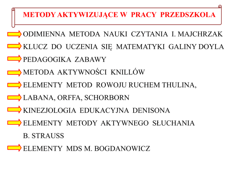 METODY AKTYWIZUJĄCE W PRACY PRZEDSZKOLA ODIMIENNA METODA NAUKI CZYTANIA I. MAJCHRZAK KLUCZ DO UCZENIA SIĘ MATEMATYKI GALINY DOYLA PEDAGOGIKA ZABAWY METODA AKTYWNOŚCI KNILLÓW ELEMENTY METOD ROWOJU RUCHEM THULINA, LABANA, ORFFA, SCHORBORN KINEZJOLOGIA EDUKACYJNA DENISONA ELEMENTY METODY AKTYWNEGO SŁUCHANIA B. STRAUSS ELEMENTY MDS M. BOGDANOWICZ