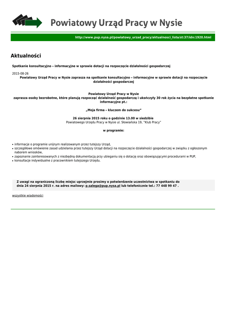 http://www.pup.nysa.pl/powiatowy_urzad_pracy/aktualnosci_lista/st:37/idn:1920.html Aktualności Spotkanie konsultacyjno – informacyjne w sprawie dotacji na rozpoczęcie działalności gospodarczej 2015-08-26 Powiatowy Urząd Pracy w Nysie zaprasza na spotkanie konsultacyjno – informacyjne w sprawie dotacji na rozpoczęcie działalności gospodarczej Powiatowy Urząd Pracy w Nysie zaprasza osoby bezrobotne, które planują rozpocząć działalność gospodarczą i ukończyły 30 rok życia na bezpłatne spotkanie informacyjne pt.: „Moja firma – kluczem do sukcesu” 26 sierpnia 2015 roku o godzinie 13.00 w siedzibie Powiatowego Urzędu Pracy w Nysie ul. Słowiańska 19, ”Klub Pracy” w programie: ● ● ● ● informacje o programie unijnym realizowanym przez tutejszy Urząd, szczegółowe omówienie zasad udzielania przez tutejszy Urząd dotacji na rozpoczęcie działalności gospodarczej w związku z ogłoszonym naborem wniosków, zapoznanie zainteresowanych z niezbędną dokumentacją przy ubieganiu się o dotację oraz obowiązującymi procedurami w PUP, konsultacje indywidualne z pracownikiem tutejszego Urzędu. Z uwagi na ograniczoną liczbę miejsc uprzejmie prosimy o potwierdzenie uczestnictwa w spotkaniu do dnia 24 sierpnia 2015 r. na adres mailowy: [email protected] lub telefonicznie tel.: 77 448 99 47 . wszystkie wiadomości