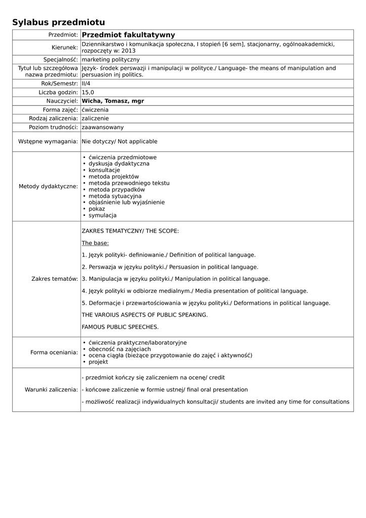 Sylabus przedmiotu Przedmiot: Przedmiot fakultatywny Dziennikarstwo i komunikacja społeczna, I stopień [6 sem], stacjonarny, ogólnoakademicki, Kierunek: rozpoczęty w: 2013 Specjalność: marketing polityczny Tytuł lub szczegółowa Język- środek perswazji i manipulacji w polityce./ Language- the means of manipulation and nazwa przedmiotu: persuasion inj politics. Rok/Semestr: II/4 Liczba godzin: 15,0 Nauczyciel: Wicha, Tomasz, mgr Forma zajęć: ćwiczenia Rodzaj zaliczenia: zaliczenie Poziom trudności: zaawansowany Wstępne wymagania: Nie dotyczy/ Not applicable • • • • • Metody dydaktyczne: • • • • • ćwiczenia przedmiotowe dyskusja dydaktyczna konsultacje metoda projektów metoda przewodniego tekstu metoda przypadków metoda sytuacyjna objaśnienie lub wyjaśnienie pokaz symulacja ZAKRES TEMATYCZNY/ THE SCOPE: The base: 1. Język polityki- definiowanie./ Definition of political language. 2. Perswazja w języku polityki./ Persuasion in political language. Zakres tematów: 3. Manipulacja w języku polityki./ Manipulation in political language. 4. Język polityki w odbiorze medialnym./ Media presentation of political language. 5. Deformacje i przewartościowania w języku polityki./ Deformations in political language. THE VAROIUS ASPECTS OF PUBLIC SPEAKING. FAMOUS PUBLIC SPEECHES. • • Forma oceniania: • • ćwiczenia praktyczne/laboratoryjne obecność na zajęciach ocena ciągła (bieżące przygotowanie do zajęć i aktywność) projekt - przedmiot kończy się zaliczeniem na ocenę/ credit Warunki zaliczenia: - końcowe zaliczenie w formie ustnej/ final oral presentation - możliwość realizacji indywidualnych konsultacji/ students are invited any time for consultations Literature in Polish: 1. P. Francuz, Rozumienie przekazu telewizyjnego. Psychologiczne badania telewizyjnych programów informacyjnych, Lublin 2002. 2. J. Fras, Dziennikarski warsztat językowy, Wrocław 1999. 3. J. Fras, Komunikacja polityczna. Wybrane zagadnienia gatunków i języka wypowiedzi, Wrocław 2006. 4. T. Goban-Klas, Media i komunikowanie masowe, Teorie i analizy prasy, radia, telewizji i Internetu, Warszawa 2004. Literatura: 5. W. Godzic, Telewizja i jej gatunki po „Wielkim bracie”, Kraków 2004. 6. I. Kamińska-Szmaj, Propaganda, perswazja, manipulacja – próba uporządkowania pojęć , [w:] Manipulacja w języku, red. P. Krzyżanowski i P. Nowak, Lublin 2004. 7. T. Piekot, Dyskurs polskich wiadomości prasowych, Kraków 2006. 8. J. Puzynina, Język wartości, Warszawa 1992. 9. W. Sikorski, Gesty zamiast słów. Psychologia i trening komunikacji niewerbalnej , Kraków 2005. Materials in English- Internet sources chosen by the teacher; on -line sources; Dodatkowe informacje: e-mail: [email protected]