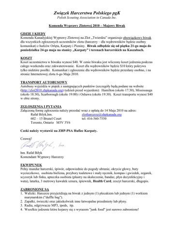 Związek Harcerstwa Polskiego pgK Polish Scouting Association in Canada Inc. Komenda Wyprawy Zlotowej 2010 – Majowy Biwak GDZIE I KIEDY Komenda Kanadyjskiej Wyprawy Zlotowej na Zlot „Twierdza” organizuje obowiązkowy biwak dla wszystkich zgłoszonych uczestników zlotu (harcerzy – dla wędrowników będzie osobny komunikat) z hufców Orlęta, Karpaty i Pieniny. Biwak odbędzie się od piątku 21-go maja do poniedziałku 24-go maja na stanicy „Karpaty” i terenach harcerskich na Kaszubach. KOSZT Koszt uczestnictwa w biwaku wynosi $40. W cenie biwaku jest wliczony koszt jedzenia podczas całego weekendu oraz zakwaterowanie. Koszt dla wędrowników będzie $10 który pokrywa tylko niektóre posiłki. Komunikat i zgłoszenie dla wędrowników będzie przesłany osobno, i na stronie Internetowej zlotu 6-go Maja 2010. TRA3SPORT AUTOBUSOWY Autobusy wyjeżdża w piątek z następujących punktów (szczegóły będą podane na website (http://zlot2010.zhpkanada.org) tydzień przed wyjazdem): Hamilton (około 17:30), Mississauga (około 18:30), Scarborough (około 19:00) i Oshawa (około 19:30). Koszt transportu wynosi $40 w obie strony. ZGŁOSZE3IA I PYTA3IA Załączoną formę zgłoszenia należy przesłać wraz z opłatą do 14 Maja 2010 na adres: [email protected] Rafał Bilyk,hm. 602 – 15 Brunel Court tel: 416-560-7550 Toronto, Ontario M5V 3Y6 Czeki należy wystawić na ZHP-PSA Hufiec Karpaty. Czuwaj! hm. Rafał Biłyk Komendant Wyprawy Harcerzy EKWIPU3EK Pełny mundur harcerski, śpiwór, odpowiednie do pogody ubranie, okrycie głowy, buty wycieczkowe, osobista bielizna, przybory toaletowe i mały ręcznik, kompas i gwizdek, zegarek, scyzoryk lub finka, apteczka osobista (plastry na skaleczenie, bandaz, płyn dezynfekcyjny i wata), latarka, 3 metrowy kawałek sznura, śpiewnik, Health Card, zeszyt harcerski, długopis. ZABRO3IO3E SĄ 1. Walizki. Harcerze przyjeżdżają na biwak z jednym (1) plecakiem lub jednym (1) workiem marynarskim ("duffle bag"). 2. Zapałki, świeczki oraz jakiekolwiek inne łatwopalne przedmioty lub płyny. 3. Radia, odgrywacze MP3, ipods, itp. 4. Wszelkie jedzenie które kojarzy się z wyrazem "junk food" jest surowo zabronione! ZGŁOSZE3IE (tylko dla harcerzy, dla wędrowników będzie osobne) Majowy Biwak 2010 Nazwisko i Imię Uczestnika _____________________________________________________ Telefon ________________________ Data Urodzenia ______________________ Adres ________________________________________________________________________ Health Card Number _____________________________ W razie wypadku zawiadomić: ___________________________________________________ Uczulenia, ograniczenia medyczne i dietetyczne (wyszczególnić) _________________________ _____________________________________________________________________________ Transport autobusowy _____ TAK _____ NIE Punkt odbioru i powrotu: _____ Hamilton _____ Mississauga _____ Scarborough _____ Oshawa Opłata załączona $ ________ (transport $40; biwak $40) Zezwalam mojemu synowi _______________ na udział w biwaku przygotowawczym na Zlot od 21-go do 24-go maja, 2010, na Kaszubach. Stwierdzam ze syn może brać udział we wszystkich zajęciach oprócz tego co wyszczególniłem/am powyżej. Zobowiązuje się nie wnosić żądań ani nie wszczynać żadnych akcji prawnych przeciwko komendzie, obsadzie ani Polish Scouting Association w wypadku uszkodzeń poniesionych przez moje dziecko podczas wyprawy. I authorize Polish Scouting Association leaders to obtain emergency medical treatment for my son if necessary. ____________________ data _____________________ podpis rodzica ______________________ imię i nazwisko (drukiem)