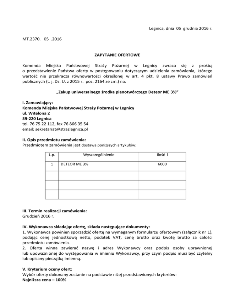 Legnica, dnia 05 grudnia 2016 r. MT.2370. 05 .2016 ZAPYTANIE