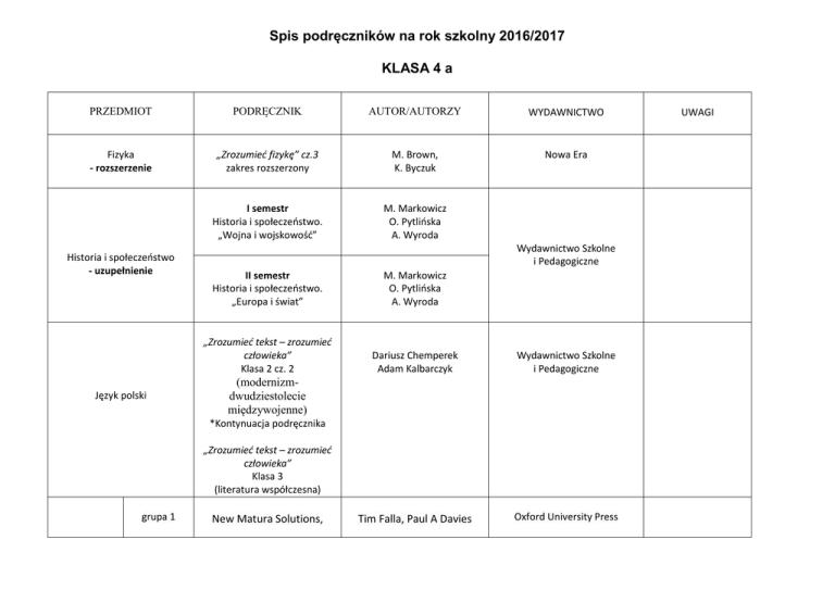 Spis podręczników na rok szkolny 2016/2017 KLASA 4 a PRZEDMIOT PODRĘCZNIK AUTOR/AUTORZY WYDAWNICTWO Fizyka - rozszerzenie „Zrozumieć fizykę” cz.3 zakres rozszerzony M. Brown, K. Byczuk Nowa Era I semestr Historia i społeczeństwo. „Wojna i wojskowość” M. Markowicz O. Pytlińska A. Wyroda Historia i społeczeństwo - uzupełnienie Język polski Wydawnictwo Szkolne i Pedagogiczne II semestr Historia i społeczeństwo. „Europa i świat” M. Markowicz O. Pytlińska A. Wyroda „Zrozumieć tekst – zrozumieć człowieka” Klasa 2 cz. 2 Dariusz Chemperek Adam Kalbarczyk Wydawnictwo Szkolne i Pedagogiczne Tim Falla, Paul A Davies Oxford University Press (modernizmdwudziestolecie międzywojenne) *Kontynuacja podręcznika „Zrozumieć tekst – zrozumieć człowieka” Klasa 3 (literatura współczesna) grupa 1 New Matura Solutions, UWAGI Język angielski Upper – intermediate grupa 2 Język angielski zawodowy Matematyka - rozszerzenie Oxford Matura Trainer – poziom podstawowy Gregory J. Manin, Danuta Gryca Oxford University Press Bussiness Result – preintermediate D. Grant Oxford University Press „Prosto do matury 3” podręcznik do matematyki dla szkól ponadgimnazjalnych Zakres podstawowy i rozszerzony Maciej Antek Krzysztof Belka Piotr Grabowski Nowa Era Pracownia rachunkowości i analizy finansowej Zakup podręcznika na początku roku szkolnego po uzgodnieniu z nauczycielem. Rachunkowość i analiza finansowa Zakup podręcznika na początku roku szkolnego po uzgodnieniu z nauczycielem. Spis podręczników na rok szkolny 2016/2017 KLASA 4 b PRZEDMIOT PODRĘCZNIK Geografia - rozszerzenie kontynuacja Oblicza geografii 2 – zakres rozszerzony AUTOR/AUTORZY WYDAWNICTWO Nowa Era R. Malarz, M. Więckowski Oblicza geografii 3 - zakres rozszerzony Historia i społeczeństwo - uzupełnienie Maturalne karty pracy Oblicza geografii 3, zakres rozszerzony M. Kupczyk I semestr Historia i społeczeństwo. „ Wojna i wojskowość” M. Markowicz O. Pytlińska A. Wyroda Wydawnictwo Szkolne i Pedagogiczne II semestr Historia i społeczeństwo. „Europa i świat” „Zrozumieć tekst – zrozumieć człowieka” Klasa 2 cz. 2 Język polski (modernizmdwudziestolecie międzywojenne) *Kontynuacja podręcznika M. Markowicz O. Pytlińska A. Wyroda Dariusz Chemperek Adam Kalbarczyk Wydawnictwo Szkolne i Pedagogiczne UWAGI „Zrozumieć tekst – zrozumieć człowieka” Klasa 3 (literatura współczesna) grupa 1 (podst. i rozszerz) Matura 2015 Repetytorium; poziom podstawowy i rozszerzony Marta Rosińska, Lynda Edwards Macmillan grupa 2 (podst. i rozszerz) New Matura Explorer 4 H. Dummett Nowa Era Bussiness result – pre-intermediate D. Grant Oxford University Press Język angielski zawodowy Maciej Antek Krzysztof Belka Piotr Grabowski Nowa Era Matematyka „Prosto do matury 3” podręcznik do matematyki dla szkól ponadgimnazjalnych Zakres podstawowy Język angielski Pracownia rachunkowości i analizy finansowej Zakup podręcznika na początku roku szkolnego po uzgodnieniu z nauczycielem. Rachunkowość i analiza finansowa Zakup podręcznika na początku roku szkolnego po uzgodnieniu z nauczycielem. Spis podręczników na rok szkolny 2016/2017 KLASA 4 c PRZEDMIOT Geografia - rozszerzenie Historia i społeczeństwo - uzupełnienie PODRĘCZNIK AUTOR/AUTORZY kontynuacja Oblicza geografii 2 – zakres rozszerzony R. Malarz, M. Więckowski Oblicza geografii 3 - zakres rozszerzony WYDAWNICTWO Nowa Era Maturalne karty pracy Oblicza geografii 3, zakres rozszerzony M. Kupczyk I semestr Historia i społeczeństwo. „Wojna i wojskowość” M. Markowicz O. Pytlińska A. Wyroda Wydawnictwo Szkolne i Pedagogiczne II semestr Historia i społeczeństwo. „Europa i świat” M. Markowicz O. Pytlińska A. Wyroda „Zrozumieć tekst – zrozumieć człowieka” Klasa 2 cz. 2 Dariusz Chemperek Adam Kalbarczyk Wydawnictwo Szkolne i Pedagogiczne UWAGI Język polski (modernizmdwudziestolecie międzywojenne) *Kontynuacja podręcznika „Zrozumieć tekst – zrozumieć człowieka” Klasa 3 (literatura współczesna) grupa 1 Repetytorium – Matura 2015, poziom podstawowy i rozszerzony. M. Rosińska, L. Edwards Macmillan grupa 2 New Matura Solutions, intermediate Tim Falla, Paul A Davies Oxford University Press Bussiness result – pre-intermediate D. Grant Oxford University Press „Prosto do matury 3” podręcznik do matematyki dla szkól ponadgimnazjalnych Zakres podstawowy Maciej Antek Krzysztof Belka Piotr Grabowski Nowa Era Język angielski Język obcy zawodowy Matematyka Pracownia rachunkowości i analizy finansowej Zakup podręcznika na początku roku szkolnego po uzgodnieniu z nauczycielem. Rachunkowość i analiza finansowa Zakup podręcznika na początku roku szkolnego po uzgodnieniu z nauczycielem. Wiedza o społeczeństwie – rozszerzenie Teraz matura 2016 Vademecum maturalne z wiedzy o społeczeństwie Arkadiusz Janicki, Justyna Kięczkowska, Michał Drgas Nowa Era Spis podręczników na rok szkolny 2015/2016 KLASA 4 d PRZEDMIOT PODRĘCZNIK AUTOR/AUTORZY Geografia - rozszerzenie kontynuacja Oblicza geografii 2 – zakres rozszerzony R. Malarz, M. Więckowski WYDAWNICTWO Nowa Era Oblicza geografii 3 - zakres rozszerzony Maturalne karty pracy Oblicza geografii 3, zakres rozszerzony I semestr Historia i społeczeństwo. „Wojna i wojskowość” Historia i społeczeństwo uzupełnienie Język polski M. Kupczyk M. Markowicz O. Pytlińska A. Wyroda Wydawnictwo Szkolne i Pedagogiczne II semestr Historia i społeczeństwo. "Europa i świat” M. Markowicz O. Pytlińska A. Wyroda „Zrozumieć tekst – zrozumieć człowieka” Klasa 2 cz. 2 Dariusz Chemperek Adam Kalbarczyk (modernizmdwudziestolecie międzywojenne) *Kontynuacja podręcznika Wydawnictwo Szkolne i Pedagogiczne UWAGI „Zrozumieć tekst – zrozumieć człowieka” Klasa 3 (literatura współczesna) grupa 1 New Matura Solution upper -intermediate T. Falla, P. Davies Longman Repetytorium maturalne - poziom podstawowy M. Umińska,