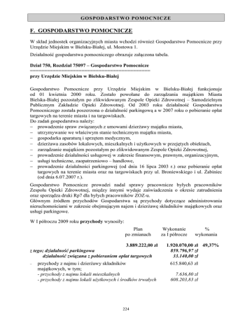 GOSPODARSTWO POMOCNICZE F. GOSPODARSTWO POMOCNICZE W skład jednostek organizacyjnych miasta wchodzi równieŜ Gospodarstwo Pomocnicze przy Urzędzie Miejskim w Bielsku-Białej, ul. Mostowa 1. Działalność gospodarstwa pomocniczego obrazuje załączona tabela. Dział 750, Rozdział 75097 – Gospodarstwo Pomocnicze ========================================== przy Urzędzie Miejskim w Bielsku-Białej Gospodarstwo Pomocnicze przy Urzędzie Miejskim w Bielsku-Białej funkcjonuje od 01 kwietnia 2000 roku. Zostało powołane do zarządzania majątkiem Miasta Bielska-Białej pozostałym po zlikwidowanym Zespole Opieki Zdrowotnej – Samodzielnym Publicznym Zakładzie Opieki Zdrowotnej. Od 2003 roku działalność Gospodarstwa Pomocniczego została poszerzona o działalność parkingową a w 2007 roku o pobieranie opłat targowych na terenie miasta i na targowiskach. Do zadań gospodarstwa naleŜy: − prowadzenie spraw związanych z umowami dzierŜawy majątku miasta, − utrzymywanie we właściwym stanie technicznym majątku miasta, − gospodarka aparaturą i sprzętem medycznym, − dzierŜawa zasobów lokalowych, mieszkalnych i uŜytkowych w przejętych obiektach, − zarządzanie majątkiem pozostałym po zlikwidowanym Zespole Opieki Zdrowotnej, − prowadzenie działalności usługowej w zakresie finansowym, prawnym, organizacyjnym, − usługi techniczne, zaopatrzeniowo – handlowe, − prowadzenie działalności parkingowej (od dnia 16 lipca 2003 r.) oraz pobieranie opłat targowych na terenie miasta oraz na targowiskach przy ul. Broniewskiego i ul. śabiniec (od dnia 6.07.2007 r.). Gospodarstwo Pomocnicze prowadzi nadal sprawy pracownicze byłych pracowników Zespołu Opieki Zdrowotnej, między innymi wydaje zaświadczenia o okresie zatrudnienia oraz sporządza druki Rp7 dla byłych pracowników ZOZ-u. Głównym źródłem przychodów Gospodarstwa są przychody dotyczące administrowania nieruchomościami w zakresie obejmującym najem i dzierŜawę składników majątkowych oraz usługi parkingowe. W I półroczu 2009 roku przychody wynosiły: Plan po zmianach 3.889.222,00 zł z tego; działalność parkingowa działalność związana z pobieraniem opłat targowych − przychody z najmu i dzierŜawy składników majątkowych, w tym; - przychody z najmu lokali mieszkalnych - przychody z najmu lokali uŜytkowych i środków trwałych 224 Wykonanie za I półrocze % wykonania 1.920.070,00 zł 49,37% 859.796,97 zł 33.140,00 zł 615.840,63 zł 7.636,80 zł 608.203,83 zł GOSPODARSTWO POMOCNICZE − wpływy z usług, w tym; - usługi parkingowe - prowizja od pobranych opłat targowych - pozostałe usługi (refakturowanie kosztów energii, wywozu nieczystości, dozoru, podatku od nieruchomości i inne) − pozostałe przychody (odsetki, pokrycie amortyzacji i inne) w tym; działalność parkingowa Koszty i inne obciąŜenia w kwocie 3.889.222,00 zł z tego; działalność parkingowa działalność związana z pobieraniem opłat targowych dotyczyły: − − wynagrodzeń i pochodnych od wynagrodzeń, w tym; działalność parkingowa działalność związana z pobieraniem opłat targowych 1.264.288,91 zł 858.737,79 zł 33.140,00 zł 372.411,12 zł 39.940,46 zł 1.059,18 zł 1.748.538,06 zł 44,96 % 762.642,85 zł 27.991,17 zł 864.003,23 zł 661.735,58 zł 24.217,77 zł usług remontowych, w tym; 229.142,01 zł 1.245,00 zł działalność parkingowa z tego: 5.977,49 zł - naprawa środków trwałych i wyposaŜenia, w tym; naprawa i konserwacja kas fiskalnych i wyposaŜenia, działalność parkingowa 1.245,00 zł - remonty budynków, przeglądy okresowe i usuwanie 223.164,52zł awarii, z tego: − ul. Komorowicka 23 – roboty elektryczne, roboty 10.567,07 zł blacharsko - dekarskie, konserwacja dźwigu, naprawa drzwi, usunięcie awarii kanalizacji − ul. Górska 133 – dozór techniczny i konserwacja dźwigu 1.438,10 zł − ul. Ikara 6 – roboty elektryczne, wymiana stolarki okiennej i luksferów klatki schodowej, remont posadzki, malowanie klatki schodowej − ul. Staszica 1 – wymiana izolacji i naprawa tynków, roboty dekarsko – blacharskie 5.548,71 zł − ul. Reymonta 5 – roboty elektryczne 1.576,00 zł − ul. Krasińskiego 30 – dozór techniczny i konserwacja 9.770,85 zł dźwigu, wymiana bramki w ogrodzeniu oraz wymiana nawierzchni chodnika do windy, usunięcie awarii kanalizacji − ul. Wiśniowa 7 – roboty elektryczne, usunięcie awarii kanalizacji, rozbiórka przybudówki wraz ze schodami zewnętrznymi oraz naprawa elewacji budynku po dokonaniu robót rozbiórkowych, przebudowa ścian śmietnika z wykonaniem nowej konstrukcji stalowej przykrywającej śmietnik − ul. Poniatowskiego 28 - usunięcie awarii kanalizacji, roboty elektryczne 225 36.354,45 zł 31.591,28 zł 2.972,11 zł GOSPODARSTWO POMOCNICZE − − ul. Powstańców Śląskich 8 – roboty elektryczne, wymiana stolarki okiennej na okna z PCV, wykonanie ekspertyzy technicznej ścian konstrukcyjnych budynku, usunięcie awarii kanalizacji 30.422,63 zł − ul. Podgórna 13 – naprawa tynków cokołu budynków, usunięcie awarii kanalizacji 8.945,41 zł − ul. Mostowa 1 – roboty elektryczne, przegląd pieca gazowego, dozór techniczny kotłowni, usunięcie awarii kanalizacji, częściowa wymiana stolarki okiennej drewnianej na PCV- 19.230,56 zł 22.642,44 zł − ul. Olszówka 2 – roboty dekarskie- blacharskie − ul. Legionów 9 – usunięcie awarii kanalizacji 4.589,09 zł − ul. Asnyka 14 – wykonanie włazu dachowego 1.657,42 zł − ul. Ikara 7 – malowanie elewacji, remont kominów i murów ogniowych 24.994,52 zł − wszystkie obiekty – przeglądy okresowe przewodów dymnych i wentylacyjnych, obsługa kotłów gazowych, wymiennikowni oraz instalacji wewnętrznych centralnego ogrzewania, ciepłej i zimnej wody w okresie grzewczym. 29.896,50 zł wydatków bieŜących i innych obciąŜeń, w szczególności; zakupu środków czystości, materiałów biurowych, gaśnic, odzieŜy ochronnej i 