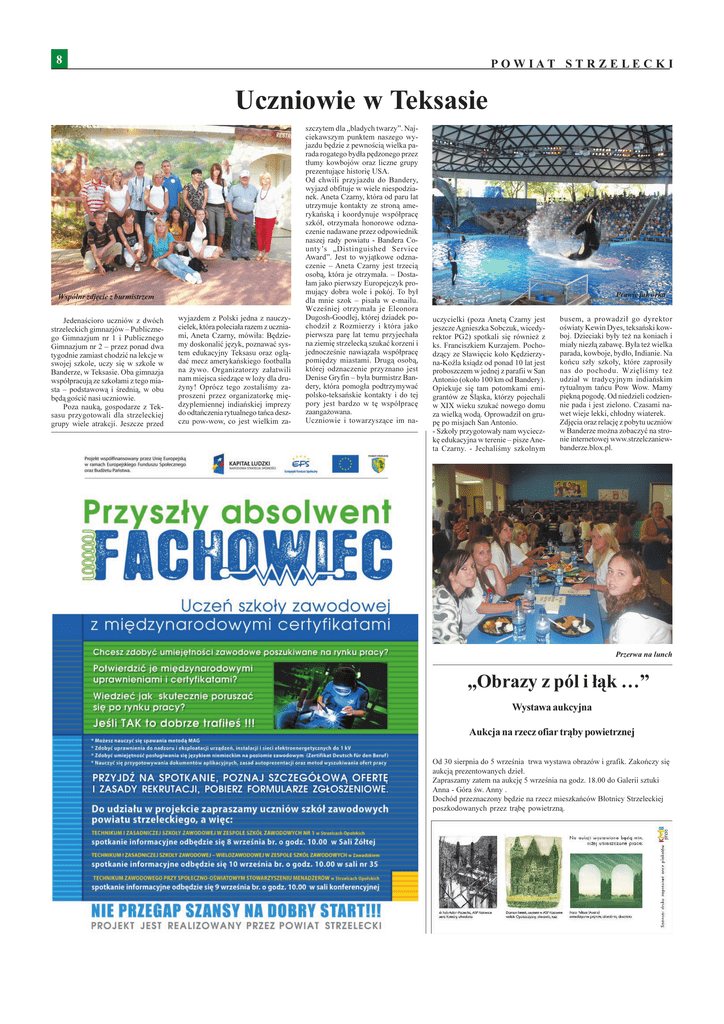 8 POWIAT STR Z E LE C K I Uczniowie w Teksasie Wspólnr zdjêcie z burmistrzem Jedenacioro uczniów z dwóch strzeleckich gimnazjów Publicznego Gimnazjum nr 1 i Publicznego Gimnazjum nr 2 przez ponad dwa tygodnie zamiast chodziæ na lekcje w swojej szkole, uczy siê w szkole w Banderze, w Teksasie. Oba gimnazja wspó³pracuj¹ ze szko³ami z tego miasta podstawow¹ i redni¹, w obu bêd¹ gociæ nasi uczniowie. Poza nauk¹, gospodarze z Teksasu przygotowali dla strzeleckiej grupy wiele atrakcji. Jeszcze przed wyjazdem z Polski jedna z nauczycielek, która polecia³a razem z uczniami, Aneta Czarny, mówi³a: Bêdziemy doskonaliæ jêzyk, poznawaæ system edukacyjny Teksasu oraz ogl¹daæ mecz amerykañskiego footballa na ¿ywo. Organizatorzy za³atwili nam miejsca siedz¹ce w lo¿y dla dru¿yny! Oprócz tego zostalimy zaproszeni przez organizatorkê miêdzyplemiennej indiañskiej imprezy do odtañczenia rytualnego tañca deszczu pow-wow, co jest wielkim za- szczytem dla bladych twarzy. Najciekawszym punktem naszego wyjazdu bêdzie z pewnoci¹ wielka parada rogatego byd³a pêdzonego przez t³umy kowbojów oraz liczne grupy prezentuj¹ce historiê USA. Od chwili przyjazdu do Bandery, wyjazd obfituje w wiele niespodzianek. Aneta Czarny, która od paru lat utrzymuje kontakty ze stron¹ amerykañsk¹ i koordynuje wspó³pracê szkó³, otrzyma³a honorowe odznaczenie nadawane przez odpowiednik naszej rady powiatu - Bandera Countys Distinguished Service Award. Jest to wyj¹tkowe odznaczenie Aneta Czarny jest trzeci¹ osob¹, która je otrzyma³a. Dosta³am jako pierwszy Europejczyk promuj¹cy dobra wole i pokój. To by³ dla mnie szok pisa³a w e-mailu. Wczeniej otrzyma³a je Eleonora Dugosh-Goodlej, której dziadek pochodzi³ z Rozmierzy i która jako pierwsza parê lat temu przyjecha³a na ziemiê strzeleck¹ szukaæ korzeni i jednoczenie nawi¹za³a wspó³pracê pomiêdzy miastami. Drug¹ osob¹, której odznaczenie przyznano jest Denise Gryfin by³a burmistrz Bandery, która pomog³a podtrzymywaæ polsko-teksañskie kontakty i do tej pory jest bardzo w tê wspó³pracê zaanga¿owana. Uczniowie i towarzysz¹ce im na- Prawie jak orka uczycielki (poza Anet¹ Czarny jest jeszcze Agnieszka Sobczuk, wicedyrektor PG2) spotkali siê równie¿ z ks. Franciszkiem Kurzajem. Pochodz¹cy ze S³awiêcic ko³o Kêdzierzyna-Kola ksi¹dz od ponad 10 lat jest proboszczem w jednej z parafii w San Antonio (oko³o 100 km od Bandery). Opiekuje siê tam potomkami emigrantów ze l¹ska, którzy pojechali w XIX wieku szukaæ nowego domu za wielk¹ wod¹. Oprowadzi³ on grupê po misjach San Antonio. - Szko³y przygotowa³y nam wycieczkê edukacyjna w terenie pisze Aneta Czarny. - Jechalimy szkolnym busem, a prowadzi³ go dyrektor owiaty Kewin Dyes, teksañski kowboj. Dzieciaki by³y te¿ na koniach i mia³y niez³¹ zabawê. By³a te¿ wielka parada, kowboje, byd³o, Indianie. Na koñcu sz³y szko³y, które zaprosi³y nas do pochodu. Wziêlimy te¿ udzia³ w tradycyjnym indiañskim rytualnym tañcu Pow Wow. Mamy piêkn¹ pogodê. Od niedzieli codziennie pada i jest zielono. Czasami nawet wieje lekki, ch³odny wiaterek. Zdjêcia oraz relacjê z pobytu uczniów w Banderze mo¿na zobaczyæ na stronie internetowej www.strzelczaniewbanderze.blox.pl. Przerwa na lunch Obrazy z pól i ³¹k Wystawa aukcyjna Aukcja na rzecz ofiar tr¹by powietrznej Od 30 sierpnia do 5 wrzenia trwa wystawa obrazów i grafik. Zakoñczy siê aukcj¹ prezentowanych dzie³. Zapraszamy zatem na aukcjê 5 wrzenia na godz. 18.00 do Galerii sztuki Anna - Góra w. Anny . Dochód przeznaczony bêdzie na rzecz mieszkañców B³otnicy Strzeleckiej poszkodowanych przez tr¹bê powietrzn¹.