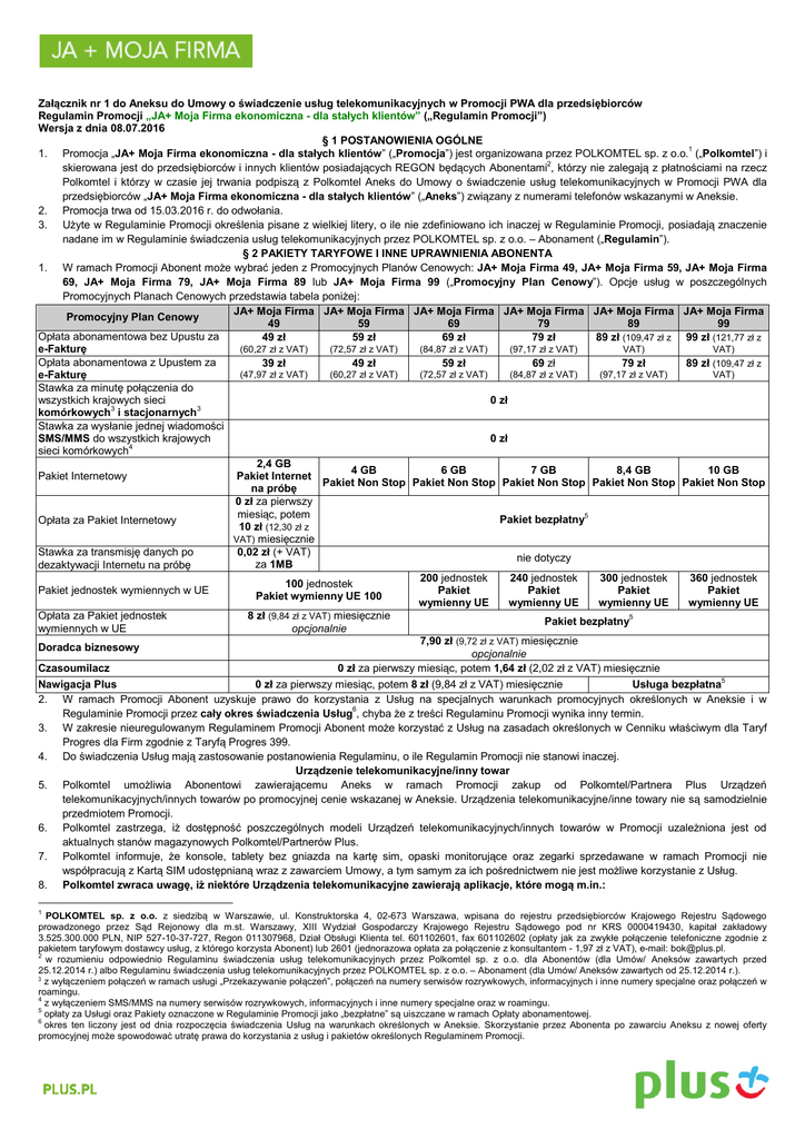 Załącznik nr 1 do Aneksu do Umowy o świadczenie usług telekomunikacyjnych w Promocji PWA dla przedsiębiorców Regulamin Promocji „JA+ Moja Firma ekonomiczna - dla stałych klientów” („Regulamin Promocji”) Wersja z dnia 08.07.2016 § 1 POSTANOWIENIA OGÓLNE 1. Promocja „JA+ Moja Firma ekonomiczna - dla stałych klientów” („Promocja”) jest organizowana przez POLKOMTEL sp. z o.o.1 („Polkomtel”) i skierowana jest do przedsiębiorców i innych klientów posiadających REGON będących Abonentami2, którzy nie zalegają z płatnościami na rzecz Polkomtel i którzy w czasie jej trwania podpiszą z Polkomtel Aneks do Umowy o świadczenie usług telekomunikacyjnych w Promocji PWA dla przedsiębiorców „JA+ Moja Firma ekonomiczna - dla stałych klientów” („Aneks”) związany z numerami telefonów wskazanymi w Aneksie. 2. Promocja trwa od 15.03.2016 r. do odwołania. 3. Użyte w Regulaminie Promocji określenia pisane z wielkiej litery, o ile nie zdefiniowano ich inaczej w Regulaminie Promocji, posiadają znaczenie nadane im w Regulaminie świadczenia usług telekomunikacyjnych przez POLKOMTEL sp. z o.o. – Abonament („Regulamin”). § 2 PAKIETY TARYFOWE I INNE UPRAWNIENIA ABONENTA 1. W ramach Promocji Abonent może wybrać jeden z Promocyjnych Planów Cenowych: JA+ Moja Firma 49, JA+ Moja Firma 59, JA+ Moja Firma 69, JA+ Moja Firma 79, JA+ Moja Firma 89 lub JA+ Moja Firma 99 („Promocyjny Plan Cenowy”). Opcje usług w poszczególnych Promocyjnych Planach Cenowych przedstawia tabela poniżej: JA+ Moja Firma JA+ Moja Firma JA+ Moja Firma JA+ Moja Firma JA+ Moja Firma JA+ Moja Firma Promocyjny Plan Cenowy 49 59 69 79 89 99 Opłata abonamentowa bez Upustu za 49 zł 59 zł 69 zł 79 zł 89 zł (109,47 zł z 99 zł (121,77 zł z (60,27 zł z VAT) (72,57 zł z VAT) (84,87 zł z VAT) (97,17 zł z VAT) VAT) VAT) e-Fakturę Opłata abonamentowa z Upustem za 39 zł 49 zł 59 zł 69 zł 79 zł 89 zł (109,47 zł z (47,97 zł z VAT) (60,27 zł z VAT) (72,57 zł z VAT) (84,87 zł z VAT) (97,17 zł z VAT) VAT) e-Fakturę Stawka za minutę połączenia do 0 zł wszystkich krajowych sieci komórkowych3 i stacjonarnych3 Stawka za wysłanie jednej wiadomości SMS/MMS do wszystkich krajowych 0 zł sieci komórkowych4 2,4 GB 4 GB 6 GB 7 GB 8,4 GB 10 GB Pakiet Internet Pakiet Internetowy Pakiet Non Stop Pakiet Non Stop Pakiet Non Stop Pakiet Non Stop Pakiet Non Stop na próbę 0 zł za pierwszy miesiąc, potem Pakiet bezpłatny5 Opłata za Pakiet Internetowy 10 zł (12,30 zł z VAT) miesięcznie 0,02 zł (+ VAT) Stawka za transmisję danych po nie dotyczy za 1MB dezaktywacji Internetu na próbę 200 jednostek 240 jednostek 300 jednostek 360 jednostek 100 jednostek Pakiet Pakiet Pakiet Pakiet Pakiet jednostek wymiennych w UE Pakiet wymienny UE 100 wymienny UE wymienny UE wymienny UE wymienny UE 8 zł (9,84 zł z VAT) miesięcznie Opłata za Pakiet jednostek Pakiet bezpłatny5 wymiennych w UE opcjonalnie 7,90 zł (9,72 zł z VAT) miesięcznie Doradca biznesowy opcjonalnie Czasoumilacz 0 zł za pierwszy miesiąc, potem 1,64 zł (2,02 zł z VAT) miesięcznie Nawigacja Plus 0 zł za pierwszy miesiąc, potem 8 zł (9,84 zł z VAT) miesięcznie Usługa bezpłatna5 2. W ramach Promocji Abonent uzyskuje prawo do korzystania z Usług na specjalnych warunkach promocyjnych określonych w Aneksie i w Regulaminie Promocji przez cały okres świadczenia Usług6, chyba że z treści Regulaminu Promocji wynika inny termin. 3. W zakresie nieuregulowanym Regulaminem Promocji Abonent może korzystać z Usług na zasadach określonych w Cenniku właściwym dla Taryf Progres dla Firm zgodnie z Taryfą Progres 399. 4. Do świadczenia Usług mają zastosowanie postanowienia Regulaminu, o ile Regulamin Promocji nie stanowi inaczej. Urządzenie telekomunikacyjne/inny towar 5. Polkomtel umożliwia Abonentowi zawierającemu Aneks w ramach Promocji zakup od Polkomtel/Partnera Plus Urządzeń telekomunikacyjnych/innych towarów po promocyjnej cenie wskazanej w Aneksie. Urządzenia telekomunikacyjne/inne towary nie są samodzielnie przedmiotem Promocji. 6. Polkomtel zastrzega, iż dostępność poszczególnych modeli Urządzeń telekomunikacyjnych/innych towarów w Promocji uzależniona jest od aktualnych stanów magazynowych Polkomtel/Partnerów Plus. 7. Polkomtel informuje, że konsole, tablety bez gniazda na kartę sim, opaski monitorujące oraz zegarki sprzedawane w ramach Promocji nie współpracują z Kartą SIM udostępnianą wraz z zawarciem Umowy, a tym samym za ich pośrednictwem nie jest możliwe korzystanie z Usług. 8. Polkomtel zwraca uwagę, iż niektóre Urządzenia telekomunikacyjne zawierają aplikacje, które mogą m.in.: 1 POLKOMTEL sp. z o.o. z siedzibą w Warszawie, ul. Konstruktorska 4, 02-673 Warszawa, wpisana do rejestru przedsiębiorców Krajowego Rejestru Sądowego prowadzonego przez Sąd Rejonowy dla m.st. Warszawy, XIII Wydział Gospodarczy Krajowego Rejestru Sądowego pod nr KRS 0000419430, kapitał zakładowy 3.525.300.000 PLN, NIP 527-10-37-727, Regon 011307968, Dział Obsługi Klienta tel. 601102601, fax 601102602 (opłaty jak za zwykłe połączenie telefoniczne zgodnie z pakietem taryfowym dostawcy usług, z którego korzysta Abonent) lub 2601 (jednorazowa opłata za połączenie z konsultantem - 1,97 zł z VAT), e-mail: [email protected]. 2 w rozumieniu odpowiednio Regulaminu świadczenia usług telekomunikacyjnych przez Polkomtel sp. z o.o. dla Abonentów (dla Umów/ Aneksów zawartych przed 25.12.2014 r.) albo Regulaminu świadczenia usług telekomunikacyjnych przez POLKOMTEL sp. z o.o. – Abonament (dla Umów/ Aneksów zawartych od 25.12.2014 r.). 3 z wyłączeniem połączeń w ramach usługi „Przekazywanie połączeń”, połączeń na numery serwisów rozrywkowych, informacyjnych i inne numery specjalne oraz połączeń w roamingu. 4 z wyłączeniem SMS/MMS na numery serwisów rozrywkowych, informacyjnych i inne numery specjalne oraz w roamingu. 5 opłaty za Us