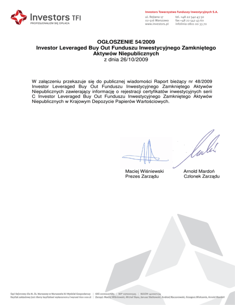 OGŁOSZENIE 54/2009 Investor Leveraged Buy Out Funduszu Inwestycyjnego Zamkniętego Aktywów Niepublicznych z dnia 26/10/2009 W załączeniu przekazuje się do publicznej wiadomości Raport bieżący nr 48/2009 Investor Leveraged Buy Out Funduszu Inwestycyjnego Zamkniętego Aktywów Niepublicznych zawierający informację o rejestracji certyfikatów inwestycyjnych serii C Investor Leveraged Buy Out Funduszu Inwestycyjnego Zamkniętego Aktywów Niepublicznych w Krajowym Depozycie Papierów Wartościowych. Maciej Wiśniewski Prezes Zarządu Arnold Mardoń Członek Zarządu INVESTOR LEVERAGED BUY OUT FIZ AKTYWÓW NIEPUBL. RB_FI_E 48 2009 korekta KOMISJANADZORUFINANSOWEGO Raport bieżący funduszu inwestycyjnego nr 48 / 2009 (numer kolejny raportu / rok) Data przekazania: 2009-10-26 Nazwa podmiotu: INVESTOR LEVERAGED BUY OUT FUNDUSZ INWESTYCYJNY ZAMKNIĘTY AKTYWÓ Temat raportu: Rejestracja c ertyfikatów inwestycyjnyc h Investor Leveraged Buy Out Funduszu Inwestycyjnego Zamkniętego Aktywów Niepublicznyc h w Krajowym Depozyc ie Papierów Wartośc iowych Podstawa prawna § 34 ust. 1 pkt. 1 oie - rejestracja pap. wart. w KDPW WIADOMOŚĆ Informujemy, że w dniu 26 października 2009 r. w Krajowym Depozycie Papierów Wartościowych nastąpiła rejestracja 739 certyfikatów inwestycyjnych serii C Investor Leveraged Buy Out Funduszu Inwestycyjnego Zamkniętego Aktywów Niepublicznych oznaczonych kodem PLINVLB00062. Plik Opis PODPISYOSÓBREPREZENTUJĄCYCHPODMIOT Data Imię i Nazwisko Stanowisko/Funkc ja 2009-10-26 Maciej Wiśniewski Prezes Zarządu 2009-10-26 Beata Sax Członek Zarządu Podpis Komisja Nadzoru Finansowego 1