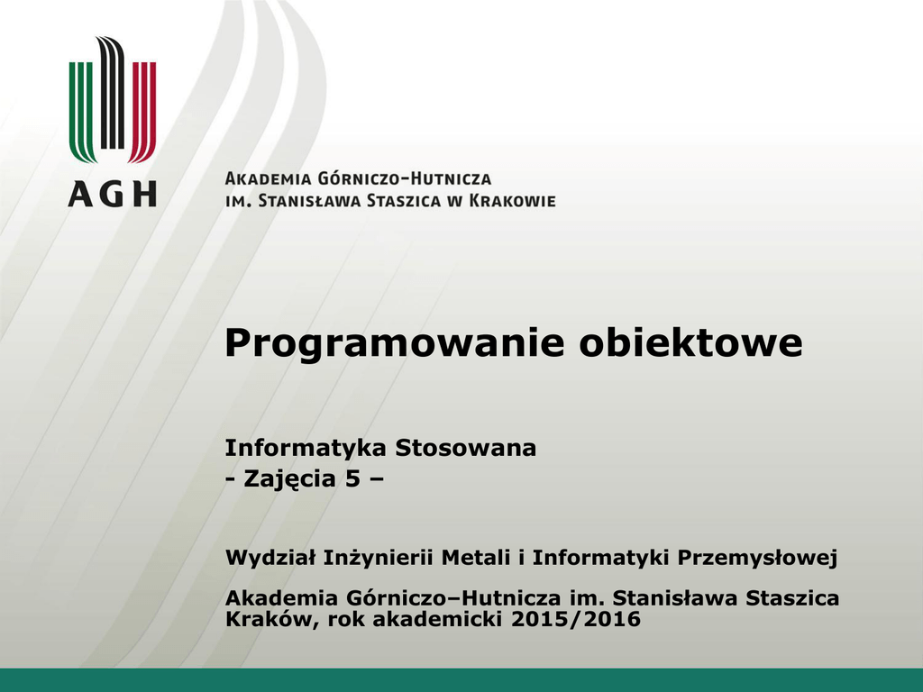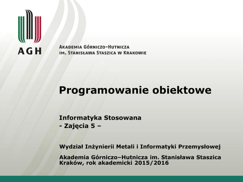 Programowanie obiektowe Informatyka Stosowana - Zajęcia 5 – Wydział Inżynierii Metali i Informatyki Przemysłowej Akademia Górniczo–Hutnicza im. Stanisława Staszica Kraków, rok akademicki 2015/2016 Deklaracja przyjaźni (Friend): Tematyka: • • • • • Przyjaźń: klasaA – funkcja globalna, Przyjaźń: klasaA – klasaB; Przyjaźć: klasaA – funkcja składowa klasyB, Deklaracja zapowiadająca funcji i klasy, Zastosowanie przyjaźni Zadanie Treść zadania zostanie podana przez prowadzącego