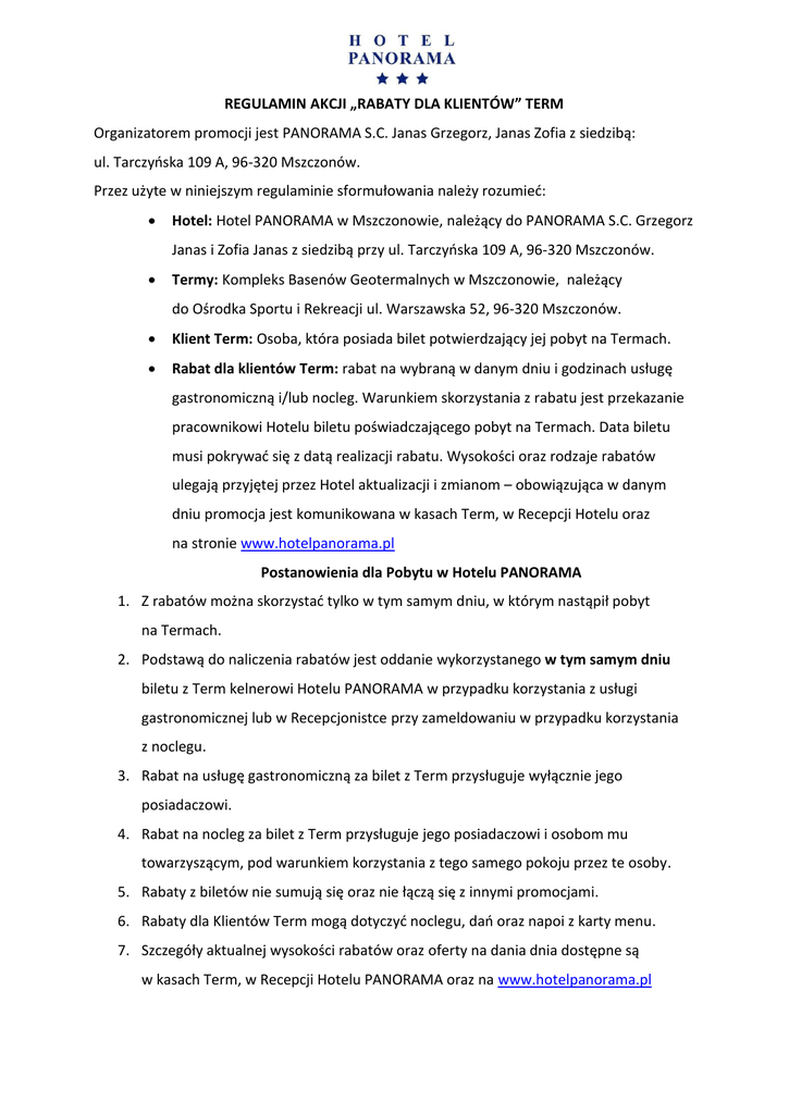 REGULAMIN AKCJI „RABATY DLA KLIENTÓW” TERM Organizatorem promocji jest PANORAMA S.C. Janas Grzegorz, Janas Zofia z siedzibą: ul. Tarczyńska 109 A, 96-320 Mszczonów. Przez użyte w niniejszym regulaminie sformułowania należy rozumieć: Hotel: Hotel PANORAMA w Mszczonowie, należący do PANORAMA S.C. Grzegorz Janas i Zofia Janas z siedzibą przy ul. Tarczyńska 109 A, 96-320 Mszczonów. Termy: Kompleks Basenów Geotermalnych w Mszczonowie, należący do Ośrodka Sportu i Rekreacji ul. Warszawska 52, 96-320 Mszczonów. Klient Term: Osoba, która posiada bilet potwierdzający jej pobyt na Termach. Rabat dla klientów Term: rabat na wybraną w danym dniu i godzinach usługę gastronomiczną i/lub nocleg. Warunkiem skorzystania z rabatu jest przekazanie pracownikowi Hotelu biletu poświadczającego pobyt na Termach. Data biletu musi pokrywać się z datą realizacji rabatu. Wysokości oraz rodzaje rabatów ulegają przyjętej przez Hotel aktualizacji i zmianom – obowiązująca w danym dniu promocja jest komunikowana w kasach Term, w Recepcji Hotelu oraz na stronie www.hotelpanorama.pl Postanowienia dla Pobytu w Hotelu PANORAMA 1. Z rabatów można skorzystać tylko w tym samym dniu, w którym nastąpił pobyt na Termach. 2. Podstawą do naliczenia rabatów jest oddanie wykorzystanego w tym samym dniu biletu z Term kelnerowi Hotelu PANORAMA w przypadku korzystania z usługi gastronomicznej lub w Recepcjonistce przy zameldowaniu w przypadku korzystania z noclegu. 3. Rabat na usługę gastronomiczną za bilet z Term przysługuje wyłącznie jego posiadaczowi. 4. Rabat na nocleg za bilet z Term przysługuje jego posiadaczowi i osobom mu towarzyszącym, pod warunkiem korzystania z tego samego pokoju przez te osoby. 5. Rabaty z biletów nie sumują się oraz nie łączą się z innymi promocjami. 6. Rabaty dla Klientów Term mogą dotyczyć noclegu, dań oraz napoi z karty menu. 7. Szczegóły aktualnej wysokości rabatów oraz oferty na dania dnia dostępne są w kasach Term, w Recepcji Hotelu PANORAMA oraz na www.hotelpanorama.pl