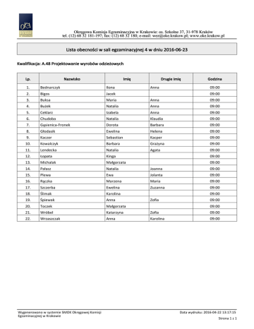 Okręgowa Komisja Egzaminacyjna w Krakowie: os. Szkolne 37, 31-978 Kraków tel. (12) 68 32 181-197; fax: (12) 68 32 180; e-mail: [email protected]; www.oke.krakow.pl Lista obecności w sali egzaminacyjnej 4 w dniu 2016-06-23 Kwalifikacja: A.48 Projektowanie wyrobów odzieżowych Lp. Nazwisko Imię Drugie imię 1. Bednarczyk Ilona 2. Bigos Jacek 3. Buksa Maria Anna 09:00 4. Bużek Natalia Anna 09:00 5. Ceklarz Izabela Anna 09:00 6. Chudoba Natalia Klaudia 09:00 7. Gąsienica-Fronek Dorota Barbara 09:00 8. Głodasik Ewelina Helena 09:00 9. Kaczor Sebastian Kacper 09:00 10. Kowalczyk Barbara Grażyna 09:00 11. Lendecka Natalia Agata 09:00 12. Łopata Kinga 09:00 13. Michalak Małgorzata 09:00 14. Pałasz Natalia Joanna 09:00 15. Plewa Ewa Jolanta 09:00 16. Rączka Marzena Maria 09:00 17. Szczerba Ewelina Zuzanna 09:00 18. Ślimak Karolina 19. Śpiewak Anna 20. Toczek Małgorzata 21. Wróbel Katarzyna Zofia 09:00 22. Wrzaszczak Anna Karolina 09:00 Wygenerowano w systemie SMOK Okręgowej Komisji Egzaminacyjnej w Krakowie Anna Godzina 09:00 09:00 09:00 Zofia 09:00 09:00 Data wydruku: 2016-04-22 13:17:15 Strona 1 z 1