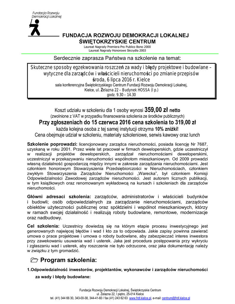 FUNDACJA ROZWOJU DEMOKRACJI LOKALNEJ ŚWIĘTOKRZYSKIE CENTRUM Laureat Nagrody Premiera Pro Publico Bono 2000 Laureat Nagrody Honorowe Skrzydła 2003 Serdecznie zaprasza Państwa na szkolenie na temat: Skuteczne sposoby egzekwowania roszczeń za wady i błędy projektowe i budowlane – wytyczne dla zarządców i właścicieli nieruchomości po zmianie przepisów środa, 6 lipca 2016 r. Kielce sala konferencyjna Świętokrzyskiego Centrum Fundacji Rozwoju Demokracji Lokalnej, Kielce, ul. Żelazna 22 – Budynek HOSSA (I p.) godz. 9.30 – 14.30 Koszt udziału w szkoleniu dla 1 osoby wynosi 359,00 zł netto (zwolnione z VAT w przypadku finansowania szkolenia ze środków publicznych) Przy zgłoszeniach do 15 czerwca 2016 cena szkolenia to 319,00 zł każda kolejna osoba z tej samej instytucji otrzyma 10% zniżki! Cena obejmuje udział w szkoleniu, materiały szkoleniowe, serwis kawowy oraz lunch Szkolenie poprowadzi: licencjonowany zarządca nieruchomości, posiada licencję Nr 7687, uzyskaną w roku 2001. Przez wiele lat pracował w firmach deweloperskich, gdzie uczestniczył w realizacji projektów deweloperskich, zarządzał nieruchomościami deweloperskimi, uczestniczył w przekazywaniu nieruchomości wspólnotom mieszkaniowym. Od 2009 prowadzi własną działalność gospodarczą między innymi w zakresie zarządzania nieruchomościami. Jest członkiem honorowym Stowarzyszenia Przedsiębiorczości w Nieruchomościach, członkiem zwykłym Stowarzyszenia Zarządców Nieruchomości „Warecka”, był członkiem Komisji Odpowiedzialności Zawodowej zarządców nieruchomości. Jest autorem licznych publikacji, w tym książkowych oraz renomowanym wykładowcą na kursach i szkoleniach dla zarządców nieruchomości. Główni adresaci szkolenia: zarządców, administratorów i właścicieli budynków i budowli; osób odpowiedzialnych za zarządzanie nieruchomościami, zarządców obiektów użyteczności publicznej oraz spółdzielni i wspólnot mieszkaniowych, którzy w ramach swojej działalność i realizują roboty budowlane, remontowe, modernizacje oraz nadbudowy. Cel szkolenia: Uczestnicy dowiedzą się na którym etapie procesu inwestycyjnego jest generowanych najwięcej błędów i wad I kto za to odpowiada. Jakie zapisy powinna zawierać umowa o prace projektowe i umowa o roboty budowlane, aby zabezpieczać interes inwestora przy zawekowaniu usuwania wad i usterek. Jaka jest procedura postępowania przy wykryciu i zgłaszaniu wad i usterek, aby roszczenie nie było odrzucone, oraz jaka dokumentację należy w związku z tym gromadzić. 1 Program szkolenia: 1.Odpowiedzialność inwestorów, projektantów, wykonawców i zarządców nieruchomości za wady i błędy budowlane: Fundacja Rozwoju Demokracji Lokalnej, Świętokrzyskie Centrum ul. Żelazna 22, I piętro, 25-014 Kielce tel. (41) 344 66 30, 343-00-38, 344-41-60 / fax (41) 243 62 63 www.frdl.kielce.pl, e-mail: [email protected] a. Zmiany w Prawie budowlanym i przepisach Kodeksu cywilnego dotyczące wad i błędów oraz egzekwowania ich usuwania. b. Prawa i obowiązki poszczególnych uczestników procesu inwestycyjnego? c. Za jakie błędy odpowiada projektant, wykonawca i inwestor? d. Jaką dokumentacją obwarować rozpoczęcie prac, aby zabezpieczyć się na okoliczność wystąpienia wad i błędów? e. Jakie działania podjąć, gdy wady zostaną zauważone po zakończeniu i odbiorze prac inwestycyjnych/ remontowych? 2. Jak przygotować bezpieczne umowy o prace projektowe i roboty budowlane? a. Co powinna zawierać „wzorcowa” umowa gwarantującą należyte wykonanie prac budowlanych? b. Jakie błędy najczęściej popełniane w umowach uniemożliwiają dochodzenie praw, jakie nowe zagrożenia niosą zmiany w przepisach? c. Obowiązkowe klauzule – czyli co bezwzględnie umieścić w umowie, aby móc w przyszłości uzyskać rekompensatę za wady i odszkodowanie. 3. Postępowania przy wykryciu wad i usterek budowlanych: a. Jakie działania podjąć w pierwszej kolejności w przypadku wykrycia wad i błędów budowlanych? b. Jak skutecznie zareklamować wadliwe prace budowlane i wyegzekwować ich naprawę? 4. Jak skutecznie egzekwować od wykonawcy usunięcie stwierdzonych usterek budowlanych? a. Jak stwierdzić, które wady należy usunąć, a w przypadku których jest to nieopłacalne? b. Jak udowodnić i wyegzekwować naprawę popełnionych błędów oraz usunięcie szkód? c. Jakie możliwości dla zarządców a jakie dla wykonawców daje nowy przepis o uzyskaniu gwarancji za roboty budowlane? d. Jak dochodzić reklamacji w procesie budowlanym na linii inwestor – projektant – wykonawca – użytkownik. e. W jakich sytuacjach opłaca się postępowanie polubowne, a kiedy koniecznie należy wkroczyć na drogę sądową? f. Jak postępować w przypadku wykonawca zbankrutował lub rozwiązał działalność? g. Co zrobić w przypadku, gdy wykonawcy nie stać na usunięcie spowodowanych wad – możliwe rozwiązania prawne i umowne. 5. Obowiązkowa dokumentacja wad i błędów budowlanych, czyli jak zabezpieczyć swoje interesy? a. Jaką dokumentację należy obowiązkowo gromadzić? b. Jak przygotować skuteczne wezwanie o usunięcie stwierdzonych usterek budowlanych – obowiązkowe elementu pisma roszczeniowego. Fundacja Rozwoju Demokracji Lokalnej, Świętokrzyskie Centrum ul. Żelazna 22, I piętro, 25-014 Kielce tel. (41) 344 66 30, 343-00-38, 344-41-60 / fax (41) 243 62 63 www.frdl.kielce.pl, e-mail: [email protected] c. Jak na potrzeby kontroli NB ewidencjonować w KOB usterki budowlane oraz czynności podjęte w celu ich usunięcia? Każdy uczestnik szkolenia otrzyma ZAŚWIADCZENIE uczestnictwa Zgłoszenia należy kierować do FRDL mailem ([email protected]) lub faxem (41 243 62 63) na „formularzu zgłoszenia” w terminie do 30.06.2016 r. Po otrzymaniu zgłoszenia odeślemy Państwu potwierdzenie przyjęcia rezerwacji na podany adres e-mail. W przypadku braku potwierdzenia prosimy o kontakt telefoniczny Fo