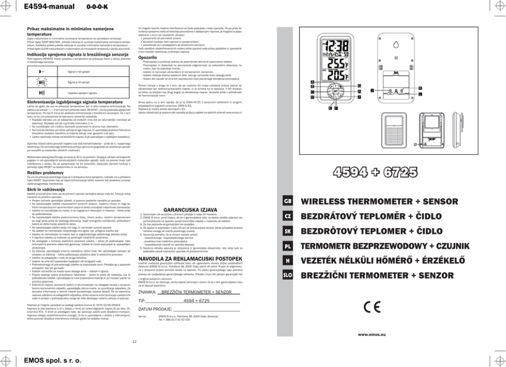 E4594-manual 0-0-0-K Ni mogoče oceniti, kakšne interference se bodo pojavljale v kraju uporabe. Če pa pride do motenja sprejema radia ali televizije povzročene z oddajanjem naprave, je mogoče ta pojav odstraniti z enim od navedenih ukrepov: • preusmeriti ali premestiti antene • povečati razdaljo med napravo in sprejemnikom • posvetovati se s prodajalcem ali strokovnim servisom Vpliv okoliških visokofrekvenčnih motenj lahko povzroči slab prikaz podatkov in uporabnik mora narediti resetiranje (nuliranje) naprave. Prikaz maksimalne in minimalne namerjene temperature Zapis maksimalne in minimalne namerjene temperature se samodejno shranjuje. Pritisk tipke TEMP MAX/MIN prikaže notranjo in zunanjo maksimalno namerjeno temperaturo. Naslednji pritisk prikaže notranjo in zunanjo minimalno namerjeno temperaturo. Pritisk tipke CLEAR med prikazom maksimalnih ali minimalnih temperatur izbriše pomnilnik. Indikacija sprejema signala iz brezžičnega senzorja Opozorilo Pod napisom REMOTE zraven podatka o temperaturi se prikazuje ikona o stanju prenosa iz brezžičnega senzorja. - Proizvajalec si pridržuje pravico do spremembe tehničnih parametrov izdelka. - Proizvajalec in dobavitelj ne prevzameta odgovornosti za nekorektno delovanje na mestu, kjer se pojavljajo motnje. - Izdelek ni namenjen zdravniškim in komercialnim namenom. - Izdelek vsebuje drobne sestavne dele, zato ga namestite izven dosega otrok. - Noben del navodil ne sme biti reproduciran brez pismenega dovoljenja proizvajalca. Signal ni bil sprejet Signal je bil sprejet Pomen klicaja v krogu je v tem, da po razširitvi EU imajo nekatere države izjeme za obratovanje npr. telekomunikacijskih naprav, in ta oznaka na to opozarja. V teh državah so lahko za določen čas drugi pogoji za obratovanje naprav. Vendarle pride v prihodnosti do harmonizacije norm. Uspešen sprejem signala Sinhronizacija izgubljenega signala temperature Emos spol.s r.o. s tem izjavlja, da je ta 4594+6725 z osnovnimi zahtevami in drugimi pripadajočimi regulativi smernice 1999/5/ES. Napravo je možno prosto sprovajati v EU. Izjava o skladnosti je sestavni del navodila ali pa jo najdete na spletnih straneh www.emos.cz Lahko se zgodi, da ura ne prikazuje temperature, ker ni bila narejena sinhronizacija. Na zaslonu se prikaže “--.-“. V tem primeru pritisnite tipko „RE-SYNC“. Ura bo poskusila sprejemati temperaturo. Po čas 6 minut bo potekala sinhronizacija z brezžičnim senzorjem. Če v tem času ne bo ura prikazovala temperature, preverite naslednje: • Razdaljo stenske ure ali oddajnika od motečih virov kot so računalniški monitorji ali televizorji. Razdalja od njih naj bi bila minimalno 1 m. • Ne nameščajte ure v bližino kovinskih predmetov in okvirov (npr. okenskih). • Na funkcijo stenske ure lahko vplivajo druge naprave, ki uporabljajo podobno frekvenco (brezžične slušalke, brezžično krmiljenje žaluzij, vrat, garažnih vrat ipd.). • Lahko nastanejo motnje od brezžičnih naprav, ki jih uporabljajo v najbližjem sosedstvu. Opomba: Včasih lahko povzroči napako tudi slab kontakt baterije – pride do t.i. napačnega resetiranja. Do samodejnega resetiranja prihaja izjemoma (pogosteje se resetiranje uporabi po navodilih za nastavitev izhodnih vrednosti). Maksimalen doseg brezžičnega senzorja je 30 m na prostem. Doseg je odvisen od krajevnih pogojev in od uporabljenih konstrukcijskih materialov zgradb. Vpliv na prenos imajo tudi interference v okolju. Če se sprejemanje ne bo uresničilo, poskusite obnoviti funkcijo s pomočjo tipke RESET na sprejemniku in na senzorju. 4594 + 6725 Rešitev problemov Če ura ne prikazuje pravilnega časa ali ni prikazana ikona sprejema, nulirajte uro s pritiskom tipke RESET. Nepravilen čas ali izpad sinhronizacije lahko nastane kot posledica zunanje elektromagnetske interference. Skrb in vzdrževanje Izdelek je konstruiran tako, da ob primerni uporabi zanesljivo deluje vrsto let. Tukaj je nekaj nasvetov za pravilno uporabo: • Preden začnete uporabljati izdelek, si pozorno preberite navodila za uporabo. • Ne izpostavljajte izdelka neposrednim sončnim žarkom, hudemu mrazu in vlagi ter hitrim temperaturnim spremembam (saj bi to lahko zmanjšalo natančnost zaznavanja. • Izdelka ne nameščajte na mesta, ki so nagnjena k vibracijam in tresenju – lahko pride do poškodovanja. • Ne izpostavljajte izdelka prekomernemu tlaku, trkom, prahu, visokim temperaturam ali vlagi lahko pride do slabšega delovanja, krajši energetski vzdržljivosti, poškodbam baterij ali deformacije plastičnih delov. • Ne izpostavljajte izdelka dežju niti vlagi, ni namenjen zunanji uporabi. • Na izdelek ne nameščajte nikakršnega vira ognja, npr. prižgano svečko ipd. • Izdelka ne nameščajte na mesta, kjer ni zagotovljenega zadostnega pretoka zraka. • V odprtine izdelka za zračenje ne potiskajte nikakršnih predmetov. • Ne posegajte v notranje električne povezave izdelka – lahko jih poškodujete, tako avtomatično preneha veljavnost garancije. Izdelek bi moral popravljati le usposobljen strokovnjak. • Za čiščenje uporabljajte zmerno navlaženo nežno krpo. Ne uporabljajte raztopin ali sredstev za čiščenje – lahko poškodujejo plastične dele in električne povezave. • Izdelka ne potapljajte v vodo ali druge tekočine. • Izdelek ne sme biti izpostavljen kapljajoči niti brizgajoči vodi. • Poškodovanega ali pokvarjenega izdelka ne popravljajte sami. Predajte ga v popravilo prodajalni, kjer ste ga kupili. • Izdelek namestite na mesto izven dosega otrok – izdelek ni igrača. • Prazne baterije vedno pravočasno odstranite – lahko bi prišlo do iztekanja, kar bi poškodovalo izdelek. Uporabljajte le nove priporočene baterije in pri menjavi pazite na pravilno polarnost. • Električnih naprav, prenosnih baterij in akumulatorjev ne odlagajte skupaj z nerazvrščenimi komunalnimi odpadki, uporabljajte zbirna mesta za razvrščanje odpadkov. Za aktualne informacije o zbi