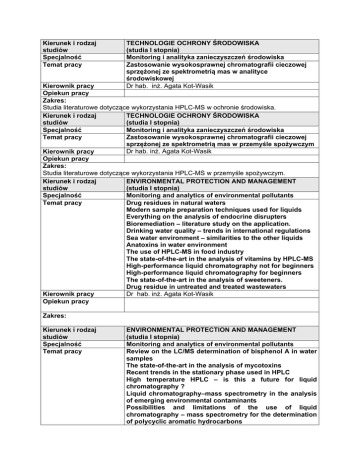 Kierunek i rodzaj studiów Specjalność Temat pracy TECHNOLOGIE OCHRONY ŚRODOWISKA (studia I stopnia) Monitoring i analityka zanieczyszczeń środowiska Zastosowanie wysokosprawnej chromatografii cieczowej sprzężonej ze spektrometrią mas w analityce środowiskowej Dr hab. inż. Agata Kot-Wasik Kierownik pracy Opiekun pracy Zakres: Studia literaturowe dotyczące wykorzystania HPLC-MS w ochronie środowiska. Kierunek i rodzaj TECHNOLOGIE OCHRONY ŚRODOWISKA studiów (studia I stopnia) Specjalność Monitoring i analityka zanieczyszczeń środowiska Temat pracy Zastosowanie wysokosprawnej chromatografii cieczowej sprzężonej ze spektrometrią mas w przemyśle spożywczym Dr hab. inż. Agata Kot-Wasik Kierownik pracy Opiekun pracy Zakres: Studia literaturowe dotyczące wykorzystania HPLC-MS w przemyśle spożywczym. Kierunek i rodzaj ENVIRONMENTAL PROTECTION AND MANAGEMENT studiów (studia I stopnia) Specjalność Monitoring and analytics of environmental pollutants Temat pracy Drug residues in natural waters Modern sample preparation techniques used for liquids Everything on the analysis of endocrine disrupters Bioremediation – literature study on the application. Drinking water quality – trends in international regulations Sea water environment – similarities to the other liquids Anatoxins in water environment The use of HPLC-MS in food industry The state-of-the-art in the analysis of vitamins by HPLC-MS High-performance liquid chromatography not for beginners High-performance liquid chromatography for beginners The state-of-the-art in the analysis of sweeteners. Drug residue in untreated and treated wastewaters Dr hab. inż. Agata Kot-Wasik Kierownik pracy Opiekun pracy Zakres: Kierunek i rodzaj studiów Specjalność Temat pracy ENVIRONMENTAL PROTECTION AND MANAGEMENT (studia I stopnia) Monitoring and analytics of environmental pollutants Review on the LC/MS determination of bisphenol A in water samples The state-of-the-art in the analysis of mycotoxins Recent trends in the stationary phase used in HPLC High temperature HPLC – is this a future for liquid chromatography ? Liquid chromatography–mass spectrometry in the analysis of emerging environmental contaminants Possibilities and limitations of the use of liquid chromatography – mass spectrometry for the determination of polycyclic aromatic hydrocarbons Liquid chromatography/Fourier transform ion cyclotron resonance mass spectrometry (LC-FTICR MS): an early overview Overview of liquid chromatography/nuclear magnetic resonance (LC-NMR) system. The current role of liquid chromatography–mass spectrometry in drug quantification in blood and oral fluid LC-MS and MS/MS as an Excellent Tool for the Discovery and Structural Elucidation of New Metabolites and Degradation Products Kierownik pracy Opiekun pracy Zakres: Kierunek i rodzaj studiów Specjalność Temat pracy Kierownik pracy Opiekun pracy Zakres: ENVIRONMENTAL PROTECTION AND MANAGEMENT (studia I stopnia) Monitoring and analytics of environmental pollutants 1. Applications of LC-MS to quantitation and evaluation of the environmental fate of chiral drugs and their metabolites 2. Challenges and achievements of LC-MS in environmental analysis: 25 years on 3. How fast chromatography is in the beginig of XXI century 4. Application of MS techniques to analysis and identification of human metabolites of pharmaceuticals in the aquatic environment 5. From highly sophisticated analytical techniques to lifesaving diagnostics: Technical developments in breath analysis 6. Exhaled breath condensate - why and how to analyse ? 7. Disinfection by-products and other emerging contaminants in drinking water 8. Two-dimentional chromatography: recent developments and perspectives. 9. Perfume analysis. 10. Supercritical fluids super solvents ? 11. Analytical extractions with water. 12. Chemistry of traditional Chinese medicines 13. Liquid chromatography at elevated temperatures with pure water as the mobile phase 14. Certified reference materials for organic contaminants for use in monitoring of the aquatic environment Dr hab. inż. Agata Kot-Wasik