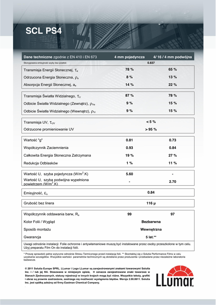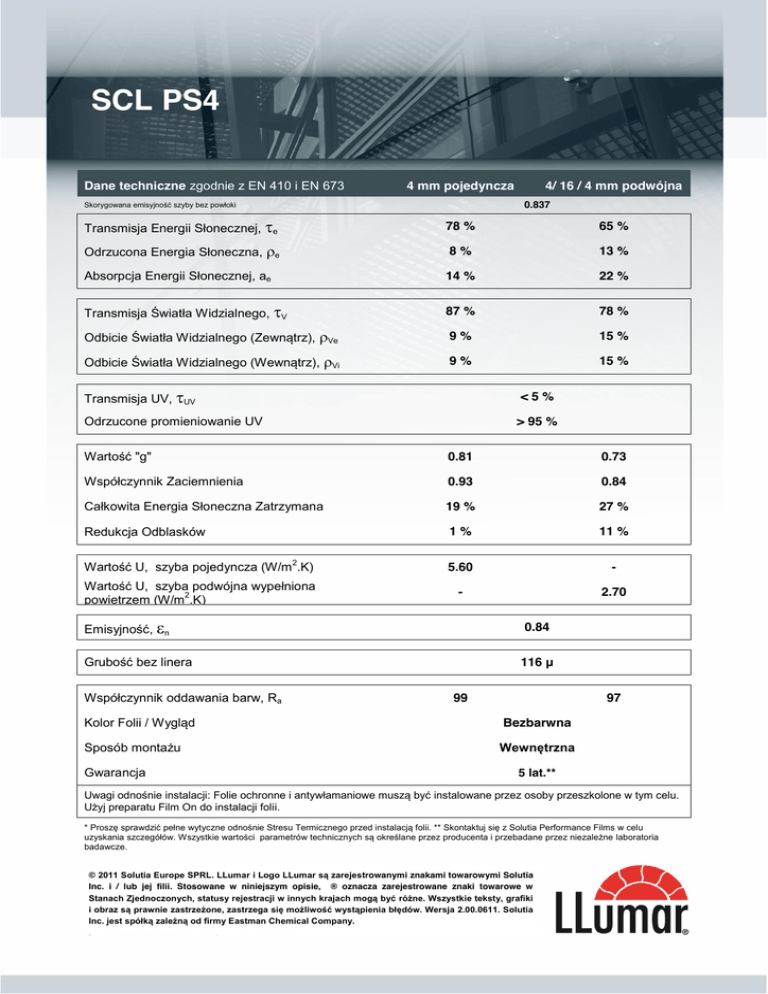 SCL PS4 Dane techniczne zgodnie z EN 410 i EN 673 4 mm pojedyncza 4/ 16 / 4 mm podwójna 0.837 Skorygowana emisyjność szyby bez powłoki Transmisja Energii Słonecznej, e 78 % 65 % Odrzucona Energia Słoneczna, e 8% 13 % 14 % 22 % 87 % 78 % Ve 9% 15 % Vi 9% 15 % Absorpcja Energii Słonecznej, ae Transmisja Światła Widzialnego, V Odbicie Światła Widzialnego (Zewnątrz), Odbicie Światła Widzialnego (Wewnątrz), Transmisja UV, UV <5% Odrzucone promieniowanie UV > 95 % Wartość "g" 0.81 0.73 Współczynnik Zaciemnienia 0.93 0.84 Całkowita Energia Słoneczna Zatrzymana 19 % 27 % Redukcja Odblasków 1% 11 % Wartość U, szyba pojedyncza (W/m .K) 5.60 - Wartość U, szyba podwójna wypełniona 2 powietrzem (W/m .K) - 2.70 2 Emisyjność, n 0.84 116 μ Grubość bez linera Współczynnik oddawania barw, Ra 99 97 Kolor Folii / Wygląd Bezbarwna Sposób montażu Wewnętrzna Gwarancja 5 lat.** Uwagi odnośnie instalacji: Folie ochronne i antywłamaniowe muszą być instalowane przez osoby przeszkolone w tym celu. Użyj preparatu Film On do instalacji folii. * Proszę sprawdzić pełne wytyczne odnośnie Stresu Termicznego przed instalacją folii. ** Skontaktuj się z Solutia Performance Films w celu uzyskania szczegółów. Wszystkie wartości parametrów technicznych są określane przez producenta i przebadane przez niezależne laboratoria badawcze. © 2011 Solutia Europe SPRL. LLumar i Logo LLumar są zarejestrowanymi znakami towarowymi Solutia Inc. i / lub jej filii. Stosowane w niniejszym opisie, ® oznacza zarejestrowane znaki towarowe w Stanach Zjednoczonych, statusy rejestracji w innych krajach mogą być różne. Wszystkie teksty, grafiki i obraz są prawnie zastrzeżone, zastrzega się możliwość wystąpienia błędów. Wersja 2.00.0611. Solutia Inc. jest spółką zależną od firmy Eastman Chemical Company. SCL PS4 Cechy i korzyści Bezbarwna folia ochronna: zamontowana na szybie nadaje jej właściwości szyby bezpiecznej zgodnie z norma EN 12600. Zgodna z normą EN 12600 dla klasy 2(B)2 na 4mm szkle typu float. Doskonale przejrzysta. Niemal nie zauważalna po zainstalowaniu. Zastosowanie niezwykle mocnego kleju łączącego folię z szybą - zwiększa bezpieczeństwo w przypadku uderzenia, wybuchu bomby i zamierzonego ataku. Klej akrylowy odporny na wysoką temperaturę (żaroodporny) z szybką lepkością do szkła. Dostępna również jako folia anty - graffiti GCL SR RPS 4 i jako folia przeciwsłoneczna. Instalacja wewnętrzna. Wszystkie folie ochronne i antywłamaniowe powinny być instalowane wyłącznie przez osoby przeszkolone przez Solutia Performance Films. Wytyczne odnośnie instalacji muszą być przestrzegane. Cechy: Wytrzymałość na rozciąganie - kierunek wzdłuż 224 N / mm2, - kierunek w poprzek 207 N / mm2 Plastyczność - kierunek wzdłuż 105 N / mm2, - kierunek w poprzek 108 N / mm2 Wydłużenie przy zerwaniu - kierunek wzdłuż 100%, - kierunek poprzeczny 139% Wydłużenie na granicy plastyczności - kierunek wzdłuż 7%, - kierunku poprzecznym 6% Widmo optyczne (spektrum) Odbicie wewnętrzne, % Odbicie zewnętrzne, % Długość fali, nm Transmisja, %