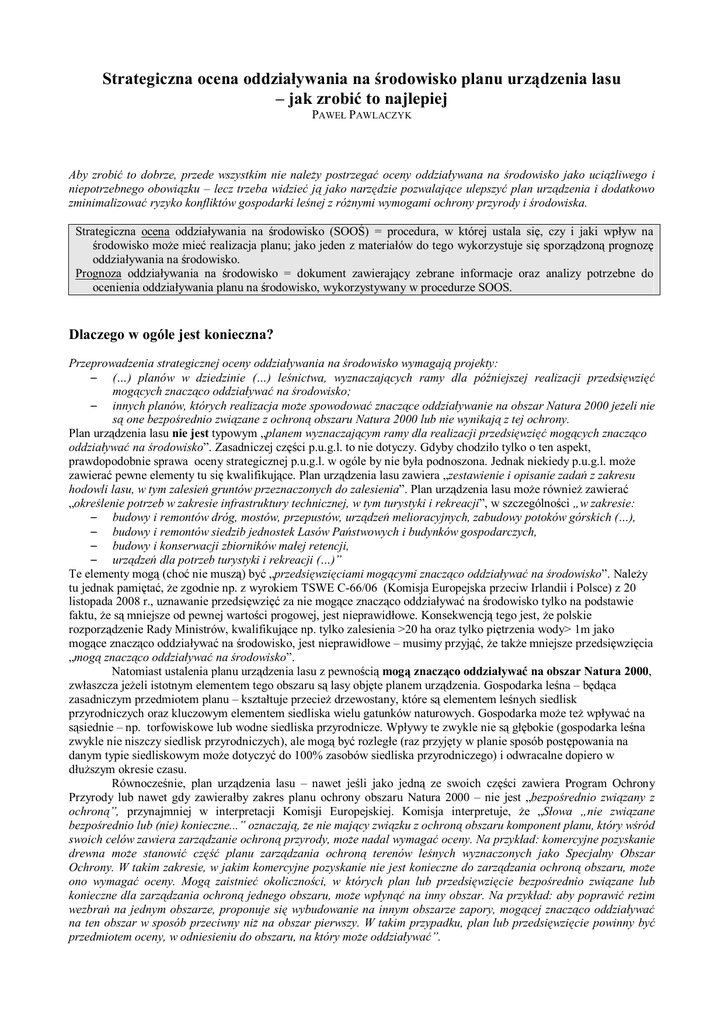 Strategiczna ocena oddziaływania na środowisko planu urządzenia lasu – jak zrobić to najlepiej PAWEŁ PAWLACZYK Aby zrobić to dobrze, przede wszystkim nie należy postrzegać oceny oddziaływana na środowisko jako uciążliwego i niepotrzebnego obowiązku – lecz trzeba widzieć ją jako narzędzie pozwalające ulepszyć plan urządzenia i dodatkowo zminimalizować ryzyko konfliktów gospodarki leśnej z różnymi wymogami ochrony przyrody i środowiska. Strategiczna ocena oddziaływania na środowisko (SOOŚ) = procedura, w której ustala się, czy i jaki wpływ na środowisko może mieć realizacja planu; jako jeden z materiałów do tego wykorzystuje się sporządzoną prognozę oddziaływania na środowisko. Prognoza oddziaływania na środowisko = dokument zawierający zebrane informacje oraz analizy potrzebne do ocenienia oddziaływania planu na środowisko, wykorzystywany w procedurze SOOS. Dlaczego w ogóle jest konieczna? Przeprowadzenia strategicznej oceny oddziaływania na środowisko wymagają projekty: – (…) planów w dziedzinie (…) leśnictwa, wyznaczających ramy dla późniejszej realizacji przedsięwzięć mogących znacząco oddziaływać na środowisko; – innych planów, których realizacja może spowodować znaczące oddziaływanie na obszar Natura 2000 jeżeli nie są one bezpośrednio związane z ochroną obszaru Natura 2000 lub nie wynikają z tej ochrony. Plan urządzenia lasu nie jest typowym „planem wyznaczającym ramy dla realizacji przedsięwzięć mogących znacząco oddziaływać na środowisko”. Zasadniczej części p.u.g.l. to nie dotyczy. Gdyby chodziło tylko o ten aspekt, prawdopodobnie sprawa oceny strategicznej p.u.g.l. w ogóle by nie była podnoszona. Jednak niekiedy p.u.g.l. może zawierać pewne elementy tu się kwalifikujące. Plan urządzenia lasu zawiera „zestawienie i opisanie zadań z zakresu hodowli lasu, w tym zalesień gruntów przeznaczonych do zalesienia”. Plan urządzenia lasu może również zawierać „określenie potrzeb w zakresie infrastruktury technicznej, w tym turystyki i rekreacji”, w szczególności „w zakresie: – budowy i remontów dróg, mostów, przepustów, urządzeń melioracyjnych, zabudowy potoków górskich (…), – budowy i remontów siedzib jednostek Lasów Państwowych i budynków gospodarczych, – budowy i konserwacji zbiorników małej retencji, – urządzeń dla potrzeb turystyki i rekreacji (…)” Te elementy mogą (choć nie muszą) być „przedsięwzięciami mogącymi znacząco oddziaływać na środowisko”. Należy tu jednak pamiętać, że zgodnie np. z wyrokiem TSWE C-66/06 (Komisja Europejska przeciw Irlandii i Polsce) z 20 listopada 2008 r., uznawanie przedsięwzięć za nie mogące znacząco oddziaływać na środowisko tylko na podstawie faktu, że są mniejsze od pewnej wartości progowej, jest nieprawidłowe. Konsekwencją tego jest, że polskie rozporządzenie Rady Ministrów, kwalifikujące np. tylko zalesienia >20 ha oraz tylko piętrzenia wody> 1m jako mogące znacząco oddziaływać na środowisko, jest nieprawidłowe – musimy przyjąć, że także mniejsze przedsięwzięcia „mogą znacząco oddziaływać na środowisko”. Natomiast ustalenia planu urządzenia lasu z pewnością mogą znacząco oddziaływać na obszar Natura 2000, zwłaszcza jeżeli istotnym elementem tego obszaru są lasy objęte planem urządzenia. Gospodarka leśna – będąca zasadniczym przedmiotem planu – kształtuje przecież drzewostany, które są elementem leśnych siedlisk przyrodniczych oraz kluczowym elementem siedliska wielu gatunków naturowych. Gospodarka może też wpływać na sąsiednie – np. torfowiskowe lub wodne siedliska przyrodnicze. Wpływy te zwykle nie są głębokie (gospodarka leśna zwykle nie niszczy siedlisk przyrodniczych), ale mogą być rozległe (raz przyjęty w planie sposób postępowania na danym typie siedliskowym może dotyczyć do 100% zasobów siedliska przyrodniczego) i odwracalne dopiero w dłuższym okresie czasu. Równocześnie, plan urządzenia lasu – nawet jeśli jako jedną ze swoich części zawiera Program Ochrony Przyrody lub nawet gdy zawierałby zakres planu ochrony obszaru Natura 2000 – nie jest „bezpośrednio związany z ochroną”, przynajmniej w interpretacji Komisji Europejskiej. Komisja interpretuje, że „Słowa „nie związane bezpośrednio lub (nie) konieczne...” oznaczają, że nie mający związku z ochroną obszaru komponent planu, który wśród swoich celów zawiera zarządzanie ochroną przyrody, może nadal wymagać oceny. Na przykład: komercyjne pozyskanie drewna może stanowić część planu zarządzania ochroną terenów leśnych wyznaczonych jako Specjalny Obszar Ochrony. W takim zakresie, w jakim komercyjne pozyskanie nie jest konieczne do zarządzania ochroną obszaru, może ono wymagać oceny. Mogą zaistnieć okoliczności, w których plan lub przedsięwzięcie bezpośrednio związane lub konieczne dla zarządzania ochroną jednego obszaru, może wpłynąć na inny obszar. Na przykład: aby poprawić reżim wezbrań na jednym obszarze, proponuje się wybudowanie na innym obszarze zapory, mogącej znacząco oddziaływać na ten obszar w sposób przeciwny niż na obszar pierwszy. W takim przypadku, plan lub przedsięwzięcie powinny być przedmiotem oceny, w odniesieniu do obszaru, na który może oddziaływać”. Gdy już prognoza jest robiona, warto wykorzystać ją także do przeprowadzenia: – analizy możliwego oddziaływania na gatunki chronione, w tym zwłaszcza na eurochronione (wymóg wynikający z potrzeby ‘systemu ścisłej ochrony’ i z art. 12-16 dyrektywy siedliskowej oraz z art. 5 i 9 dyrektywy ptasiej + możliwość oszacowania ‘zapotrzebowania na zezwolenia’); – analizy wpływu „gatunków obcych” na siedliska przyrodnicze (wymóg wynikający z art. 22 dyrektywy siedliskowej) – nadzoru nad całymi (także poza obszarami Natura 2000) zasobami siedlisk przyrodn