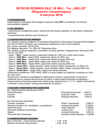 WYŚCIGI RÓWNOLGŁE 1/8 MILI - Tor „KIELCE” (Regulamin Uzupełniający) 6 sierpnia 2016 1. ORGANIZATOR Organizatorem Wyścigów Równoległych (zwanych dalej WR) na dystansie 1/8 mili jest Automobilklub Kielecki 2. CEL IMPREZY - podnoszenie umiejętności jazdy i sprawności kierowania pojazdem w warunkach rywalizacji sportowej, - popularyzowanie sportów samochodowych. 3. CHARAKTERYSTYKA IMPREZY 3.1. Zawody zostaną rozegrane na podstawie Regulaminu Ramowego Wyścigów Równoległych 1/8 mili ZO PZM w Kielcach oraz niniejszego Regulaminu wraz z komunikatami 3.2. Termin zawodów: 06.08.2016 3.3. Miejsce zawodów: Tor „KIELCE” Miedziana Góra 3.4. Zawody zostaną rozegrane z podziałem na klasy zgodnie z Regulaminem Ramowym WR 1/8 mili ZO PZM: - klasa 1 Mini - napęd dowolny, pojemność silnika do 1550 ccm, silnik wolno-ssący - klasa 2 FWD Mini - napęd FWD, pojemność silnika do 2000 ccm - klasa 3 FWD Maxi - napęd FWD, pojemność silnika powyżej 2000 ccm - klasa 4 RWD Mini - napęd RWD, pojemność silnika do 2000 ccm - klasa 5 RWD Maxi - napęd RWD, pojemność silnika powyżej 2000 ccm - klasa 6 Diesel Mini - napęd dowolny, silniki zasilane olejem napędowym do 2000 ccm - klasa 7 Diesel Maxi - napęd dowolny, silniki zasilane olejem napęd. powyżej 2000 ccm - klasa 8 DRAG Maxi - napęd AWD, pojemność silnika dowolna. Objaśnienia dodatkowe: FWD, RWD, AWD to rodzaj napędu (w kolejności: przednia oś, tylna oś, dwie osie) Samochody z silnikami posiadającymi doładowanie (turbina, supercharger /kompresor/, podtlenek azotu) zostaną dopuszczone do startu w klasie pojemnościowej wynikającej z przemnożenia nominalnej pojemności silnika przez współczynnik 1.7 (1.5 - diesel). Samochody z silnikiem „rotary engine” zostaną przydzielone do klasy 8. 4. WŁADZE I KIEROWNICTWO ZAWODÓW 4.1. Zespół Sędziów Sportowych (ZSS) Przewodniczący Członek Członek Krzysztof Karczewski Krzysztof Tutak Zbigniew Molenda 4.2. Kierownictwo Zawodów: Dyrektor zawodów Asystent dyrektora ds. kontaktów z zawodnikami Kierownik trasy Kierownik Badania Kontrolnego Starter Kierownik Biura Zawodów Robert Twardowski Andrzej Szczodrak Adam Głuszek Andrzej Hys Andrzej Woźniczko Karolina Pasternakiewicz 5. HARMONOGRAM CZASOWY Biuro Zawodów - przyjmowanie zgłoszeń Badanie Kontrolne samochodów - 7.30 - 9.00 - 8.00 - 9.30 1 I 254/12 I 253/12 I 263/12 I 568/14 II 05030 II 05003 I 321/12 I 252/12 II 05009 Obowiązkowa odprawa z zawodnikami Przejazdy treningowo-zapoznawcze Rozpoczęcie przejazdów kwalifikacyjnych Przejazdy półfinałowe i finałowe Ogłoszenie wyników i wręczenie nagród - 9.40 - 10.00 - 11.30 - 12.00 - 15 minut po zakończeniu kwalifikacji - 16.00 Organizator zastrzega sobie możliwość wprowadzenia zmian w powyższym harmonogramie w zależności od ilości zgłoszonych kierowców. O wszystkich zmianach uczestnicy zostaną powiadomieni komunikatami umieszczonymi na tablicy ogłoszeń. 6. ZGŁOSZENIA I WPISOWE. 6.1. Zgłoszenie należy wysyłać drogą elektroniczną 6.2. Wpisowe wynosi 50 zł dla członków Automobilklubu Kieleckiego i 80 zł dla pozostałych kierowców i należy je wpłacić na konto Automobilklubu najpóźniej do dnia 20 sierpnia 2016 z zaznaczeniem w tytule wpłaty „Wyścig na 1/8 mili” Lokalizacja Biura Do dnia 05.08.2016 r. biuro znajdować się będzie w siedzibie Automobilklubu Kieleckiego, przy ul. Słowackiego 16, tel./fax.: 041/361 98 55, e-mail: [email protected] W dniu imprezy, tj. 06.08.2016 r. od godz. 7.00 do godz. 9.00 w budynku administracji na Torze "KIELCE" w Miedzianej Górze. BRE BANK S.A. Oddział Korporacyjny w Kielcach 96 1140 2020 0000 5661 5500 1001 z zaznaczeniem w tytule wpłaty: "Wyścig równoległy Wpisowe należy wpłacić najpóźniej do dnia 20.07.2016r. 1/8 mili.” 6.3. Uczestnikiem imprezy może być każdy posiadacz samochodu z ważnym dowodem rejestracyjnym i prawem jazdy odpowiedniej kategorii. Nie dopuszcza się uczestnictwa pilota. Samochody bez ważnego dowodu rejestracyjnego nie będą dopuszczone do imprezy 6.4. Dokumenty do okazania w Biurze Zwodów i BK: - prawo jazdy kierowcy - ubezpieczenie OC i NNW (zalecane) - dowód rejestracyjny pojazdu z ważnymi badaniami technicznymi - pisemną zgodę właściciela, w przypadku korzystania z samochodu nie będącego własnością kierowcy 6.5. Jednym pojazdem, w charakterze kierowcy może startować maksymalnie dwóch uczestników, na podstawie osobnych zgłoszeń i dodatkowego wpisowego. 7. PRZEBIEG ZAWODÓW 7.1. Przedmiotem współzawodnictwa sportowego jest pokonanie w jak najkrótszym czasie odległości 1/8 mili tj. 201.168 m wyznaczonej pomiędzy linią „Start” i linią „Meta”. Podczas pokonywania tego dystansu nie obowiązują ograniczenia prędkości. 7.2. Po przyjęciu w Biurze Zawodów kierowcy podjeżdżają na Badania Kontrolne. Obowiązkiem zawodnika jest umieszczenie numeru startowego (większy - na tylnej szybie po prawej stronie, mniejszy - na przedniej szybie, u góry po prawej stronie). 7.3. Po zakończeniu badań kontrolnych organizator wywiesi na tablicy ogłoszeń listę startową kierowców upoważnionych do udziału w zawodach. 7.4. Kierowca podczas jazdy musi posiadać zapięte pasy bezpieczeństwa i kask ochronny. Wszystkie szyby muszą być zasunięte. 7.5. Każdy kierowca może prowadzić w zawodach tylko jeden pojazd w danej klasie. 2 Dopuszcza się start dwóch kierowców na jednym samochodzie pod warunkiem wpłacenia drugiego wpisowego. Jeśli w biegach półfinałowych lub finałowych nastąpi spotkanie tych kierowców, wówczas każdy z nich przejedzie dystans pojedynczo, a o zwycięstwie w wyścigu zadecyduje lepszy wynik. 7.6. W samochodzie podczas wyścigu nie mogą przebywać pasażerowie. 7.7. Przed biegami kwalifikacyjnymi będzie przeprowadzony jeden przejazd treningowy. 7.8. Na start do biegów kwalifikacyjnych kierowcy danej klasy muszą oczekiwać na polach przedstartowych. Nie zgłoszenie się do startu 
