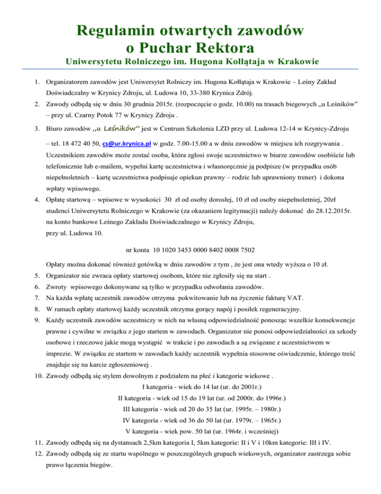 Regulamin otwartych zawodów o Puchar Rektora Uniwersytetu Rolniczego im. Hugona Kołłątaja w Krakowie 1. Organizatorem zawodów jest Uniwersytet Rolniczy im. Hugona Kołłątaja w Krakowie – Leśny Zakład Doświadczalny w Krynicy Zdroju, ul. Ludowa 10, 33-380 Krynica Zdrój. 2. Zawody odbędą się w dniu 30 grudnia 2015r. (rozpoczęcie o godz. 10.00) na trasach biegowych „u Leśników” – przy ul. Czarny Potok 77 w Krynicy Zdroju . 3. Biuro zawodów „u Leśników” jest w Centrum Szkolenia LZD przy ul. Ludowa 12-14 w Krynicy-Zdroju – tel. 18 472 40 50, [email protected] w godz. 7.00-15.00 a w dniu zawodów w miejscu ich rozgrywania . Uczestnikiem zawodów może zostać osoba, która zgłosi swoje uczestnictwo w biurze zawodów osobiście lub telefonicznie lub e-mailem, wypełni kartę uczestnictwa i własnoręcznie ją podpisze (w przypadku osób niepełnoletnich – kartę uczestnictwa podpisuje opiekun prawny – rodzic lub uprawniony trener) i dokona wpłaty wpisowego. 4. Opłatę startową – wpisowe w wysokości 30 zł od osoby dorosłej, 10 zł od osoby niepełnoletniej, 20zł studenci Uniwersytetu Rolniczego w Krakowie (za okazaniem legitymacji) należy dokonać do 28.12.2015r. na konto bankowe Leśnego Zakładu Doświadczalnego w Krynicy Zdroju, przy ul. Ludowa 10. nr konta 10 1020 3453 0000 8402 0008 7502 Opłaty można dokonać również gotówką w dniu zawodów z tym , że jest ona wtedy wyższa o 10 zł. 5. Organizator nie zwraca opłaty startowej osobom, które nie zgłosiły się na start . 6. Zwroty wpisowego dokonywane są tylko w przypadku odwołania zawodów. 7. Na każda wpłatę uczestnik zawodów otrzyma pokwitowanie lub na życzenie fakturę VAT. 8. W ramach opłaty startowej każdy uczestnik otrzyma gorący napój i posiłek regeneracyjny. 9. Każdy uczestnik zawodów uczestniczy w nich na własną odpowiedzialność ponosząc wszelkie konsekwencje prawne i cywilne w związku z jego startem w zawodach. Organizator nie ponosi odpowiedzialności za szkody osobowe i rzeczowe jakie mogą wystąpić w trakcie i po zawodach a są związane z uczestnictwem w imprezie. W związku ze startem w zawodach każdy uczestnik wypełnia stosowne oświadczenie, którego treść znajduje się na karcie zgłoszeniowej . 10. Zawody odbędą się stylem dowolnym z podziałem na płeć i kategorie wiekowe . I kategoria - wiek do 14 lat (ur. do 2001r.) II kategoria - wiek od 15 do 19 lat (ur. od 2000r. do 1996r.) III kategoria - wiek od 20 do 35 lat (ur. 1995r. – 1980r.) IV kategoria - wiek od 36 do 50 lat (ur. 1979r. – 1965r.) V kategoria - wiek pow. 50 lat (ur. 1964r. i wcześniej) 11. Zawody odbędą się na dystansach 2,5km kategoria I, 5km kategorie: II i V i 10km kategorie: III i IV. 12. Zawody odbędą się ze startu wspólnego w poszczególnych grupach wiekowych, organizator zastrzega sobie prawo łączenia biegów. 13. W przypadku zgłoszenia się mniejszej ilości osób niż 10 w danej kategorii wiekowej organizator zastrzega sobie prawo do łączenia kategorii wiekowych. 14. Szczegółowy program zawodów w poszczególnych grupach oraz mapki z przebiegiem tras podany będzie przed rozpoczęciem zawodów. 15. Na trasie organizator przewiduje sędziowskie punkty kontrolne. Ominięcie punktu skutkuje dyskwalifikacją w zawodach. 16. Pomiar czasu odbywa się metodą elektroniczną chipową. 17. W każdej kategorii zawodników nagrodzone zostaną 3 pierwsze miejsca. 18. Wśród wszystkich uczestników, którzy ukończą zawody zostaną rozlosowane nagrody rzeczowe. Zawodnik, który wylosuje nagrodę musi odebrać ją osobiście. 19. Na trasie i w jej pobliżu zabrania się używania pojemników szklanych i innych przedmiotów stanowiących zagrożenie dla życia i zdrowia zawodników lub kibiców. Wszelkie odpady należy gromadzić w przygotowanych do tego celu pojemnikach i koszach. 20. Każdy uczestnik zawodów zobowiązany jest do kulturalnego zachowania się na imprezie, przestrzegania zasad fair-play, ochrony środowiska naturalnego i do zastosowania się do niniejszego regulaminu. Obowiązuje bezwzględny zakaz spożywania alkoholu. 21. Komisja Sędziowska w porozumieniu z organizatorami może zarządzić karę upomnienia lub dyskwalifikacji zawodnika. Wszelkiego rodzaju protesty dotyczące przebiegu zawodów należy składać w Biurze Zawodów w dniu imprezy po opłaceniu kwoty 500zł, jeżeli protest zostanie uznany opłata zostanie zwrócona. Protesty dotyczące wyników mogą być składane do Biura Zawodów do 15 minut od czasu ogłoszenia wyników, wszelkie protesty wymagają formy pisemnej. Decyzja w sprawie uznania bądź nieuznania protestu należy do Sędziego Głównego i Organizatora Zawodów. 22. Organizator zastrzega sobie prawo do odwołania zawodów w przypadku niesprzyjających warunków atmosferycznych co zostanie ogłoszone na stronach internetowych www.lzdkrynica.ur.krakow.pl www.krynica.ur.krakow.pl www.facebook.com/ulesnikow do godz. 15.00 w dniu 28.12.2015r.