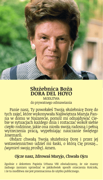 Służebnica Boża DEL LaDORA Sierva deHOYO Dios MODLITWA Dora del Hoyo do prywatnego odmawiania Panie nasz, Ty powołałeś Twoją służebnicę Dorę do ORACIÓN tych zajęć, które parawykonywała la devociónNajświętsza privada Maryja Panna w domu w Nazarecie, pomóż mi odnajdywać Ciebie w sytuacjach każdego dnia i roztaczać wokół siebie eñor nuestro, quejakie llamaste a tu sierva a ocuparse ciepło rodzinne, ona niosła swoją Dora radosną i pełną e laswyrzeczenia tareas que pracą, realizówypełniając la Bienaventurada Virgen María nauczanie świętego Josemaríi. n el hogar de Nazareth, ayúdame a encontrarte en las Obdarz chwałą Twoją służebnicę Dorę i przez jej tuaciones denictwo cada jornada, a difundir mi proszę... alrededor wstawien udziel miyłaski, o którąa Cię (wymień swoją prośbę). calor de familia que ellaAmen. hizo presente con su trabajo egre y abnegado, las enseñanzas de San JoOjcze nasz,siguiendo Zdrowaś Maryjo, Chwała Ojcu emaría. Glorifica a tu sierva Dora y concédeme, por su Zgodnie z dekretem Papieża Urbana VIII oświadczamy, że nie mamy ntercesión, el favor quewtejakikolwiek pido (pídase). Así sea. żadnego zamiaru uprzedzać sposób orzeczenia Kościoła, i że ta modlitwa nie jest przeznaczona do użytku publicznego. Padre Nuestro, Ave María, Gloria. Dla Boga żadne zajęcie samo z siebie nie jest ani wielkie, ani małe. Wszystkim nadaje wartość dopiero Miłość, z jaką się je wykonuje. Św. Josemaría Escrivá (Bruzda, 487) Dora del Hoyo Alonso urodziła się 11 stycznia 1914 roku w Boca del Huérgano (León, Hiszpania). Jej rodzice - przykładni chrześcijanie - od dzieciństwa uczyli ją, jak być dobrą córką Boga. 14 marca 1946 roku w Bilbao poprosiła o przyjęcie do Opus Dei. Od pierwszej chwili wiernie odpowiedziała na Boże powołanie poszukując świętości poprzez wykonywanie prac domowych, będących jej zawodem. Cechowała ją pobożność eucharystyczna - Msza św. była centrum i korzeniem jej życia wewnętrznego -, a także serdeczna miłość do Najświętszej Maryi Panny i św. Józefa oraz ufne zawierzenie swojemu Aniołowi Stróżowi. 27 grudnia 1946r., na zaproszenie św. Josemaríi, pojechała do Rzymu, gdzie mieszkała do końca życia. Łącząc swoje zawodowe zdolności z duchem służby, potrafiła odkryć uświęcający i apostolski sens, ukryty nawet w pozornie banalnych zajęciach. Mieszkając w Rzymie współpracowała w formacji kobiet z całego świata i przyczyniła się do rozwoju pracy apostolskiej Opus Dei we wszystkich kręgach społecznych. Zmarła 10 stycznia 2004 roku. Jej doczesne szczątki spoczywają w krypcie kościoła prałackiego Matki Bożej Królowej Pokoju, przy Viale Bruno Buozzi 75 w Rzymie. Jej proces kanonizacyjny rozpoczął się 18 czerwca 2012 roku w Rzymie. Osoby, które otrzymają łaski dzięki jej wstawiennictwu, proszone są o powiadomienie o tym Biura ds. kanonizacji Prałatury Opus Dei w Polsce, ul. Górnośląska 43; 00-432 Warszawa. E-mail: [email protected]; www.opusdei.pl. Za pozwoleniem władzy Kościelnej.