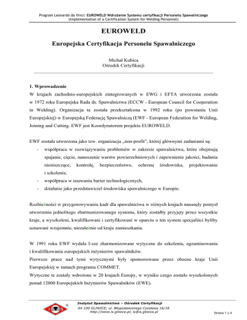 Program Leonardo da Vinci: EUROWELD Wdrożenie Systemu certyfikacji Personelu Spawalniczego (Implementation of a Certification System for Welding Personnel) EUROWELD Europejska Certyfikacja Personelu Spawalniczego Michał Kubica Ośrodek Certyfikacji ________________________________________________________________________ 1. Wprowadzenie W krajach zachodnio-europejskich zintegrowanych w EWG i EFTA utworzona została w 1972 roku Europejska Rada ds. Spawalnictwa (ECCW - European Council for Cooperation in Welding). Organizacja ta została przekształcona w 1992 roku (po powstaniu Unii Europejskiej) w Europejską Federację Spawalniczą (EWF - European Federation for Welding, Joining and Cutting. EWF jest Koordynatorem projektu EUROWELD. EWF została utworzona jako tzw. organizacja „non-profit”, której głównymi zadaniami są: - współpraca w rozwiązywaniu problemów w zakresie spawalnictwa, które obejmują spajanie, cięcie, nanoszenie warstw powierzchniowych i zapewnienie jakości, badania nieniszczące, kontrolę, bezpieczeństwo, ochronę środowiska, projektowanie i szkolenie, - współpraca w usuwaniu barier technologicznych, - działanie jako przedstawiciel środowiska spawalniczego w Europie. Rozbieżności w przygotowywaniu kadr dla spawalnictwa w różnych krajach nasunęły pomysł utworzenia jednolitego zharmonizowanego systemu, który zostałby przyjęty przez wszystkie kraje, a wyszkoleni, kwalifikowani i certyfikowani w oparciu o ten system specjaliści byliby uznawani wzajemnie, niezależnie od kraju zamieszkania. W 1991 roku EWF wydała I-sze zharmonizowane wytyczne do szkolenia, egzaminowania i kwalifikowania europejskich inżynierów spawalników. Pierwsze prace nad tymi wytycznymi były sponsorowane przez obecne kraje Unii Europejskiej w ramach programu COMMET. Wytyczne te zostały wdrożone w 20 krajach Europy, w wyniku czego zostało wyszkolonych ponad 12000 Europejskich Inżynierów Spawalników (EWE). ® Instytut Spawalnictwa – Ośrodek Certyfikacji 44-100 GLIWICE; ul. Błogosławionego Czesława 16/18 http://www.is.gliwice.pl; [email protected] Strona 1 z 4 Program Leonardo da Vinci: EUROWELD Wdrożenie Systemu certyfikacji Personelu Spawalniczego (Implementation of a Certification System for Welding Personnel) W następstwie tego EWF podjęła się zadania opracowania Wytycznych do szkolenia i kwalifikowania personelu spawalniczego na różnych poziomach i w różnych metodach spajania. W 1997 roku doszło do porozumienia pomiędzy Europejską Federacją Spawalniczą (EWF) i Międzynarodowym Instytutem Spawalnictwa (IIW), a w 1999 roku podjęto decyzję o łączeniu obydwu systemów i w wyniku tych prac powstał jednolity w świecie system kształcenia, egzaminowania i kwalifikowania personelu spawalniczego, który został oparty na wytycznych EWF. Uzyskanie przez personel spawalniczy kwalifikacji EWF świadczy o tym, że posiada on właściwą dla swojego stopnia kwalifikacji wiedzę dotyczącą technologii spawalniczych. Dotychczas potwierdzeniem tej wiedzy były tylko dyplomy, które wydawane były bez terminu ważności, stąd nawet w przypadku, gdy osoba przez wiele lat nie była związana ze spawalnictwem zachowywała uzyskany tytuł inżyniera, technologa lub mistrza spawalnika. Dyplomy zatem nie dają o jego Posiadaczu informacji, które świadczyłoby o jego aktualnej wiedzy i kompetencjach. Doświadczenia EWF i silny związek przedstawicielami organizacji spawalniczych w różnych krajach stał się podstawą utworzenia projektu EUROWELD, którego zadaniem stało się opracowanie i wdrożenie wzajemnie uznawanego Systemu Certyfikacji Personelu Spawalniczego. Pomysł ten został zaakceptowany przez Instytuty Spawalnictwa z 6 krajów i przez 9 europejskich wytwórców i użytkowników technologii spawalniczych. 2. Cele i osiągnięcia projektu EUROWELD Europejski projekt określający zharmonizowany System Certyfikacji personelu spawalniczego skupił wokół siebie 17 partnerów z 6 krajów Europy do, których należą: Portugalia, Polska, Węgry, Belgia i Anglia. Projekt został zgłoszony do Komisji Europejskiej w maju 2002. Po jego zatwierdzeniu, prace rozpoczęły się w grudniu 2002 i zakończyły po 24 miesiącach, w listopadzie 2004 roku. Szczególnymi osiągniami projektu są: - Program kursu CEWE (Certyfikowany Europejski Inżynier Spawalnik), - Program kursu CEWT (Certyfikowany Europejski Technolog Spawalnik), - Program kursu CEWS (Certyfikowany Europejski Mistrz Spawalnik), ® Instytut Spawalnictwa – Ośrodek Certyfikacji 44-100 GLIWICE; ul. Błogosławionego Czesława 16/18 http://www.is.gliwice.pl; [email protected] Strona 2 z 4 Program Leonardo da Vinci: EUROWELD Wdrożenie Systemu certyfikacji Personelu Spawalniczego (Implementation of a Certification System for Welding Personnel) - Program kursu CEWP (Certyfikowany Europejski Instruktor Spawalnik), - System egzaminacyjnej bazy pytań i odpowiedzi do kursów CEWE i CEWT - kursy szkolenia prowadzące od uzyskania Europejskich Certyfikatów W tablicy 1 zamieszczono tematy i ilość godzin szkolenia w poszczególnych programach kursów. Tablica 1 Minimalne ilości godzin lekcyjnych przypadających na poszczególne grupy tematyczne na kursach CEWE, CEWT, CEWS i CEWP Grupa tematyczna Kategoria personelu spawalniczego/ liczba godzin CEWE CEWT CEWS CEWP Procesy spawalnicze i urządzenia 99 80 45 22 Materiały i ich spawalność 111 80 45 22 Projektowanie i konstruowanie 64 40 22 8 Produkcja i stosowanie technologii spawalniczej 110 80 50 32 Pokazy praktyki spawalniczej 60 60 60 - Część praktyczna - - - 60 Powtórka przedegzaminacyjna - - - 2 Łączna liczba godzin 444 340 222 146 Egzamin teoretyczny pisemny po kursach, obejmuje ww. 4 tematy szkolenia i oparty jest na międzynarodowej egzaminacyjnej bazie danych pytań i odpowiedzi zawierającej ponad 1800 pytań. Baza pytań i odpowiedzi jest ciągle aktualizowana, a system jej zarządzania pozwala na tworzenie zestawów egzaminacyjn