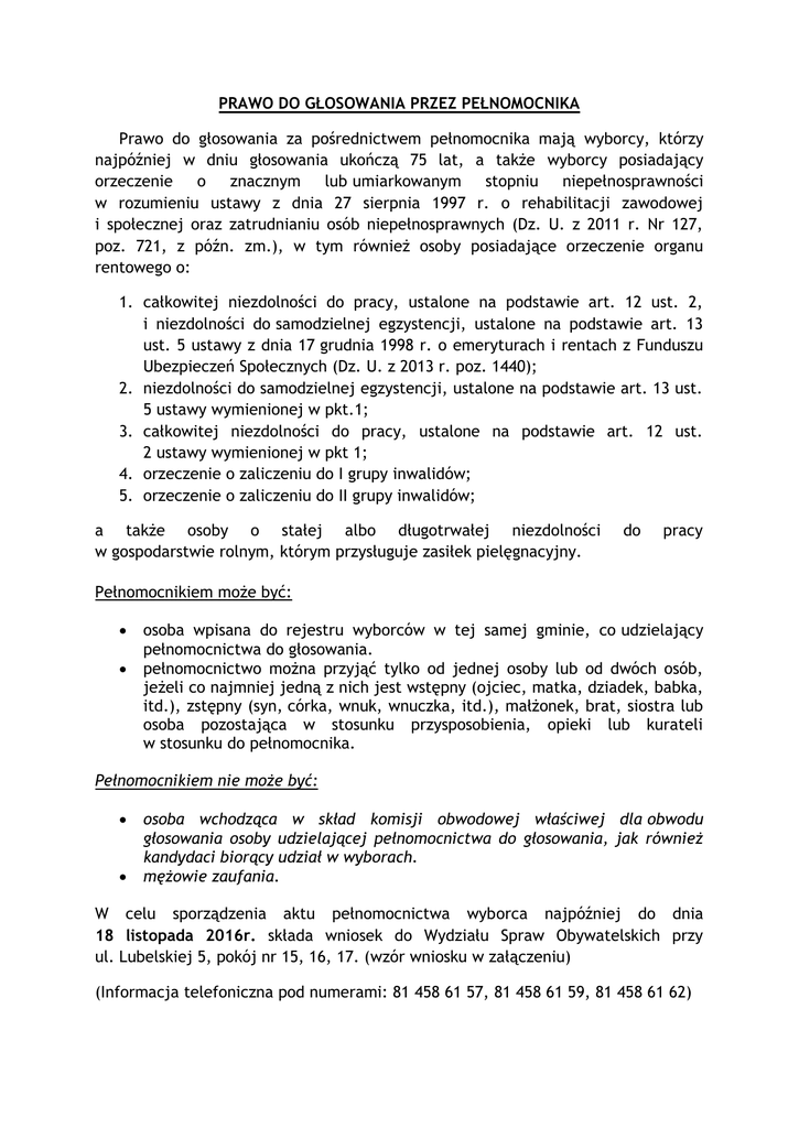 PRAWO DO GŁOSOWANIA PRZEZ PEŁNOMOCNIKA Prawo do głosowania za pośrednictwem pełnomocnika mają wyborcy, którzy najpóźniej w dniu głosowania ukończą 75 lat, a także wyborcy posiadający orzeczenie o znacznym lub umiarkowanym stopniu niepełnosprawności w rozumieniu ustawy z dnia 27 sierpnia 1997 r. o rehabilitacji zawodowej i społecznej oraz zatrudnianiu osób niepełnosprawnych (Dz. U. z 2011 r. Nr 127, poz. 721, z późn. zm.), w tym również osoby posiadające orzeczenie organu rentowego o: 1. całkowitej niezdolności do pracy, ustalone na podstawie art. 12 ust. 2, i niezdolności do samodzielnej egzystencji, ustalone na podstawie art. 13 ust. 5 ustawy z dnia 17 grudnia 1998 r. о emeryturach i rentach z Funduszu Ubezpieczeń Społecznych (Dz. U. z 2013 r. poz. 1440); 2. niezdolności do samodzielnej egzystencji, ustalone na podstawie art. 13 ust. 5 ustawy wymienionej w pkt.1; 3. całkowitej niezdolności do pracy, ustalone na podstawie art. 12 ust. 2 ustawy wymienionej w pkt 1; 4. orzeczenie o zaliczeniu do I gruру inwalidów; 5. orzeczenie o zaliczeniu do II grupy inwalidów; a także osoby о stałej albo długotrwałej niezdolności w gospodarstwie rolnym, którym przysługuje zasiłek pielęgnacyjny. do pracy Pełnomocnikiem może być: osoba wpisana do rejestru wyborców w tej samej gminie, co udzielający pełnomocnictwa do głosowania. pełnomocnictwo można przyjąć tylko od jednej osoby lub od dwóch osób, jeżeli co najmniej jedną z nich jest wstępny (ojciec, matka, dziadek, babka, itd.), zstępny (syn, córka, wnuk, wnuczka, itd.), małżonek, brat, siostra lub osoba pozostająca w stosunku przysposobienia, opieki lub kurateli w stosunku do pełnomocnika. Pełnomocnikiem nie może być: osoba wchodząca w skład komisji obwodowej właściwej dla obwodu głosowania osoby udzielającej pełnomocnictwa do głosowania, jak również kandydaci biorący udział w wyborach. mężowie zaufania. W celu sporządzenia aktu pełnomocnictwa wyborca najpóźniej do dnia 18 listopada 2016r. składa wniosek do Wydziału Spraw Obywatelskich przy ul. Lubelskiej 5, pokój nr 15, 16, 17. (wzór wniosku w załączeniu) (Informacja telefoniczna pod numerami: 81 458 61 57, 81 458 61 59, 81 458 61 62) Do wniosku należy dołączyć: pisemną zgodę od osoby mającej być pełnomocnikiem (wzór zgody w załączeniu); kopię aktualnego orzeczenia właściwego organu orzekającego o ustaleniu stopnia niepełnosprawności, jeżeli wyborca udzielający pełnomocnictwa w dniu głosowania nie będzie miał ukończonych 75 lat; Akt pełnomocnictwa jest sporządzany w miejscu zamieszkania osoby, która złożyła wniosek w tej sprawie lub w innym miejscu na obszarze gminy, jeżeli osoba ta zwróci się o to we wniosku o jego sporządzenie. Wyborca ma prawo cofnięcia udzielonego pełnomocnictwa. Cofnięcie pełnomocnictwa następuje przez złożenie stosownego oświadczenia Prezydentowi Miasta lub przez doręczenie takiego oświadczenia Obwodowej Komisji Wyborczej Nr 9 w dniu głosowania. Wyborca, który udzielił pełnomocnictwa może głosować osobiście w lokalu komisji obwodowej, jeżeli wcześniej nie oddał głosu pełnomocnik. Głosowanie osobiste przez wyborcę, który udzielił pełnomocnictwa powoduje jego wygaśnięcie. Szczegółowe zasady w sprawie sporządzenia aktu pełnomocnictwa do głosowania określa rozporządzenie Ministra Spraw Wewnętrznych i Administracji z dnia 28 lipca 2011 r. w sprawie sporządzenia aktu pełnomocnictwa do głosowania w wyborach: do Sejmu Rzeczypospolitej Polskiej i do Senatu Rzeczypospolitej Polskiej, Prezydenta Rzeczypospolitej Polskiej, do Parlamentu Europejskiego w Rzeczypospolitej Polskiej, do organów stanowiących jednostek samorządu terytorialnego oraz wójtów, burmistrzów i prezydentów miast (Dz. U. Nr 157, poz. 936 i z 2014 r. poz. 1428). WNIOSEK O SPORZĄDZENIE AKTU PEŁNOMOCNICTWA DO GŁOSOWANIA W WYBORACH UZUPEŁNIAJĄCYCH DO RADY MIASTA PUŁAWY ZARZĄDZONYCH NA (podać datę wyborów): Miejsce składania wniosku * Wójt/Burmistrz/Prezydent Miasta , do którego kierowany jest wniosek: Dane wyborcy udzielającego pełnomocnictwa do głosowania Imię (imiona): Nazwisko: Imię ojca: Data urodzenia (dzień-miesiąc-rok): Numer PESEL: Adres zamieszkania: Dane osoby, która wyraziła zgodę na przyjęcie pełnomocnictwa Imię (imiona): Nazwisko: Imię ojca: Data urodzenia (dzień-miesiąc-rok): Numer PESEL: Adres zamieszkania: Osoba, która wyraziła zgodę na przyjęcie pełnomocnictwa, jest dla wyborcy wstępnym **, zstępnym***, małżonkiem, bratem, siostrą albo osobą pozostającą w stosunku przysposobienia, opieki albo kurateli: TAK NIE* Do wniosku załączono: 1. pisemną zgodę osoby, która wyraziła zgodę na przyjęcie pełnomocnictwa; 2. kopię aktualnego orzeczenia właściwego organu orzekającego o ustaleniu stopnia niepełnosprawności wyborcy (nie dotyczy wyborcy, który najpóźniej w dniu głosowania kończy 75 lat); 3. kopię zaświadczenia o prawie do głosowania wydanego osobie, która wyraziła zgodę na przyjęcie pełnomocnictwa (załącza się wyłącznie w przypadku, gdy osoba, która wyraziła zgodę na przyjęcie pełnomocnictwa, nie jest wpisana do rejestru wyborców w tej samej gminie co wyborca udzielający pełnomocnictwa do głosowania); 4. kopię dokumentu potwierdzającego pozostawanie wyborcy z osobą, która wyraziła zgodę na przyjęcie pełnomocnictwa w stosunku przysposobienia/opieki/kurateli* (załącza się wyłącznie w przypadku, gdy taki stosunek istnieje). Miejsce sporządzenia aktu pełnomocnictwa do głosowania (wypełnić jedynie w przypadku, gdy ma być ono inne niż miejsce zamieszkania wyborcy udzielającego pełnomocnictwa do głosowania): Oświadczenia Oświadczam, że wszystkie dane zawarte we wniosku są zgodne z prawdą. Wyborca wyraża zgodę na to by w postępowaniu w sprawie sporządzenia aktu pełnomocnictwa był reprezentowany przez osobę, która wyraziła zgodę 