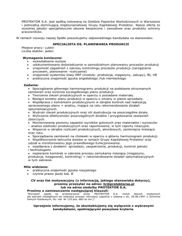PROTEKTOR S.A. jest spółką notowaną na Giełdzie Papierów Wartościowych w Warszawie i jednostką dominującą międzynarodowej Grupy Kapitałowej Protektor. Nasza oferta to wysokiej jakości specjalistyczne obuwie bezpieczne i zawodowe oraz produkty ochrony pracowników. W ramach rozwoju naszej Spółki poszukujemy odpowiedniego Kandydata na stanowisko: SPECJALISTA DS. PLANOWANIA PRODUKCJI Miejsce pracy: Lublin Liczba etatów: jeden Wymagania konieczne: wykształcenie wyższe udokumentowane doświadczenie w samodzielnym planowaniu procesów produkcji znajomość zagadnień z zakresu kontrolingu procesów produkcji (zarządzanie procesem, planowanie- rozliczanie) znajomość systemów klasy ERP (moduły: produkcja, magazyny, zakupy), BI, VB praktyczna znajomość języka angielskiego /lub niemieckiego Zadania: Sporządzanie głównego harmonogramu produkcji na podstawie otrzymanych zamówień oraz kontrola szczegółowego planu produkcji. Tworzenie zleceń produkcyjnych w oparciu o posiadane materiały. Bieżące korekty planu produkcji w oparciu o zmiany w planie sprzedaży. Współpraca z komórkami produkcyjnymi w obrębie kontroli nad realizacją opracowanego planu + analizy, mające na celu rekomendowanie działań optymalizacyjnych. Wydruki zleceń produkcyjnych oraz ich dystrybucja na poszczególne działy. Wyliczanie efektywności poszczególnych działów i przygotowanie zestawień zbiorczych. Monitorowanie poziomu zapasów wyrobów gotowych oraz materiałów i surowców – analiza zdolności produkcyjnych oraz raportowanie, w tym raporty rotacyjne. Wsparcie w obrębie rozliczeń produkcyjnych, akordowych, zamknięcia miesiąca oraz roku. Sporządzanie zamówień na cholewki w oparciu o główny harmonogram produkcji. Współtworzenie łańcucha dostaw w ramach Grupy Kapitałowej Protektor oraz udział w monitorowaniu jego prawidłowego funkcjonowania. współpraca z działami: sprzedaży, zaopatrzenia, produkcji, kontroli jakości i technologami. wspieranie komórek w zakresie procesu zamykania miesiąca (magazyny, produkcja, księgowość, kontroling) + rekomendowanie działań optymalizacyjnych w tym zakresie. Mile widziane: praktyczna znajomość języka rosyjskiego czynne prawo jazdy kat. B CV oraz list motywacyjny (z informacją, jakiego stanowiska dotyczy), prosimy przesyłać na adres: [email protected] lub na adres siedziby PROTEKTOR S.A. Prosimy o zamieszczenie następującej klauzuli: "Wyrażam zgodę na przetwarzanie przez PROTEKTOR S.A. moich danych osobowych dla potrzeb niezbędnych do realizacji procesu rekrutacji (zgodnie z Ustawą z dn. 29.08.1997 o Ochronie Danych Osobowych, Dz. Ust. Nr 133 poz. 883 ze zm.)”. Uprzejmie informujemy, że skontaktujemy się wyłącznie z wybranymi kandydatami, spełniającymi powyższe kryteria.