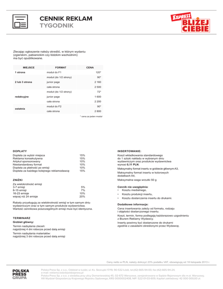 CENNIK REKLAM TYGODNIK Zlecając ogłoszenie należy określić, w którym wydaniu (zgierskim, pabianickim czy łódzkim wschodnim) ma być opublikowane. MIEJSCE FORMAT 1 strona CENA moduł do F1 120* moduł (do 1/2 strony) 2 lub 3 strona 90* junior page 2 160 cała strona 2 500 moduł (do 1/2 strony) redakcyjne 72* junior page 1 600 cała strona 2 200 moduł do F2 ostatnia 90* cała strona 2 800 * cena za jeden moduł DOPŁATY INSERTOWANIE: Dopłata za wybór miejsca Reklama konsekutywna Artykuł sponsorowany Niestandardowy format Dopłata za płatność po emisji Dopłata za każdego kolejnego reklamodawcę 15% 15% 10% 10% 10% 15% Koszt wkładkowania standardowego do 1 sztuki nakładu w wybranym dniu wydawniczym oraz produkcie wydawnictwa wynosi 0,11 PLN. Maksymalny format insertu w grzbiecie głównym A3, Maksymalny format insertu w kolorowych dodatkach A4, Maksymalna waga wrzutki 50 g ZNIŻKI Za wielokrotność emisji 3-7 emisji 8-15 emisji 16-23 emisje więcej niż 24 emisje 5% 7% 10% 20% Cennik nie uwzględnia: •Kosztu medialnego, • Kosztu produkcji insertu, • Kosztu dostarczenia insertu do drukarni. Rabaty przysługują za wielokrotność emisji w tym samym dniu wydawniczym oraz w tym samym produkcie wydawnictwa. Wartość cennikowa poszczególnych emisji musi być identyczna. Dodatkowe informacje: TERMINARZ Koszt, termin, forma podlegają każdorazowo uzgodnieniu z Biurem Reklamy Wydawcy. Grzbiet główny: Termin nadsyłania zleceń: najpóźniej 4 dni robocze przed datą emisji Cena insertowania zależy od formatu, rodzaju i objętości dostarczonego insertu. Inserty powinny być dostarczone do drukarni zgodnie z zasadami określonymi przez Wydawcę. Termin nadsyłania materiałów: najpóźniej 3 dni robocze przed datą emisji Ceny netto w PLN, należy doliczyć 23% podatku VAT, obowiązują od 18 listopada 2013 r. Polska Press Sp. z o.o., Oddział w Łodzi, ul. Ks. Skorupki 17/19, 90-532 Łódź, tel.(42) 665-94-00, fax (42) 665-94-24, e-mail: [email protected] Polska Press Sp. z o.o. z siedzibą przy ulicy Domaniewskiej 45, 02-672 Warszawa, zarejestrowana w Sądzie Rejonowym dla m.st. Warszawy, XIII Wydział Gospodarczy Krajowego Rejestru Sądowego, KRS 0000002408, NIP: 522-01-03-609, Kapitał zakładowy: 42 000 000,00 zł.
