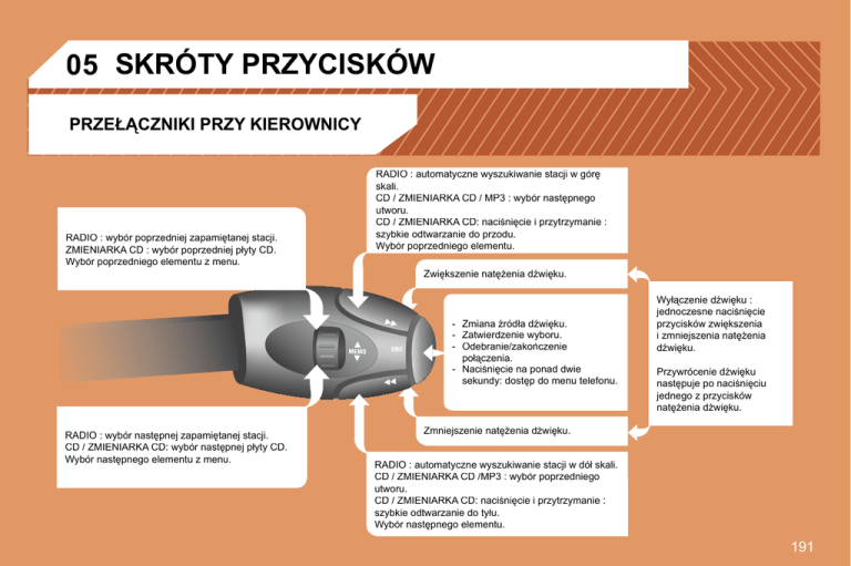 05 SKRÓTY PRZYCISKÓW PRZEŁĄCZNIKI PRZY KIEROWNICY RADIO : wybór poprzedniej zapamiętanej stacji. ZMIENIARKA CD : wybór poprzedniej płyty CD. Wybór poprzedniego elementu z menu. RADIO : automatyczne wyszukiwanie stacji w górę skali. CD / ZMIENIARKA CD / MP3 : wybór następnego utworu. CD / ZMIENIARKA CD: naciśnięcie i przytrzymanie : szybkie odtwarzanie do przodu. Wybór poprzedniego elementu. Zwiększenie natężenia dźwięku. - Zmiana źródła dźwięku. - Zatwierdzenie wyboru. - Odebranie/zakończenie połączenia. - Naciśnięcie na ponad dwie sekundy: dostęp do menu telefonu. RADIO : wybór następnej zapamiętanej stacji. CD / ZMIENIARKA CD: wybór następnej płyty CD. Wybór następnego elementu z menu. Wyłączenie dźwięku : jednoczesne naciśnięcie przycisków zwiększenia i zmniejszenia natężenia dźwięku. Przywrócenie dźwięku następuje po naciśnięciu jednego z przycisków natężenia dźwięku. Zmniejszenie natężenia dźwięku. RADIO : automatyczne wyszukiwanie stacji w dół skali. CD / ZMIENIARKA CD /MP3 : wybór poprzedniego utworu. CD / ZMIENIARKA CD: naciśnięcie i przytrzymanie : szybkie odtwarzanie do tyłu. Wybór następnego elementu. 191