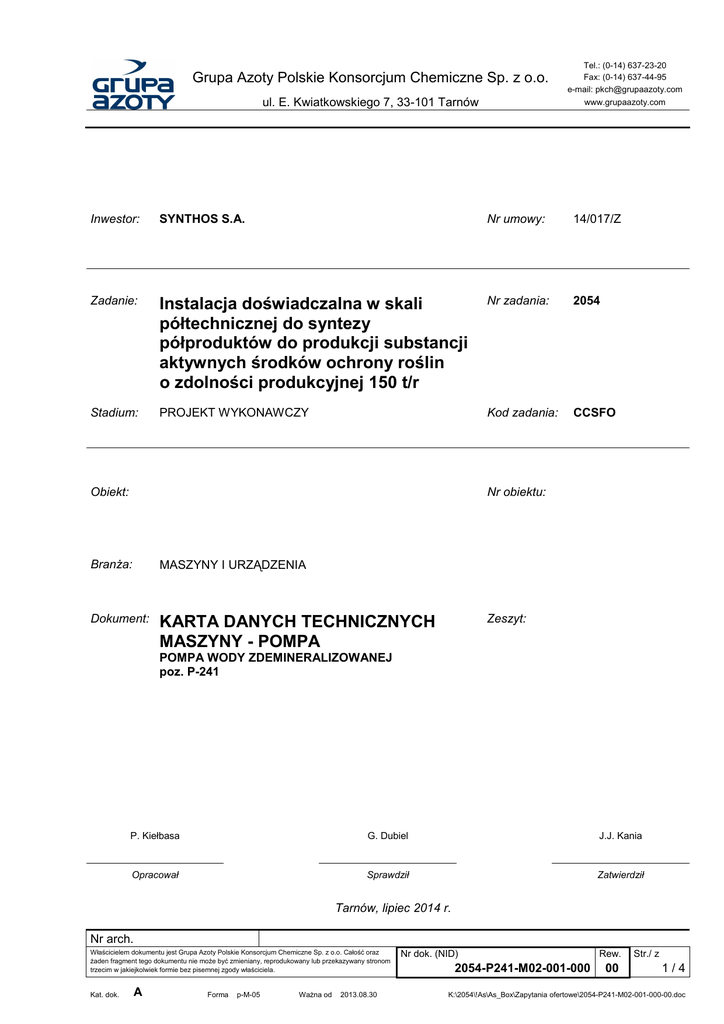 Grupa Azoty Polskie Konsorcjum Chemiczne Sp. z o.o. Tel.: (0-14) 637-23-20 Fax: (0-14) 637-44-95 e-mail: [email protected] ul. E. Kwiatkowskiego 7, 33-101 Tarnów www.grupaazoty.com Inwestor: SYNTHOS S.A. Nr umowy: 14/017/Z Zadanie: Instalacja doświadczalna w skali półtechnicznej do syntezy półproduktów do produkcji substancji aktywnych środków ochrony roślin o zdolności produkcyjnej 150 t/r Nr zadania: 2054 Stadium: PROJEKT WYKONAWCZY Kod zadania: CCSFO Obiekt: Nr obiektu: Branża: MASZYNY I URZĄDZENIA Dokument: KARTA DANYCH TECHNICZNYCH MASZYNY - POMPA Zeszyt: POMPA WODY ZDEMINERALIZOWANEJ poz. P-241 P. Kiełbasa G. Dubiel J.J. Kania Opracował Sprawdził Zatwierdził Tarnów, lipiec 2014 r. Nr arch. Właścicielem dokumentu jest Grupa Azoty Polskie Konsorcjum Chemiczne Sp. z o.o. Całość oraz żaden fragment tego dokumentu nie może być zmieniany, reprodukowany lub przekazywany stronom trzecim w jakiejkolwiek formie bez pisemnej zgody właściciela. Kat. dok. A Forma p-M-05 Ważna od 2013.08.30 Nr dok. (NID) 2054-P241-M02-001-000 Rew. 00 Str./ z 1/4 K:\2054\!As\As_Box\Zapytania ofertowe\2054-P241-M02-001-000-00.doc Instalacja doświadczalna w skali półtechnicznej do syntezy półproduktów do produkcji substancji aktywnych środków ochrony roślin o zdolności produkcyjnej 150 t/r CCSFO Karta Danych Technicznych Maszyny – Pompa ZESTAWIENIE REWIZJI ZESTAWIENIE REWIZJI Opracował Sprawdził Rew. Imię i nazwisko Imię i nazwisko Imię i nazwisko Zatwierdził Data Status 00 P. Kiełbasa G. Dubiel J.J. Kania 07.2014 IFI Właścicielem dokumentu jest Grupa Azoty Polskie Konsorcjum Chemiczne Sp. z o.o. Całość oraz żaden fragment tego dokumentu nie może być zmieniany, reprodukowany lub przekazywany stronom trzecim w jakiejkolwiek formie bez pisemnej zgody właściciela. Kat. dok. A Forma p-M-05 Ważna od 2013.08.30 Opis Wydanie dla zapytania ofertowego Nr dok. (NID) 2054-P241-M02-001-000 Rew. 00 Str./ z 2/4 K:\2054\!As\As_Box\Zapytania ofertowe\2054-P241-M02-001-000-00.doc Instalacja doświadczalna w skali półtechnicznej do syntezy półproduktów do produkcji substancji aktywnych środków ochrony roślin o zdolności produkcyjnej 150 t/r CCSFO Karta Danych Technicznych Maszyny – Pompa Uw Rew Nr sekcji Poz. sch. Il. prac. 1 Nazwa 240 P-241 Il. rez. 0 Il. wym. 1 Korozyjna Newtonowska Temperatura [0C] Min. Norm. Maks. 15 20 25 Absorpcja chlorowodoru Pompa wody zdemineralizowanej Wytwórca 2 MEDIUM POMPOWANE Skład Woda 100 % [% wag] Wtrącenia stałe Maks. wymiar cząstki % wag. mm - Erozyjna Krystalizująca Wybuchowa Woda zdemineralizowana Charakterystyka Nazwa sekcji Wyposażenie Typ/Wielkość Toksyczna 4 Palna Nienewtonowska Żrąca Gęstość [kg/m3] przy temp. Lepkość [mPa s] przy temp. Min. Norm. Max. Min. Norm. Max. 998,1 996,6 994,9 1,15 1,02 0,91 5 6 7 8 9 10 11 Prężność par [kPa(A)] przy temp. Min. Norm. Max. 1,71 2,34 3,17 W ARUNKI PRACY Wydajność [l/h] Nom. Maks. 60 100 Ciś. tłoczenia [Bar(A)] 4,59 Ciś. ssania [Bar(A)] Norm. Maks. 0,97 1,06 % Lokalizacja 12 Różnica ciśnień [Bar] 3,62 Wysokość podn. [m] 37 NPSHa [m] 9,0 Moc hydr. [kW] 0,01 Min. 40 Praca Okresowa Okres pracy Pod zadaszeniem Ciągła Wewnątrz Na zewnątrz Instalacja Higieniczna Stacjonarna Ręczna Na stoliku Na zbiorniku In-line Przewoźna Przenośna Otoczenie Zapylenie Poziom natężenia hałasu dBA ≤80 Temp. otoczenia 0C 0 ÷ 35 Wybuchowe Żrące Wilgoć KONSTRUKCJA Typ pompy Odśrodkowa Hermetyczna Wykonanie wg PN/EN/ISO Wyporowa Śrubowa Dozująca Śmigłowa DIN Króćce DN 15 Zabezpieczenia Ogrzewanie PN Gwinty Ssanie Pow. uszcz. Smarowanie Uszczelnienie Materiały Położenie DN 15 Do węży EN 1092-1 Tłoczenie PN Pow. uszcz. Położenie Przed suchobiegiem Przed przegrzaniem Woda gorąca Para Olej Czynnik grzewczy Przepływ m3/h 2 6 Stały poziom oleju Smarem stałym API Kod wg DIN/ISO Bar(G) Temp. 0C Osłona sprzęgła 4 PN Bypass Zawór zwrotny Elektryczne Ciśnienie Bar(G) Zawór bezp. 0C Różnica temperatur Ruroc. wody chł. wg API Plan 0C Różnica temperatur NAPĘD Mocowanie kołnierzowe Termiczne zabezpieczenie uzwojenia 3) Zapotrz. powietrza spręż. m3/h 3) Turbinowy kg Silnik kg Przekładnia kg Turbina kg 2 37 5,7 38 39 40 41 5,8 42 2 43 Pomiar poboru prądu Parowy Gazowy MASY Pompa Całość kg 44 UW AGI 45 46 47 48 49 50 51 52 53 1. Dostawca winien podać dopuszczalne siły i momenty działające na króćce, wartość NPSHR (pompy), sprawność w punkcie nominalnym, minimalny przepływ ciągły oraz poziom natężenia hałasu! 2. Uzupełni Dostawca. 3. Określi Dostawca. 4. Materiał części stykających się z medium tłoczonym: stal 1.4301 lub lepsza. 5. Dopuszczalne jest zastosowanie pompy dozującej o napędzie elektrycznym jak i pneumatycznym (membranowa). 6. W przypadku pompy o napędzie elektrycznym, pompa musi być wyposażona w zawór bezpieczeństwa o nastawie 7,5 bar(G) dla ochrony rurociągu tłocznego przed nadmiernym wzrostem ciśnienia. W przypadku pompy generującej pulsacje w rurociągu tłocznym, w zakresie oferty musi zostać Właścicielem dokumentu jest Grupa Azoty Polskie Konsorcjum Chemiczne Sp. z o.o. Całość oraz żaden fragment tego dokumentu nie może być zmieniany, reprodukowany lub przekazywany stronom trzecim w jakiejkolwiek formie bez pisemnej zgody właściciela. Kat. dok. A Forma p-M-05 Ważna od 2013.08.30 19 Tłumik pulsacji DN ANSI Spust Zawór Korek Pow. uszcz. Położenie Elektryczny Ex Typ obudowy Standard Tak Silnik wymagany Nie Wykonanie silnika Fazy 3 Napięcie V 230 / 400 Częstotliwość Hz 50 Prędkość obr. min-1 3) Moc kW 3) Stopień ochrony / Klasa izolacji IP 54 / F Strefa zagrożenia wybuchem Klasa temperaturowa Grupa wybuchowości bar 2 m 13 14 15 16 17 18 20 21 22 23 24 25 26 27 28 29 30 31 32 33 34 35 36 ISO 7005-1 m3/h Ciśnienie Bar(G) Pierścień oleju Zanurzeniowe Mgłą olejową Rozbryzgowe Mech. podwójne Przemywanie Dławnicowe Mech. pojedyńcze Czynnik przemywający Przepływ m3/h C