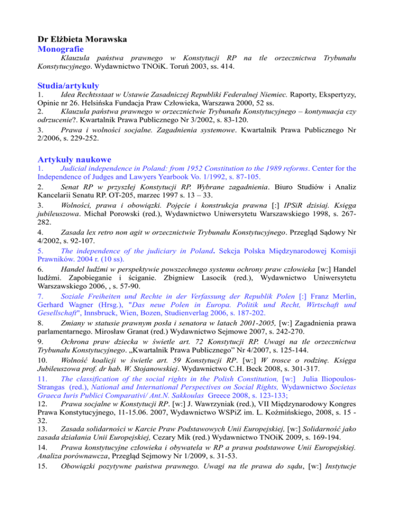 Dr Elżbieta Morawska Monografie Klauzula państwa prawnego w Konstytucji RP na tle orzecznictwa Trybunału Konstytucyjnego. Wydawnictwo TNOiK. Toruń 2003, ss. 414. Studia/artykuły 1. Idea Rechtsstaat w Ustawie Zasadniczej Republiki Federalnej Niemiec. Raporty, Ekspertyzy, Opinie nr 26. Helsińska Fundacja Praw Człowieka, Warszawa 2000, 52 ss. 2. Klauzula państwa prawnego w orzecznictwie Trybunału Konstytucyjnego – kontynuacja czy odrzucenie?. Kwartalnik Prawa Publicznego Nr 3/2002, s. 83-120. 3. Prawa i wolności socjalne. Zagadnienia systemowe. Kwartalnik Prawa Publicznego Nr 2/2006, s. 229-252. Artykuły naukowe 1. Judicial independence in Poland: from 1952 Constitution to the 1989 reforms. Center for the Independence of Judges and Lawyers Yearbook Vo. 1/1992, s. 87-105. 2. Senat RP w przyszłej Konstytucji RP. Wybrane zagadnienia. Biuro Studiów i Analiz Kancelarii Senatu RP. OT-205, marzec 1997 s. 13 – 33. 3. Wolności, prawa i obowiązki. Pojęcie i konstrukcja prawna [:] IPSiR dzisiaj. Księga jubileuszowa. Michał Porowski (red.), Wydawnictwo Uniwersytetu Warszawskiego 1998, s. 267282. 4. Zasada lex retro non agit w orzecznictwie Trybunału Konstytucyjnego. Przegląd Sądowy Nr 4/2002, s. 92-107. 5. The independence of the judiciary in Poland. Sekcja Polska Międzynarodowej Komisji Prawników. 2004 r. (10 ss). 6. Handel ludźmi w perspektywie powszechnego systemu ochrony praw człowieka [w:] Handel ludźmi. Zapobieganie i ściganie. Zbigniew Lasocik (red.), Wydawnictwo Uniwersytetu Warszawskiego 2006, , s. 57-90. 7. Soziale Freiheiten und Rechte in der Verfassung der Republik Polen [:] Franz Merlin, Gerhard Wagner (Hrsg.), "Das neue Polen in Europa. Politik und Recht, Wirtschaft und Gesellschaft", Innsbruck, Wien, Bozen, Studienverlag 2006, s. 187-202. 8. Zmiany w statusie prawnym posła i senatora w latach 2001-2005, [w:] Zagadnienia prawa parlamentarnego. Mirosław Granat (red.) Wydawnictwo Sejmowe 2007, s. 242-270. 9. Ochrona praw dziecka w świetle art. 72 Konstytucji RP. Uwagi na tle orzecznictwa Trybunału Konstytucyjnego. „Kwartalnik Prawa Publicznego” Nr 4/2007, s. 125-144. 10. Wolność koalicji w świetle art. 59 Konstytucji RP. [w:] W trosce o rodzinę. Księga Jubileuszowa prof. dr hab. W. Stojanowskiej. Wydawnictwo C.H. Beck 2008, s. 301-317. 11. The classification of the social rights in the Polish Constitution, [w:] Julia IliopoulosStrangas (red.), National and International Perspectives on Social Rights, Wydawnictwo Societas Graeca Iuris Publici Comparativi/ Ant.N. Sakkoulas Greece 2008, s. 123-133; 12. Prawa socjalne w Konstytucji RP. [w:] J. Wawrzyniak (red.), VII Międzynarodowy Kongres Prawa Konstytucyjnego, 11-15.06. 2007, Wydawnictwo WSPiZ im. L. Koźmińskiego, 2008, s. 15 32. 13. Zasada solidarności w Karcie Praw Podstawowych Unii Europejskiej, [w:] Solidarność jako zasada działania Unii Europejskiej, Cezary Mik (red.) Wydawnictwo TNOiK 2009, s. 169-194. 14. Prawa konstytucyjne człowieka i obywatela w RP a prawa podstawowe Unii Europejskiej. Analiza porównawcza, Przegląd Sejmowy Nr 1/2009, s. 31-53. 15. Obowiązki pozytywne państwa prawnego. Uwagi na tle prawa do sądu, [w:] Instytucje prawa konstytucyjnego w dobie integracji europejskiej, Księga pamiątkowa prof. Marii Kruk. Wydawnictwo Sejmowe 2009, s. 645-655 16. Konstrukcja normatywna praw podstawowych w Karcie Praw Podstawowych Unii Europejskiej [w:] Prawa Podstawowe w prawie i praktyce Unii Europejskiej, Cezary Mik, Katarzyna Gałka (red.), TNOiK 2009, s. 37- 63. 17. Konwencja Wiedeńska o prawie traktatów w orzecznictwie Europejskiego Trybunału Praw Człowieka [w:] 40 lat minęło - praktyka i perspektywy Konwencji Wiedeńskiej o prawie traktatów. Zdzisław Galicki, Tomasz Kamiński (red.) Wydawnictwo Uniwersytetu Warszawskiego 2009, s. 287-306 18. Sprawy główne przed Europejskim Trybunałem Praw Człowieka. Przegląd orzecznictwa ETPCZ za 2008 r., „Kwartalnik Prawa Publicznego” Nr 1-2/2010, s. 153-216 (współautor: Katarzyna Gałka) 19. Doktrynalne ujęcie klauzuli państwa prawnego w polskiej doktrynie prawa, [w:] Demokratyczne państwo prawne w teorii i w praktyce w państwach Europy Środkowej i Wschodniej, Krzysztof Skotnicki (red.) Wydawnictwo Uniwersytetu Łódzkiego 2010, s. 97- 119. 20. Wykonywanie wyroków ETPC w zakresie obowiązków pozytywnych. Analiza na tle spraw polskich. [w:] Zapewnienie skuteczności orzeczeń sądów międzynarodowych w polskim porządku prawnym”, Andrzej Wróbel (red.), Wydawnictwo Kluwer 2011, s. 361 – 388. Glosy 1. Glosa do wyroku TK z dnia 10 lipca 2000 r., SK. 21/99. Kwartalnik Prawa Publicznego Numer 3/2001, s.317-334 2. Glosa do wyroku TK z dnia 7 lipca 2003 r., SK 38/01. Przegląd Sejmowy nr 1/2004, s. 8996. 3. Odpowiedzialność państwa za bierność wobec przemocy domowej i dyskryminację jej ofiar – glosa do wyroku ETPCz z 9.06.2009 r. w sprawie Opuz v. Turcja, Europejski Przegląd Sądowy nr 2/2011. Podręczniki/skrypty 1. Prawa i wolności człowieka. Idea i ochrona. [w:] Prawo na ulicy. B. Gruszczyńska (red.) . Warszawa 2000, Wydawnictwo Uniwersytetu Warszawskiego, s. 97-115. 2. Prawa, wolności i obowiązki. [w:] Z demokracja na ty. T. Merta (red.) Warszawa 1999, Wydawnictwo Centrum Edukacji Obywatelskiej, s. 101-125. 3. Ludzki wymiar procesu helsińskiego. [w:] Szkoła Praw Człowieka. Teksty wykładów. Helsińska Fundacja Praw Człowieka, Zeszyt nr 3, Warszawa 1998, Wydawnictwo Agencja Exit, s. 45-60. 4. Ochrona praw człowieka w procesie KBWE. [w:] Szkoła praw człowieka. Teksty wykładów. Helsińska Fundacja Praw Człowieka, Warszawa 1996, Wydawnictwo Agencja Exit, s. 152- 167. Inne teksty 1. Poland. Constitutiona Watch. Country-by-country on constitutional politics in Eastern Europe and the ex-USSR.: „East European Constitutional Review” 1996 Vol. 5, nr 1. „East European Constitutional Review” 1996 Vol. 5, nr 2. „East European Constitutional Review” 1996 Vol. 5, nr 3. „East European Const