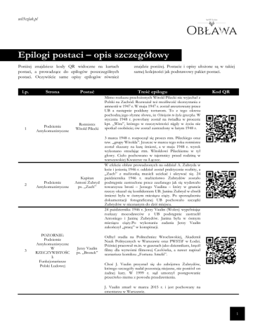 wil3szlak.pl Epilogi postaci – opis szczegółowy Poniżej znajdziesz kody QR widoczne na kartach postaci, a prowadzące do epilogów poszczególnych postaci. Oczywiście same opisy epilogów również l.p. 1 Strona Podziemie Antykomunistyczne 2 Podziemie Antykomunistyczne 3 POZORNIE: Podziemie Antykomunistyczne W RZECZYWISTOŚC I: Funkcjonariusze Polski Ludowej znajdzie poniżej. Postacie i opisy ułożone są w takiej samej kolejności jak podstawowy pakiet postaci. Postać Treść epilogu Rotmistrz Witold Pilecki Mimo rozkazu przełożonych Witold Pilecki nie wyjechał z Polski na Zachód. Rozważał też możliwość skorzystania z amnestii w 1947 r. W maju 1947 r. został aresztowany przez UB a następnie poddany torturom. To z tego okresu pochodzą jego słynne słowa, że Oświęcim to była igraszka. W styczniu 1948 r. powołany został na świadka w procesie kpt. „Wira”, którego w rzeczywistości nigdy w życiu nie spotkał osobiście; ów został zastrzelony w lutym 1948 r. Kapitan Antoni Żubryd ps. „Zuch” Jerzy Vaulin ps. „Bronek” Kod QR 3 marca 1948 r. rozpoczął się proces rtm. Pileckiego oraz tzw. „grupy Witolda”. Jeszcze w marcu tego roku rotmistrz został skazany na karę śmierci, a w maju 1948 r. wyrok wykonano strzelając rtm. Witoldowi Pileckiemu w tył głowy. Ciało pochowano w tajemnicy przed rodziną w warszawskiej Kwaterze na Łączce. W efekcie obław prowadzonych na oddział A. Żubryda w lecie i jesienią 1946 r. oddział został praktycznie rozbity, a „Zuch” z małżonką musieli uciekać i ukrywać się. 24 października 1946 r. małżeństwo Żubrydów zostało podstępnie zastrzelone przez zaufanego jak się wydawało towarzysza broni – Jerzego Vaulina – który w gruncie rzeczy okazał się konfidentem UB. Janina Żubryd w chwili śmierci była w ósmym miesiącu ciąży. Po sporządzeniu dokumentacji fotograficznej UB pochowało szczątki Żubrydów w nieznanym do dziś miejscu. 24 października 1946 r. Jerzy Vaulin (Wolen) wypełniając rozkazy mocodawców z UB podstępnie zastrzelił Antoniego i Janinę Żubrydów. Janina była w ósmym miesiącu ciąży.Po wykonaniu zadania Jerzy Vaulin zakończył „pracę” w konspiracji. Odbył studia na Politechnice Wrocławskiej, Akademii Nauk Politycznych w Warszawie oraz PWSTiF w Łodzi. Później pracował m.in. w gazetach jako dziennikarz, kręcił filmy dla wytwórni filmowej Czołówka, a nawet napisał scenariusz komiksu „Fortuna Amelii”. Choć J. Vaulin przyznał się do zabójstwa Żubrydów, którego szczegóły nadal pozostają niejasne, nie poniósł on żadnej kary. W 1999 r. sąd umorzył postępowanie przeciwko niemu z powodu przedawnienia. J. Vaulin zmarł w marcu 2015 r. i jest pochowany na cmentarzu w Warszawie. 1 4 5 6 7 8 Podziemie Antykomunistyczne Funkcjonariusze Polski Ludowej Funkcjonariusze Polski Ludowej POZORNIE: Funkcjonariusze Polski Ludowej W RZECZYWISTOŚC I: Podziemie Antykomunistyczne Ludność Cywilna Major Hieronim Dekutowski ps. „Zapora” Pułkownik Roman Romkowski Podpułkownik Siemion Prochorowicz Dawydow Kapitan Wacław Kazimierz Alchimowicz Doktor Juliusz Kamiński Jesienią 1946 r. oddział „Zapory” intensywnie walczył z oddziałami KBW i UB. Na początku 1947 r. H. Dekutowski tajnie negocjował z wysokimi funkcjonariuszami MBP warunki uwolnienia aresztowanych żołnierzy WiN oraz zasady ujawnienia swojego oddziału. Ostatecznie ujawnił się w czerwcu 1947 r., ale zagrożony aresztowaniem podjął próbę ucieczki na Zachód. Przygotowania do przerzutu przez granice okazały się prowokacją i zdradą. H. Dekutowskiego aresztowano we wrześniu 1947 r. Przez 9 miesięcy był poddawany okrutnym torturom. W listopadzie 1948 r. został skazany przez sąd na 7-krotną karę śmierci. 7 marca 1949 r. wykonano na nim karę śmierci; miał 30 lat, siwe włosy, wybite zęby, połamane ręce, żebra i nos i zerwane paznokcie, ale ostatnie jego słowa brzmiały „Przyjdzie zwycięstwo! Jeszcze Polska nie zginęła!”. Jego ciało pochowano w nieznanym miejscu. Dopiero w 2013 r. zidentyfikowano jego szczątki w Kwaterze na Łączce, na warszawskich Powązkach. Po aresztowaniu rtm. Witolda Pileckiego w 1947 r. Roman Romkowski brał udział w przesłuchiwaniu go. Do 1956 r. systematycznie awansował obejmując coraz ważniejsze funkcje we władzach i w systemie represji. W 1956 r. został aresztowany a w 1957 r. skazany na 15 lat za torturowanie uwięzionych oraz inne bezprawne działania. W 1964 r. wyszedł z więzienia na podstawie prawa łaski. Zmarł w 1968 r. i pochowany został na warszawskich Powązkach. Funkcje doradcze w Polsce pełnił jeszcze do 1950 r. Później był zastępcą dowódcy Grupy Radzieckich Wojsk Okupacyjnych w Niemczech (1950-51). Ostatnią ważną funkcję jako zastępca naczelnika Zarządu KGB obwodu swierdłowskiego pełnił w okresie 1951–1959. Zmarł w 1959 r. i pochowany jest w Swierdłowsku (dziś Jekaterynburg) za Uralem. Tak naprawdę „Wir” nigdy nie spotkał się osobiście z rtm. W. Pileckim. Jak się wkrótce okazało werbunek W. Alchimowicza był dziełem konfidenta UB ulokowanego w łonie WiN – Leszka Kuchcińskiego. "Wir" przekazywał mu materiały wywiadowcze na temat Ministerstwa Bezpieczeństwa Publicznego, które co prawda trafiały do kierownictwa WiN, ale jednocześnie kręcił sam na siebie stryczek. W. Alchimowicz został aresztowany w maju 1947 r. Śledztwo trwało do grudnia 1947 r. W styczniu 1948 r. został skazany na karę śmierci; wyrok wykonano niespełna miesiąc później. Miejsce pochówku szczątków „Wira” pozostaje nieznane; w Kwaterze na Łączce ma on tylko swój symboliczny grób. Pozostałą część życia J. Kamiński spędził prowadząc szpital zakaźny, później przekształcony w Izbę Chorych, i opiekując się chorymi. Zmarł w 1971 r. i spoczął na cmentarzu w Przedborzu. 2 9 Ludność Cywilna 10 Ludność Cywilna 11 12 13 Funkcjonariusze Polski Ludowej