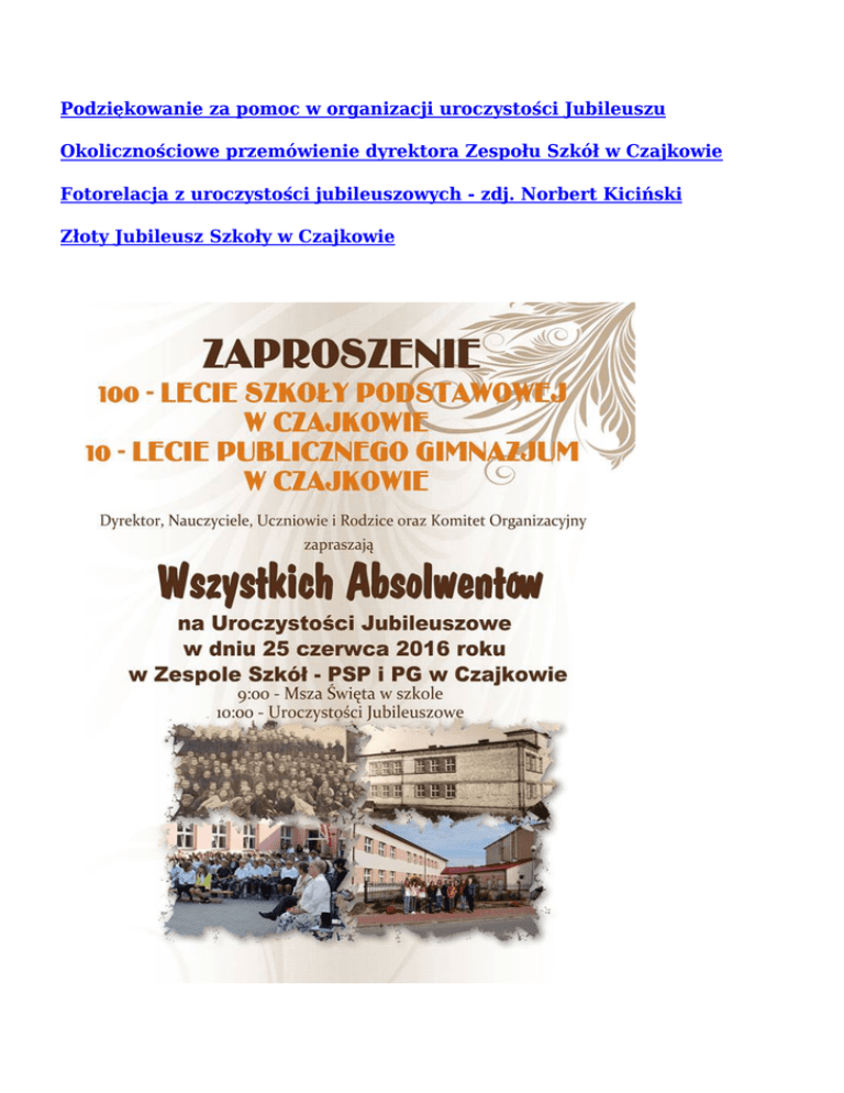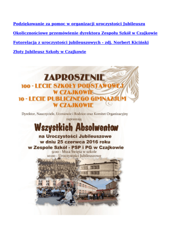 Podziękowanie za pomoc w organizacji uroczystości Jubileuszu Okolicznościowe przemówienie dyrektora Zespołu Szkół w Czajkowie Fotorelacja z uroczystości jubileuszowych - zdj. Norbert Kiciński Złoty Jubileusz Szkoły w Czajkowie Wywiady z absolwentami