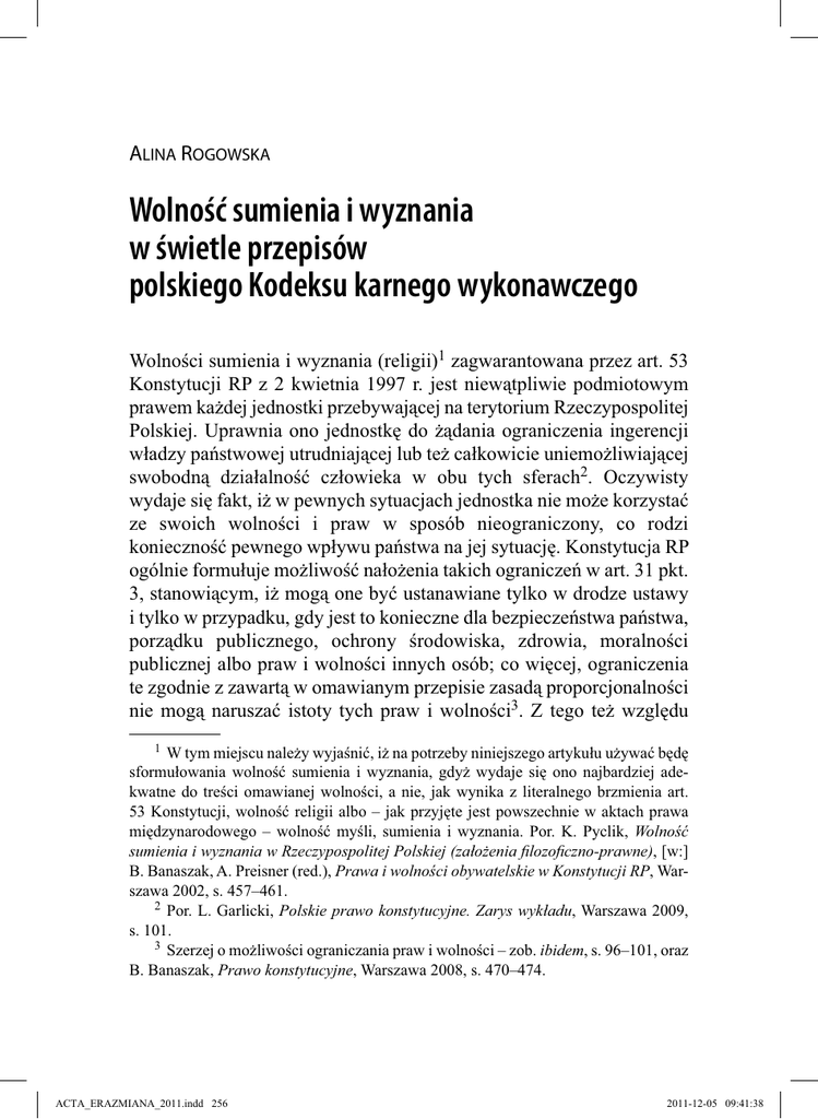 ALINA ROGOWSKA Wolność sumienia i wyznania w świetle przepisów polskiego Kodeksu karnego wykonawczego Wolności sumienia i wyznania (religii)1 zagwarantowana przez art. 53 Konstytucji RP z 2 kwietnia 1997 r. jest niewątpliwie podmiotowym prawem każdej jednostki przebywającej na terytorium Rzeczypospolitej Polskiej. Uprawnia ono jednostkę do żądania ograniczenia ingerencji władzy państwowej utrudniającej lub też całkowicie uniemożliwiającej swobodną działalność człowieka w obu tych sferach2. Oczywisty wydaje się fakt, iż w pewnych sytuacjach jednostka nie może korzystać ze swoich wolności i praw w sposób nieograniczony, co rodzi konieczność pewnego wpływu państwa na jej sytuację. Konstytucja RP ogólnie formułuje możliwość nałożenia takich ograniczeń w art. 31 pkt. 3, stanowiącym, iż mogą one być ustanawiane tylko w drodze ustawy i tylko w przypadku, gdy jest to konieczne dla bezpieczeństwa państwa, porządku publicznego, ochrony środowiska, zdrowia, moralności publicznej albo praw i wolności innych osób; co więcej, ograniczenia te zgodnie z zawartą w omawianym przepisie zasadą proporcjonalności nie mogą naruszać istoty tych praw i wolności3. Z tego też względu 1 W tym miejscu należy wyjaśnić, iż na potrzeby niniejszego artykułu używać będę sformułowania wolność sumienia i wyznania, gdyż wydaje się ono najbardziej adekwatne do treści omawianej wolności, a nie, jak wynika z literalnego brzmienia art. 53 Konstytucji, wolność religii albo – jak przyjęte jest powszechnie w aktach prawa międzynarodowego – wolność myśli, sumienia i wyznania. Por. K. Pyclik, Wolność sumienia i wyznania w Rzeczypospolitej Polskiej (założenia filozoficzno-prawne), [w:] B. Banaszak, A. Preisner (red.), Prawa i wolności obywatelskie w Konstytucji RP, Warszawa 2002, s. 457–461. 2 Por. L. Garlicki, Polskie prawo konstytucyjne. Zarys wykładu, Warszawa 2009, s. 101. 3 Szerzej o możliwości ograniczania praw i wolności – zob. ibidem, s. 96–101, oraz B. Banaszak, Prawo konstytucyjne, Warszawa 2008, s. 470–474. ACTA_ERAZMIANA_2011.indd 256 2011-12-05 09:41:38 Wolność sumienia i wyznania w przepisach k.k.w. 257 w aktach rangi ustawy konieczne jest unormowanie kwestii praw i wolności jednostki oraz przypadków i warunków ich ograniczania. W moim przekonaniu interesująco prezentuje się kwestia wolności sumienia i wyznania oraz jej ograniczeń w przepisach polskiego Kodeksu karnego wykonawczego z 6 czerwca 1997 r.4, jak również w przepisach aktów niższego rzędu, do których ustawa ta wyraźnie odsyła5. Poza wspomnianą już problematyką w niniejszym artykule chciałabym poruszyć też kwestię tak zwanych „więźniów sumienia” i ich praw wynikających z religijnego charakteru popełnionych przez te osoby przestępstw. Na wstępie warto postawić pytanie, czym w ogóle jest omawiana wolności na gruncie polskiego prawa konstytucyjnego. Większość autorów6 uznaje, iż wolność sumienia i wyznania składa się z kilku podstawowych elementów, a w tym: – możliwości przyjmowania, praktykowania publicznie i prywatnie oraz zmiany wybranej przez siebie religii, – życia w zgodzie z zasadami przez nią głoszonymi oraz swobody jej uzewnętrzniania przez indywidualne lub zbiorowe uprawianie kultu, modlitwę, uczestniczenie w obrzędach religijnych czy też naukę zasad i dogmatów wybranej religii. – możliwość posiadania miejsc kultu i świątyń. Istotny z tego punktu widzenia jest także gwarantowany konstytucyjnie zakaz zmuszania kogokolwiek do uczestniczenia lub nieuczestniczenia w praktykach religijnych oraz zakaz zmuszania kogokolwiek do ujawniania swojej wiary. Samo pojęcie sumienia – w przeciwieństwie do wyznania (religii) – nie ma w Konstytucji aż tak szerokiego i wyraźnego określenia, można jednak przyjąć, że odnosi 4 Dz.U. nr 90, poz. 557, z późn. zm. Mowa tutaj w szczególności o Rozporządzeniu Ministra Sprawiedliwości z dnia 2 września 2003 r. w sprawie szczegółowych zasad wykonywania praktyk religijnych i korzystania z posług religijnych w zakładach karnych i aresztach śledczych (Dz.U. nr 159, poz. 1546). 6 Na przykład: M. Pietrzak, Prawo wyznaniowe, Warszawa 2010, s. 21–49; K. Pyclik, op. cit., s. 456–457; Z. Łyko, Wolność sumienia i wyznania w relacji: człowiek–kościoły–państwo, [w:] L. Wiśniewski (red.), Podstawowe prawa jednostki i ich sądowa ochrona, Warszawa 1997, s. 82–87. 5 ACTA_ERAZMIANA_2011.indd 257 2011-12-05 09:41:38 258 Alina Rogowska się do wszelkiej aktywności światopoglądowej człowieka, poczynając od jego poglądów moralnych i filozoficznych a na społecznych kończąc. Wolność ta jest bardzo istotna w odniesieniu do osób, które nie wyznają żadnej religii, czyli ateistów, gdyż daje im w zasadzie taką samą swobodę wyrażania swoich przekonań, a także możliwość nie ujawniania ich, jak w przypadku osób identyfikujących się z określoną wiarą. Wolność sumienia i wyznania łączy się też niewątpliwie z prawem rodziców do wychowywania dzieci w zgodzie z własnymi przekonaniami, a ponadto powinna być rozpatrywana łącznie z zawartymi w art. 25 Konstytucji zasadami równouprawnienia kościołów i związków wyznaniowych oraz neutralności światopoglądowej państwa. Z punktu widzenia moich rozważań najważniejszym aspektem wolności wyznania jest prawo osób wierzących do korzystania z pomocy religijnej i możliwości praktykowania religii w każdym miejscu, w jakim się znajdują, również w zakładach karnych czy aresztach śledczych, aczkolwiek w bardziej ograniczony sposób, czym szerzej zajmę się w dalszej części niniejszego opracowania. Po tym wprowadzeniu w problematykę związaną z określeniem przedmiotu omawianych wolności chciałabym skupić się teraz na przedstawieniu ich w odniesieniu do przepisów prawa karnego wykonawczego. Przepisem, który w ogólny sposób zapewnia osobom