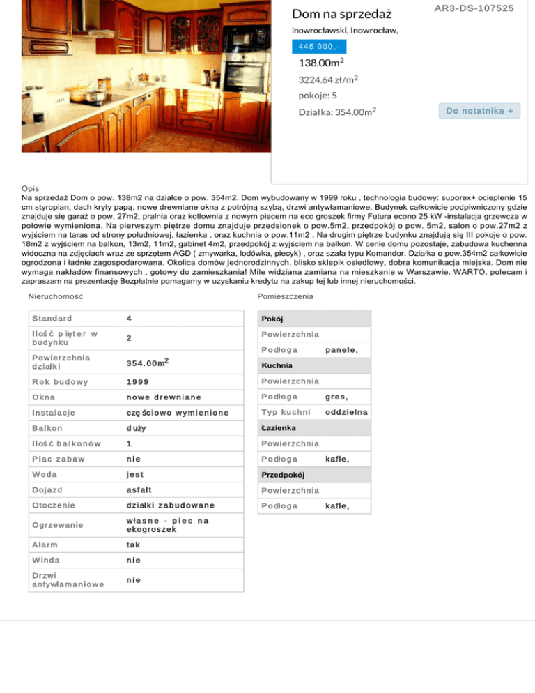 Dom na sprzedaż AR3-DS-107525 inowrocławski, Inowrocław, 445 000,- 138.00m2 3224.64 zł/m2 pokoje: 5 Działka: 354.00m2 Do notatnika + Opis Na sprzedaż Dom o pow. 138m2 na działce o pow. 354m2. Dom wybudowany w 1999 roku , technologia budowy: suporex+ ocieplenie 15 cm styropian, dach kryty papą, nowe drewniane okna z potrójną szybą, drzwi antywłamaniowe. Budynek całkowicie podpiwniczony gdzie znajduje się garaż o pow. 27m2, pralnia oraz kotłownia z nowym piecem na eco groszek firmy Futura econo 25 kW -instalacja grzewcza w połowie wymieniona. Na pierwszym piętrze domu znajduje przedsionek o pow.5m2, przedpokój o pow. 5m2, salon o pow.27m2 z wyjściem na taras od strony południowej, łazienka , oraz kuchnia o pow.11m2 . Na drugim piętrze budynku znajdują się III pokoje o pow. 18m2 z wyjściem na balkon, 13m2, 11m2, gabinet 4m2, przedpokój z wyjściem na balkon. W cenie domu pozostaje, zabudowa kuchenna widoczna na zdjęciach wraz ze sprzętem AGD ( zmywarka, lodówka, piecyk) , oraz szafa typu Komandor. Działka o pow.354m2 całkowicie ogrodzona i ładnie zagospodarowana. Okolica domów jednorodzinnych, blisko sklepik osiedlowy, dobra komunikacja miejska. Dom nie wymaga nakładów finansowych , gotowy do zamieszkania! Mile widziana zamiana na mieszkanie w Warszawie. WARTO, polecam i zapraszam na prezentację Bezpłatnie pomagamy w uzyskaniu kredytu na zakup tej lub innej nieruchomości. Nieruchomość Pomieszczenia Standard 4 Pokój I l oś ć p ię t e r w budynku 2 Powierzchnia Powierzchnia d z i ał k i 3 5 4 . 0 0 m2 Kuchnia Rok budowy 1999 Powierzchnia Okna nowe drewniane P o dł o g a gres, Instalacje czę śc i o w o w y m i e n i o n e Typ kuchni oddzielna Balkon d uży Łazienka I l oś ć b a l k o n ó w 1 Powierzchnia Plac zabaw nie P o dł o g a Woda jest Przedpokój Dojazd asfalt Powierzchnia Otoczenie d z i ał k i z a b u d o w a n e P o dł o g a Ogrzewanie wła s n e - p i e c n a ekogroszek Alarm tak Winda nie Drzwi antywł a m a n i o w e nie P o dł o g a panele, kafle, kafle,