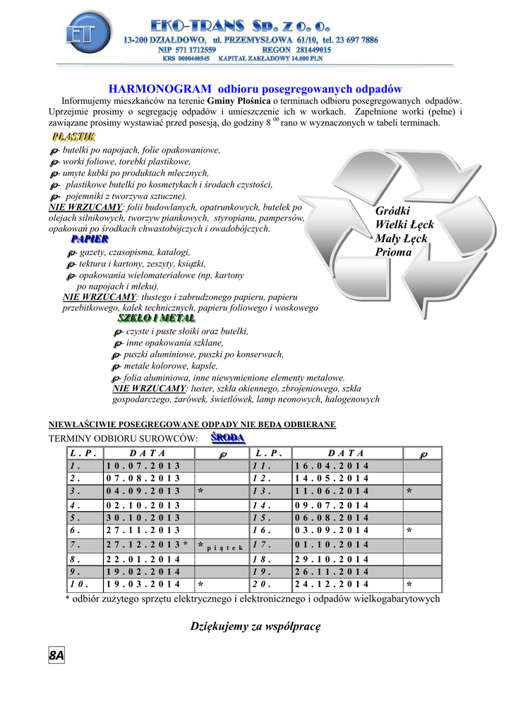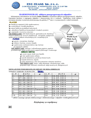 HARMONOGRAM odbioru posegregowanych odpadów Informujemy mieszkańców na terenie Gminy Płośnica o terminach odbioru posegregowanych odpadów. Uprzejmie prosimy o segregację odpadów i umieszczenie ich w workach. Zapełnione worki (pełne) i zawiązane prosimy wystawiać przed posesją, do godziny 8 00 rano w wyznaczonych w tabeli terminach. PPLLA ASSTTIIK K √ - butelki po napojach, folie opakowaniowe, √ - worki foliowe, torebki plastikowe, √ - umyte kubki po produktach mlecznych, √ - plastikowe butelki po kosmetykach i środach czystości, √ - pojemniki z tworzywa sztuczne). NIE WRZUCAMY: folii budowlanych, opatrunkowych, butelek po olejach silnikowych, tworzyw piankowych, styropianu, pampersów, opakowań po środkach chwastobójczych i owadobójczych. PPA APPIIE ER R √ - gazety, czasopisma, katalogi, √ - tektura i kartony, zeszyty, książki, √ - opakowania wielomateriałowe (np. kartony Gródki Wielki Łęck Mały Łęck Prioma po napojach i mleku). NIE WRZUCAMY: tłustego i zabrudzonego papieru, papieru przebitkowego, kalek technicznych, papieru foliowego i woskowego SSZZK KŁŁO O II M ME ETTA ALL √ - czyste i puste słoiki oraz butelki, √ - inne opakowania szklane, √ - puszki aluminiowe, puszki po konserwach, √ - metale kolorowe, kapsle, √ - folia aluminiowa, inne niewymienione elementy metalowe. NIE WRZUCAMY: luster, szkła okiennego, zbrojeniowego, szkła gospodarczego, żarówek, świetlówek, lamp neonowych, halogenowych NIEWŁAŚCIWIE POSEGREGOWANE ODPADY NIE BĘDĄ ODBIERANE TERMINY ODBIORU SUROWCÓW: L.P. 1. 10. 2. 07. 3. 04. DAT 07.2 08.2 09.2 A 013 013 013 ŚŚR RO OD DA A √ * √ L.P. 11. 12. 13. DATA 16.04.2014 14.05.2014 11.06.2014 * * 4. 5. 6. 02.10.2013 30.10.2013 27.11.2013 14. 15. 16. 09.07.2014 06.08.2014 03.09.2014 7. 27.12.2013* *piątek 17. 01.10.2014 8. 9. 10. 22.01.2014 19.02.2014 19.03.2014 * 18. 19. 20. 29.10.2014 26.11.2014 24.12.2014 * * odbiór zużytego sprzętu elektrycznego i elektronicznego i odpadów wielkogabarytowych Dziękujemy za współpracę 8A HARMONOGRAM odbioru posegregowanych odpadów Informujemy mieszkańców na terenie Gminy Płośnica o terminach odbioru posegregowanych odpadów. Uprzejmie prosimy o segregację odpadów i umieszczenie ich w workach. Zapełnione worki (pełne) i zawiązane prosimy wystawiać przed posesją, do godziny 8 00 rano w wyznaczonych w tabeli terminach. PPLLA ASSTTIIK K √ - butelki po napojach, folie opakowaniowe, √ - worki foliowe, torebki plastikowe, √ - umyte kubki po produktach mlecznych, √ - plastikowe butelki po kosmetykach i środach czystości, √ - pojemniki z tworzywa sztuczne). NIE WRZUCAMY: folii budowlanych, opatrunkowych, butelek po olejach silnikowych, tworzyw piankowych, styropianu, pampersów, opakowań po środkach chwastobójczych i owadobójczych. PPA APPIIE ER R √ - gazety, czasopisma, katalogi, √ - tektura i kartony, zeszyty, książki, √ - opakowania wielomateriałowe (np. kartony po napojach i mleku). NIE WRZUCAMY: tłustego i zabrudzonego papieru, papieru przebitkowego, kalek technicznych, papieru foliowego i woskowego Turza Mała Gralewo Rutkowice Murawki Skurpie Płośnica SSZZK KŁŁO O II M ME ETTA ALL √ - czyste i puste słoiki oraz butelki, √ - inne opakowania szklane, √ - puszki aluminiowe, puszki po konserwach, √ - metale kolorowe, kapsle, √ - folia aluminiowa, inne niewymienione elementy metalowe. NIE WRZUCAMY: luster, szkła okiennego, zbrojeniowego, szkła gospodarczego, żarówek, świetlówek, lamp neonowych, halogenowych NIEWŁAŚCIWIE POSEGREGOWANE ODPADY NIE BĘDĄ ODBIERANE TERMINY ODBIORU SUROWCÓW: L.P. 1. 17. 2. 14. 3. 11. DAT 07.2 08.2 09.2 A 013 013 013 4. 5. 6. 09.10.2013 06.11.2013 04.12.2013 7. 8. 9. 03.01.2014* 29.01.2014 26.02.2014 10. 26.03.2014 ŚŚR RO OD DA A √ √ * L.P. DATA 11. 23.04.2014 12. 21.05.2014 13. 18.06.2014 * * 14. 15. 16. 16.07.2014 13.08.2014 10.09.2014 * p i ą t e k 17. 18. 19. 08.10.2014 05.11.2014 03.12.2014 * * 20. 31.12.2014 * odbiór zużytego sprzętu elektrycznego i elektronicznego i odpadów wielkogabarytowych Dziękujemy za współpracę 13 HARMONOGRAM odbioru posegregowanych odpadów Informujemy mieszkańców na terenie Gminy Płośnica o terminach odbioru posegregowanych odpadów. Uprzejmie prosimy o segregację odpadów i umieszczenie ich w workach. Zapełnione worki (pełne) i zawiązane prosimy wystawiać przed posesją, do godziny 8 00 rano w wyznaczonych w tabeli terminach. PPLLA ASSTTIIK K √ - butelki po napojach, folie opakowaniowe, √ - worki foliowe, torebki plastikowe, √ - umyte kubki po produktach mlecznych, √ - plastikowe butelki po kosmetykach i środach czystości, √ - pojemniki z tworzywa sztuczne). NIE WRZUCAMY: folii budowlanych, opatrunkowych, butelek po olejach silnikowych, tworzyw piankowych, styropianu, pampersów, opakowań po środkach chwastobójczych i owadobójczych. PPA APPIIE ER R √ - gazety, czasopisma, katalogi, √ - tektura i kartony, zeszyty, książki, √ - opakowania wielomateriałowe (np. kartony po napojach i mleku). NIE WRZUCAMY: tłustego i zabrudzonego papieru, papieru przebitkowego, kalek technicznych, papieru foliowego i woskowego Niechłonin Zalesie Jabłonowo Gruszka Przełęk SSZZK KŁŁO O II M ME ETTA ALL √ - czyste i puste słoiki oraz butelki, √ - inne opakowania szklane, √ - puszki aluminiowe, puszki po konserwach, √ - metale kolorowe, kapsle, √ - folia aluminiowa, inne niewymienione elementy metalowe. NIE WRZUCAMY: luster, szkła okiennego, zbrojeniowego, szkła gospodarczego, żarówek, świetlówek, lamp neonowych, halogenowych NIEWŁAŚCIWIE POSEGREGOWANE ODPADY NIE BĘDĄ ODBIERANE ŚŚR RO OD DA A TERMINY ODBIORU SUROWCÓW: L . P . 1. 2. 3. DAT 17.07.2 14.08.2 11.09.2 A 013 013 013 4. 5. 6. 09.10.2013 06.11.2013 04.12.2013 7. 03.01.2014* 8. 9. 10. 29.01.2014 26.02.2014 26.03.2014 √ √ * L.P. DATA 11. 23.04.2014 12. 21.05.2014 13. 18.06.2014 * 14. 15. 16. 16.07.2014 13.08.2014 10.09.2014 17. 0