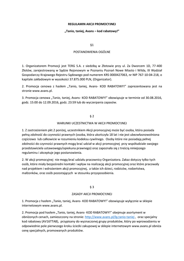 REGULAMIN AKCJI PROMOCYJNEJ „Tanio, taniej, Avans – kod rabatowy!” §1 POSTANOWIENIA OGÓLNE 1. Organizatorem Promocji jest TERG S.A. z siedzibą w Złotowie przy ul. Za Dworcem 1D, 77-400 Złotów, zarejestrowaną w Sądzie Rejonowym w Poznaniu Poznań Nowe Miasto i Wilda, IX Wydział Gospodarczy Krajowego Rejestru Sądowego pod numerem KRS 0000427063, nr NIP 767-10-04-218, o kapitale zakładowym w wysokości 37.875.000 PLN, (Organizator). 2. Promocja cenowa z hasłem „Tanio, taniej, Avans- KOD RABATOWY!” zaprezentowana jest na stronie www.avans.pl. 3. Promocja cenowa „Tanio, taniej, Avans- KOD RABATOWY!” obowiązuje w terminie od 30.08.2016, godz. 15:00 do 12.09.2016, godz. 23:59 lub do wyczerpania zapasów. §2 WARUNKI UCZESTNICTWA W AKCJI PROMOCYJNEJ 1. Z zastrzeżeniem pkt.2 poniżej, uczestnikiem Akcji promocyjnej może być osoba, która posiada pełną zdolność do czynności prawnych (osoba, która ukończyła 18 lat i nie jest ubezwłasnowolniona częściowo lub całkowicie w rozumieniu kodeksu cywilnego. Osoby które nie posiadają pełnej zdolności do czynności prawnych mogą brać udział w akcji promocyjnej przy współudziale swojego przedstawiciela ustawowego/opiekuna prawnego) oraz zapoznała się z treścią niniejszego regulaminu i akceptuje jego postanowienia. 2. W akcji promocyjnej nie mogą brać udziału pracownicy Organizatora. Zakaz dotyczy tylko tych osób, które miały bezpośredni kontakt i wpływ na realizację akcji promocyjnej oraz które pracowały nad projektem i wdrożeniem akcji promocyjnej, a także ich dzieci, rodziców, rodzeństwa, małżonków, oraz osób pozostających w stosunku przysposobienia. §3 ZASADY AKCJI PROMOCYJNEJ 1. Promocja z hasłem „Tanio, taniej, Avans- KOD RABATOWY!” obowiązuje wyłącznie w sklepie internetowym www.avans.pl. 2. Promocja pod hasłem „Tanio, taniej, Avans- KOD RABATOWY!” obejmuje asortyment w obniżonych cenach, zamieszczony na stronie: http://www.avans.pl/lp,tanio-taniej , oraz specjalny kod rabatowy (AV16TTA8), przypisany do wyznaczonej grupy produktów, który po wprowadzeniu w odpowiednie pole pierwszego kroku ścieżki zakupowej w sklepie internetowym www.avans.pl obniża cenę specjalnych, promowanych produktów. 3. W promocji biorą udział produkty zamieszczone na stronie: http://www.avans.pl/lp,tanio-taniej , tylko odpowiednio oznaczone „KODEM RABATOWYM!”. Rabat dotyczy ceny produktu, która obowiązuje w momencie składania zamówienia. W czasie trwania promocji ceny produktów mogą ulegać zmianie. 4. Przedmiotem Akcji pod hasłem „Tanio, taniej, Avans- KOD RABATOWY!” jest możliwość skorzystania przez Klienta z niższych cen na wybrane produkty oznaczone specjalnym kodem rabatowym o treści ” AV16TTA8” w okresie obowiązywania akcji, prezentowane na stronie http://www.avans.pl/lp,tanio-taniej oraz dodatkowo oznaczone w sklepie zawieszką „KOD RABATOWY!” 5. W dniu 06.09.2016 nastąpi aktualizacja produktów w akcji "Tanio, taniej, Avans!". 7. Materiały reklamowe zaprezentowane na stronie www.avans.pl nie stanowią oferty w rozumieniu art.66§ 1K.C §4 OGRANICZENIA AKCJI PROMOCYJNEJ 1. Ilość produktów dostępnych w promocji „Tanio, taniej, Avans- KOD RABATOWY!” jest ograniczona. 2. Sprzedaż produktów objętych promocją „Tanio, taniej, Avans- KOD RABATOWY!” jest możliwa tylko i wyłącznie w ilościach detalicznych - maksymalnie 2 sztuki tego samego towaru. 3. Przy zakupie towarów w promocji „Tanio, taniej, Avans- KOD RABATOWY!” od zaprezentowanych cen nie przysługują już żadne upusty. §5 ZASADY POSTĘPOWANIA REKLAMACJI ZAKUPU W PROMOCJI 1. Reklamacja powinna zawierać imię, nazwisko i adres do korespondencji składającego reklamację, jak również opis podstawy reklamacji. Reklamację należy składać korzystając z formularza zamieszczonego na stronie: https://www.avans.pl/reklamacjezglos.html 2. Reklamacja powinna zawierać żądanie określonego zachowania się przez Organizatora. 3. Reklamujący zobowiązany jest wraz z reklamacją doręczyć wszelkie dokumenty oraz przytoczyć wszystkie okoliczności faktyczne bądź prawne uzasadniające żądanie. 4. Reklamacje mogą być składane przez cały czas trwania promocji, jednak nie później niż w terminie 21 dni od dnia jej zakończenia. Reklamacje, które otrzyma Organizator po tej dacie nie będą rozpatrywane. 5. Reklamacje rozpatrywane będą przez Organizatora w terminie 14 dni od dnia otrzymania reklamacji. O wyniku rozpatrzenia reklamacji Uczestnik zostanie poinformowany listem zwykłym w terminie 7 dni od daty rozpatrzenia reklamacji. 6. Przy rozpatrywaniu reklamacji Organizator opiera się na treści niniejszego regulaminu oraz obowiązujących przepisach prawa polskiego. §6 POSTANOWIENIA KOŃCOWE 1. Niniejszy regulamin wchodzi w życie z dniem 30.08.2016 roku. 2. W sprawach nieuregulowanych Regulaminem zastosowanie mają przepisy Kodeksu Cywilnego. 3. Wszelkie spory między Organizatorem Promocji i jego Uczestnikami będą rozpatrywane przez sąd właściwy dla siedziby Organizatora. 4. Materiały reklamowe Akcji mają jedynie charakter informacyjno-promocyjny. Wiążącą moc prawną mają wyłącznie postanowienia niniejszego Regulaminu.