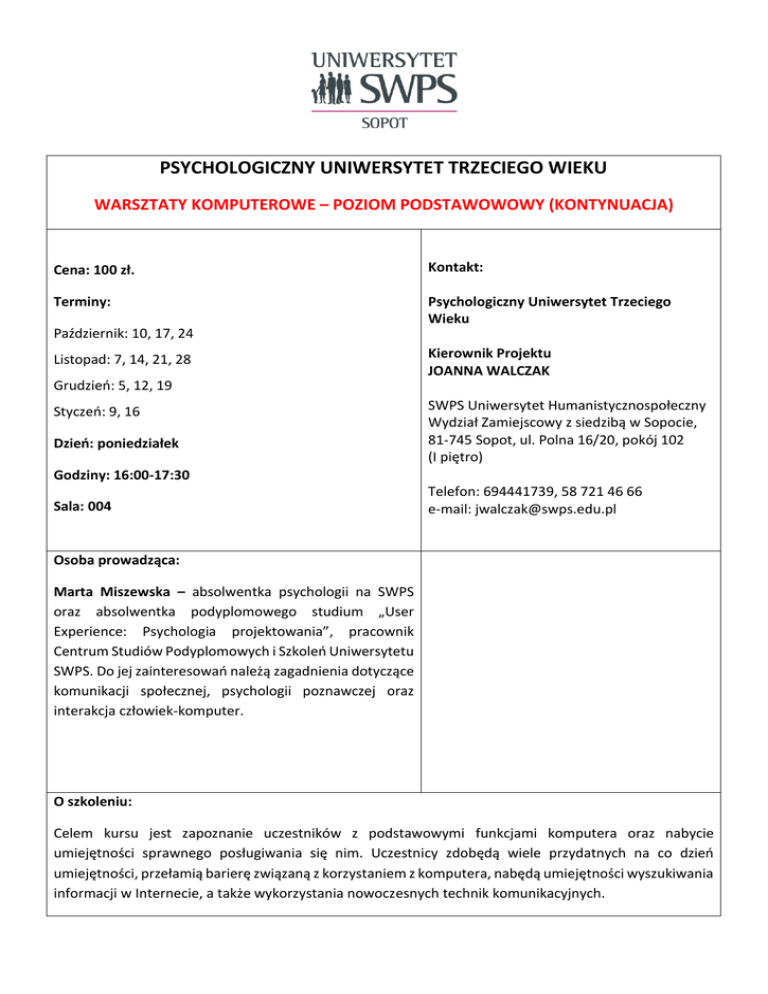 PSYCHOLOGICZNY UNIWERSYTET TRZECIEGO WIEKU WARSZTATY KOMPUTEROWE – POZIOM PODSTAWOWOWY (KONTYNUACJA) Cena: 100 zł. Kontakt: Terminy: Psychologiczny Uniwersytet Trzeciego Wieku Październik: 10, 17, 24 Listopad: 7, 14, 21, 28 Kierownik Projektu JOANNA WALCZAK Grudzień: 5, 12, 19 Styczeń: 9, 16 Dzień: poniedziałek SWPS Uniwersytet Humanistycznospołeczny Wydział Zamiejscowy z siedzibą w Sopocie, 81-745 Sopot, ul. Polna 16/20, pokój 102 (I piętro) Godziny: 16:00-17:30 Sala: 004 Telefon: 694441739, 58 721 46 66 e-mail: [email protected] Osoba prowadząca: Marta Miszewska – absolwentka psychologii na SWPS oraz absolwentka podyplomowego studium „User Experience: Psychologia projektowania”, pracownik Centrum Studiów Podyplomowych i Szkoleń Uniwersytetu SWPS. Do jej zainteresowań należą zagadnienia dotyczące komunikacji społecznej, psychologii poznawczej oraz interakcja człowiek-komputer. O szkoleniu: Celem kursu jest zapoznanie uczestników z podstawowymi funkcjami komputera oraz nabycie umiejętności sprawnego posługiwania się nim. Uczestnicy zdobędą wiele przydatnych na co dzień umiejętności, przełamią barierę związaną z korzystaniem z komputera, nabędą umiejętności wyszukiwania informacji w Internecie, a także wykorzystania nowoczesnych technik komunikacyjnych. Program szkolenia: Korzystanie z poczty elektronicznej (e-mail) w domenie gmail.com (przypomnienie) Wyszukiwanie informacji w Internecie Korzystanie z Dysku Google (do czego służy; zapisywanie plików) Dodatkowe funkcje Dysku Google (korzystanie z dokumentów, udostępnianie dokumentów innym osobom) Pakiet MS Office: Word, Power Point – kopiowanie oraz wklejanie tekstu, wycinanie, usuwanie, akapity, wklejanie obrazków do tekstu, tabele, przygotowanie prezentacji) Portale społecznościowe i komunikacja w Internecie Zakupy w Internecie (Olx.pl) Kopiowanie danych z urządzeń zewnętrznych Korzyści dla osób uczestniczących: Zapoznanie z podstawowymi umiejętnościami pracy na komputerze, Nabycie umiejętności sprawnego korzystania z przeglądarki internetowej, Nabycie umiejętności korzystania z komunikacji elektronicznej, Zapoznanie z możliwościami pakietu Microsoft Office (Word, Power Point).