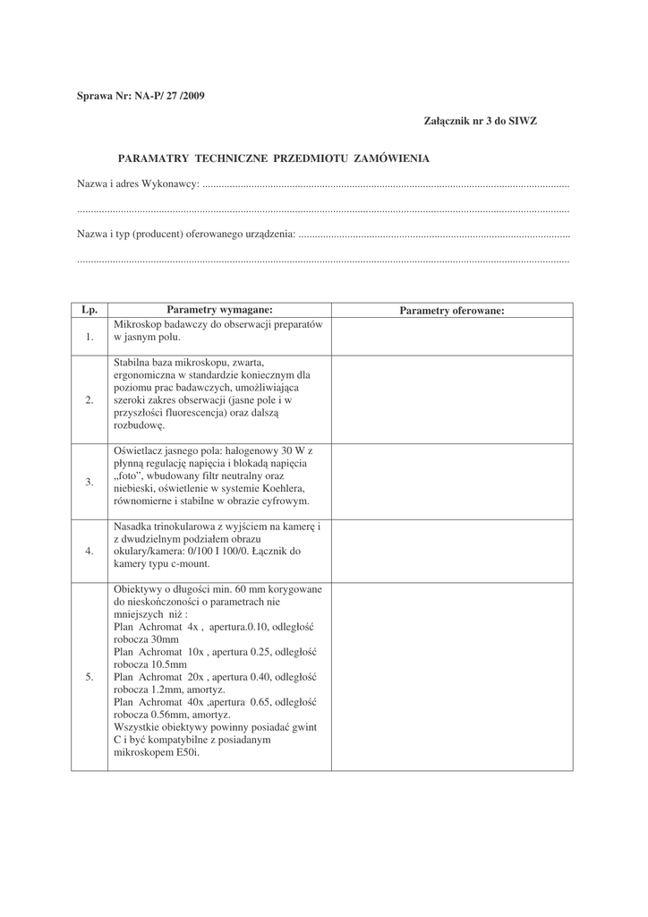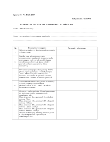 Sprawa Nr: NA-P/ 27 /2009 Zał cznik nr 3 do SIWZ PARAMATRY TECHNICZNE PRZEDMIOTU ZAMÓWIENIA Nazwa i adres Wykonawcy: ....................................................................................................................................... ..................................................................................................................................................................................... Nazwa i typ (producent) oferowanego urz dzenia: .................................................................................................... ..................................................................................................................................................................................... Lp. 1. 2. 3. 4. 5. Parametry wymagane: Mikroskop badawczy do obserwacji preparatów w jasnym polu. Stabilna baza mikroskopu, zwarta, ergonomiczna w standardzie koniecznym dla poziomu prac badawczych, umo liwiaj ca szeroki zakres obserwacji (jasne pole i w przyszło ci fluorescencja) oraz dalsz rozbudow . O wietlacz jasnego pola: halogenowy 30 W z płynn regulacj napi cia i blokad napi cia „foto”, wbudowany filtr neutralny oraz niebieski, o wietlenie w systemie Koehlera, równomierne i stabilne w obrazie cyfrowym. Nasadka trinokularowa z wyj ciem na kamer i z dwudzielnym podziałem obrazu okulary/kamera: 0/100 I 100/0. Ł cznik do kamery typu c-mount. Obiektywy o długo ci min. 60 mm korygowane do niesko czono ci o parametrach nie mniejszych ni : Plan Achromat 4x , apertura.0.10, odległo robocza 30mm Plan Achromat 10x , apertura 0.25, odległo robocza 10.5mm Plan Achromat 20x , apertura 0.40, odległo robocza 1.2mm, amortyz. Plan Achromat 40x ,apertura 0.65, odległo robocza 0.56mm, amortyz. Wszystkie obiektywy powinny posiada gwint C i by kompatybilne z posiadanym mikroskopem E50i. Parametry oferowane: 6. 7. 8. 9. 10. Okulary 10x o polu widzenia min. 22 mm z regulacj dioptryjn i podziałk okularow 10mm /100. Dodatkowe okulary 15x o polu widzenia min. 14.5 mm z regulacj dioptryjn i + podziałk okularow 10mm /100 kompatybilne z posiadanym mikroskopem Eclipse 50i. Kondensor Abbego o aperturze 0,9 do jasnego pola z wbudowan przysłon aperturow oraz regulowanym ruchem pionowym. Miska rewolwerowa 6-cio obiektywowa. Stolik podstawowy z uchwytem na dwa preparaty, pokryty warstw odporn na cieranie typu Alumite, pokr tła osi xy z prawej strony wyposa one w regulacj siły nacisku oraz regulowan wysoko poło enia pokr tek x,y. Mechanizm szybkiej wymiany preparatu z samoczynnym powrotem stolika do płaszczyzny ostro ci. Współosiowe pokr tła mikro-makro z regulacj siły nacisku i blokad górnego poło enia stolika. Mo liwo łatwej rozbudowy mikroskopu o fluorescencj . * Wykonawca wypełnia kolumn „Parametry oferowane”, nie wypełnienie kolumny przez Wykonawc skutkowa b dzie odrzuceniem oferty. ........................................... dnia.......................... /miejscowo / ............................................................................... Podpis(y) osoby/osób upowa nionych do reprezentacji Wykonawcy/Wykonawców/