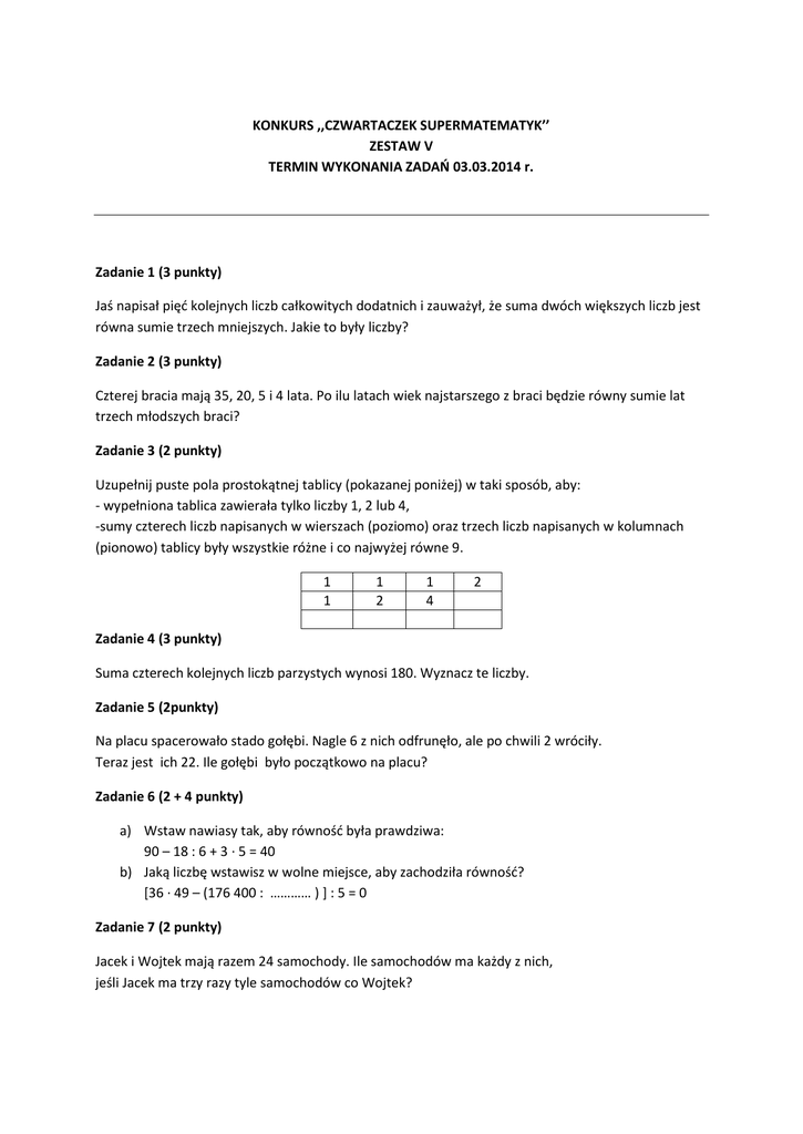 KONKURS ,,CZWARTACZEK SUPERMATEMATYK’’ ZESTAW V TERMIN WYKONANIA ZADAŃ 03.03.2014 r. Zadanie 1 (3 punkty) Jaś napisał pięć kolejnych liczb całkowitych dodatnich i zauważył, że suma dwóch większych liczb jest równa sumie trzech mniejszych. Jakie to były liczby? Zadanie 2 (3 punkty) Czterej bracia mają 35, 20, 5 i 4 lata. Po ilu latach wiek najstarszego z braci będzie równy sumie lat trzech młodszych braci? Zadanie 3 (2 punkty) Uzupełnij puste pola prostokątnej tablicy (pokazanej poniżej) w taki sposób, aby: - wypełniona tablica zawierała tylko liczby 1, 2 lub 4, -sumy czterech liczb napisanych w wierszach (poziomo) oraz trzech liczb napisanych w kolumnach (pionowo) tablicy były wszystkie różne i co najwyżej równe 9. 1 1 1 2 1 4 2 Zadanie 4 (3 punkty) Suma czterech kolejnych liczb parzystych wynosi 180. Wyznacz te liczby. Zadanie 5 (2punkty) Na placu spacerowało stado gołębi. Nagle 6 z nich odfrunęło, ale po chwili 2 wróciły. Teraz jest ich 22. Ile gołębi było początkowo na placu? Zadanie 6 (2 + 4 punkty) a) Wstaw nawiasy tak, aby równość była prawdziwa: 90 – 18 : 6 + 3 · 5 = 40 b) Jaką liczbę wstawisz w wolne miejsce, aby zachodziła równość? [36 · 49 – (176 400 : ………… ) ] : 5 = 0 Zadanie 7 (2 punkty) Jacek i Wojtek mają razem 24 samochody. Ile samochodów ma każdy z nich, jeśli Jacek ma trzy razy tyle samochodów co Wojtek? Zadanie 8 (3 punkty) W przystani jachtowej Zatoczka mogą się zatrzymać 103 łodzie. Dla łodzi o długości do 10 metrów przygotowano 64 miejsca, a pozostałe miejsca przeznaczono dla jachtów o długości do 14 metrów. Opłata dobowa za miejsce postojowe dla łodzi nie dłuższych niż 10 metrów wynosi 35 zł, a za miejsce postojowe dla jachtów nie dłuższych niż 14 m – 45 zł. Oblicz, ile wyniósłby zysk przystani w sierpniu przy maksymalnym wykorzystaniu miejsc postojowych. Zadanie 9 (4 punkty) Jacek, Patryk i Piotr otrzymali kieszonkowe na wycieczkę. Okazało się, że razem mają 60 zł. Jacek ma tyle samo pieniędzy co Patryk i Piotr razem. Piotr ma o 10 zł mniej niż Patryk. Ile pieniędzy ma każdy z nich? Zadanie 10 (4 punkty) Jeśli dzielimy dzielną przez potrojony dzielnik to otrzymamy 8. Jeśli zaś podzielimy dzielną przez iloraz, to otrzymamy 15. Oblicz dzielną, dzielnik i iloraz.