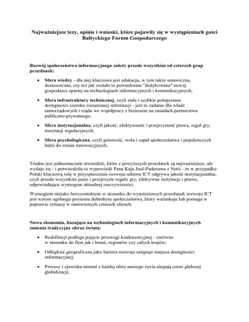 Najważniejsze tezy, opinie i wnioski, które pojawiły się w wystąpieniach gości Bałtyckiego Forum Gospodarczego Rozwój społeczeństwa informacyjnego zależy przede wszystkim od czterech grup przesłanek: • Sfera wiedzy - dla niej kluczowa jest edukacja, w tym także ustawiczna, dostosowana, czy też jak zostało to powiedziane "dedykowana" nowej gospodarce opartej na technologiach informacyjnych i komunikacyjnych; • Sfera infrastruktury technicznej, czyli stałe i szybkie polepszanie dostępności szeroko rozumianej informacji - jest to zadanie dla władz samorządowych i rządu we współpracy z biznesem na zasadach partnerstwa publiczno-prywatnego; • Sfera instytucjonalna, czyli jakość, efektywność i przejrzystość prawa, reguł gry, instytucji regulacyjnych; • Sfera psychologiczna, czyli gotowość, wola i zapał społeczeństwa i pojedynczych ludzi do zmian innowacyjnych; Trudno jest jednoznacznie stwierdzić, które z powyższych przesłanek są najważniejsze, ale wydaje się - i potwierdziła to wypowiedź Pana Kaja Juul-Padersena z Netii - że w przypadku Polski kluczową rolę w przyspieszeniu rozwoju sektora ICT odgrywa jakość instytucjonalna, czyli przede wszystkim jasne i przejrzyste reguły gry, efektywne instytucje i prawo, odpowiadające wymogom aktualnej rzeczywistości. Wymogiem niejako horyzontalnym w stosunku do wymienionych przesłanek rozwoju ICT jest wzrost ogólnego poziomu dobrobytu społeczeństwa, który warunkuje lub pomaga w poprawie sytuacji w omówionych czterech sferach. Nowa ekonomia, bazująca na technologiach informacyjnych i komunikacyjnych zmienia tradycyjny obraz świata: • Redefinicji podlega pojęcie przewagi konkurencyjnej - zarówno w stosunku do firm jak i branż, regionów czy całych krajów; • Odległość geograficzna jako bariera rozwoju ustępuje miejsca dostępności informacyjnej; • Procesy i zjawiska niemal z każdej sfery naszego życia ulegają coraz głębszej globalizacji; Media elektroniczne, szczególnie Internet zastępują w coraz większym stopniu tradycyjne narzędzia komunikacji - zmieniając często dotychczasowe role ludzi (przykład maklerów) i instytucji (przykład banków); • Zdecydowanie rośnie poziom konkurencji dzięki lepszemu przepływowi informacji, większej dostępności wielu usług. • Zdecydowanie lepszy dostęp do lepszej informacji spowodował prawdziwy boom inwestycyjny w krajach, które są liderami "nowej gospodarki". Technologie informacyjne i komunikacyjne - przynajmniej na razie - należy traktować jako rozszerzenie, uzupełnienie tradycyjnych metod czy kanałów przepływu informacji, usług czy towarów, a nie jako zupełny ich substytut. Wynika to przede wszystkim z wciąż zbyt małej liczby użytkowników tych nowoczesnych narzędzi oraz barier mentalnych, których przeciągający się proces regulacyjny nie pomaga łagodzić (przypomnę tylko nie rozwiązaną wciąż w wielu krajach kwestię podpisu elektronicznego).