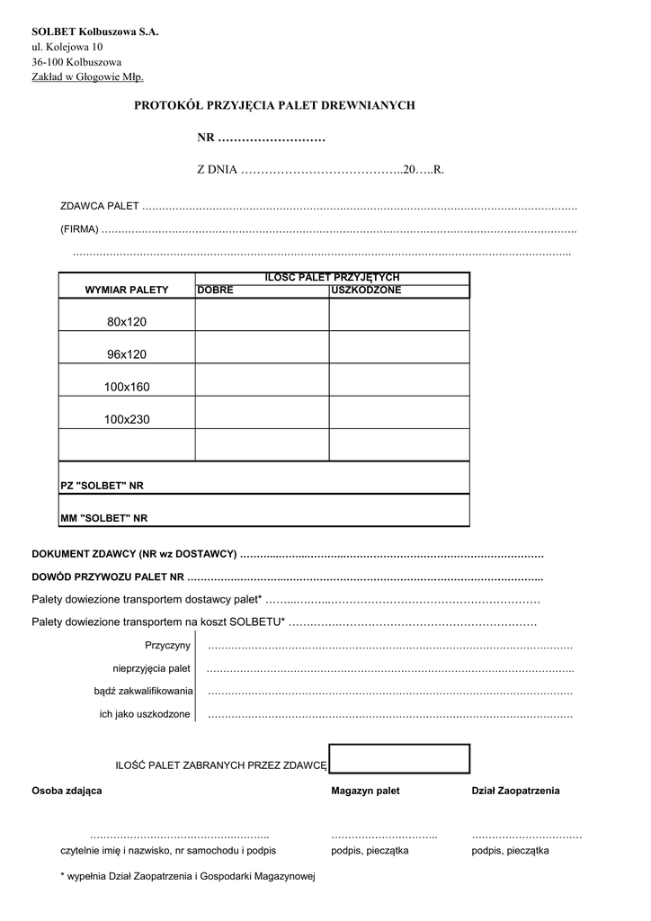 SOLBET Kolbuszowa S.A. ul. Kolejowa 10 36-100 Kolbuszowa Zakład w Głogowie Młp. PROTOKÓŁ PRZYJĘCIA PALET DREWNIANYCH NR ……………………… Z DNIA …………………………………..20…..R. ZDAWCA PALET …………………………………………………………………………………………………………………. (FIRMA) ……………………………………………………………………………………………………………………………. ………………………………………………………………………………………………………………………………….. WYMIAR PALETY DOBRE ILOŚĆ PALET PRZYJĘTYCH USZKODZONE 80x120 96x120 100x160 100x230 PZ "SOLBET" NR MM "SOLBET" NR DOKUMENT ZDAWCY (NR wz DOSTAWCY) ………...……...………..…………………………………………………… DOWÓD PRZYWOZU PALET NR …………….…………..………………………………………………………………….. Palety dowiezione transportem dostawcy palet* ……...….…...………………………………………………… Palety dowiezione transportem na koszt SOLBETU* …….…….……………………………………………… Przyczyny ………………………………………………………………………………………………. nieprzyjęcia palet ……………………………………………………………………………………………….. bądź zakwalifikowania ………………………………………………………………………………………………. ich jako uszkodzone ………………………………………………………………………………………………. ILOŚĆ PALET ZABRANYCH PRZEZ ZDAWCĘ Osoba zdająca …………………………………….……….. czytelnie imię i nazwisko, nr samochodu i podpis * wypełnia Dział Zaopatrzenia i Gospodarki Magazynowej Magazyn palet Dział Zaopatrzenia ………………………….. …………………………… podpis, pieczątka podpis, pieczątka
