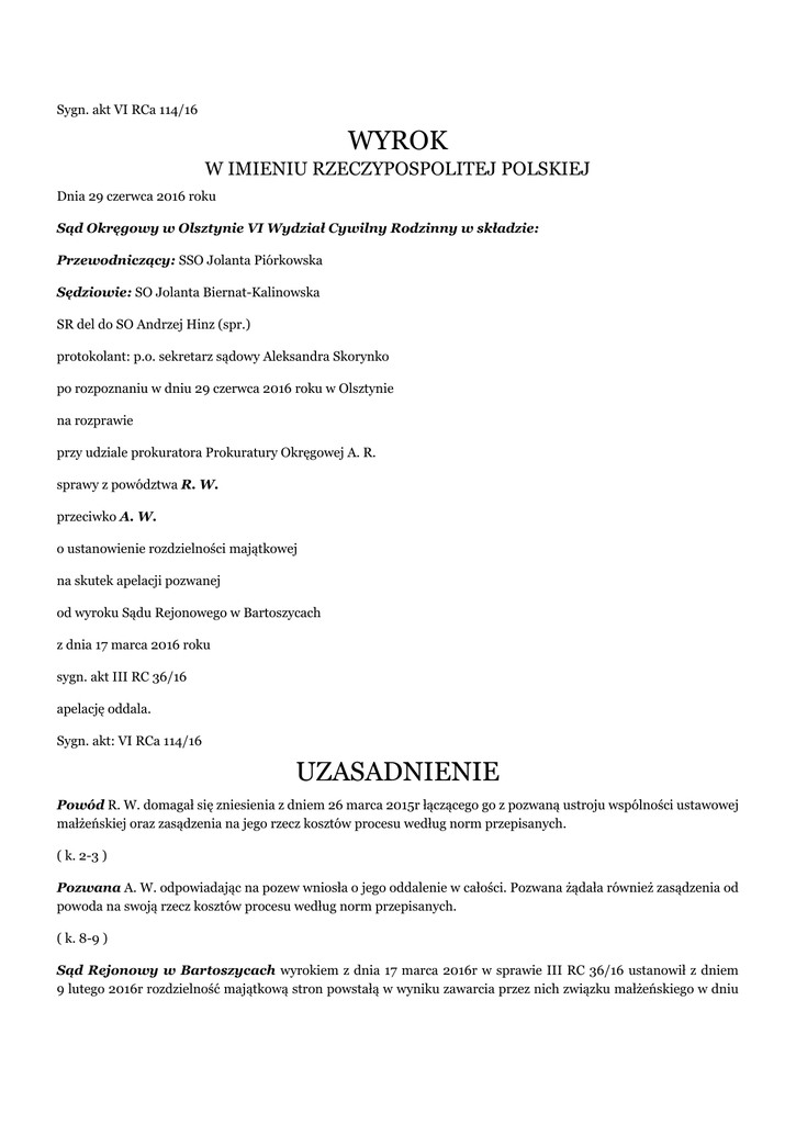 Sygn. akt VI RCa 114/16 WYROK W IMIENIU RZECZYPOSPOLITEJ POLSKIEJ Dnia 29 czerwca 2016 roku Sąd Okręgowy w Olsztynie VI Wydział Cywilny Rodzinny w składzie: Przewodniczący: SSO Jolanta Piórkowska Sędziowie: SO Jolanta Biernat-Kalinowska SR del do SO Andrzej Hinz (spr.) protokolant: p.o. sekretarz sądowy Aleksandra Skorynko po rozpoznaniu w dniu 29 czerwca 2016 roku w Olsztynie na rozprawie przy udziale prokuratora Prokuratury Okręgowej A. R. sprawy z powództwa R. W. przeciwko A. W. o ustanowienie rozdzielności majątkowej na skutek apelacji pozwanej od wyroku Sądu Rejonowego w Bartoszycach z dnia 17 marca 2016 roku sygn. akt III RC 36/16 apelację oddala. Sygn. akt: VI RCa 114/16 UZASADNIENIE Powód R. W. domagał się zniesienia z dniem 26 marca 2015r łączącego go z pozwaną ustroju wspólności ustawowej małżeńskiej oraz zasądzenia na jego rzecz kosztów procesu według norm przepisanych. ( k. 2-3 ) Pozwana A. W. odpowiadając na pozew wniosła o jego oddalenie w całości. Pozwana żądała również zasądzenia od powoda na swoją rzecz kosztów procesu według norm przepisanych. ( k. 8-9 ) Sąd Rejonowy w Bartoszycach wyrokiem z dnia 17 marca 2016r w sprawie III RC 36/16 ustanowił z dniem 9 lutego 2016r rozdzielność majątkową stron powstałą w wyniku zawarcia przez nich związku małżeńskiego w dniu (...)w urzędzie stanu cywilnego w B.. W pozostałej części Sąd powództwo oddalił oraz zasądził od pozwanej na rzecz powoda kwotę 100,- zł tytułem zwrotu kosztów procesu . Sąd Rejonowy ustalił, że strony zawarły małżeństwo w dniu (...). Obecnie przed Sądem Okręgowym w Olsztynie zawisła sprawa o rozwód stron – toczy się pod sygnaturą VI RC 570/15. Strony posiadają z małżeństwa (...) letniego syna, nie zawierały żadnych umów majątkowych małżeńskich. W trakcie małżeństwa strony zakupiły mieszkanie, garaż oraz samochody osobowe O. (...) rok prod. 2006 i V. (...) z roku 1997. Strony od zawarcia związku małżeńskiego mieszkały razem – powód wyprowadził się z domu i zamieszkał z rodzicami w dniu 26 marca 2015r. W kolejnym miesiącu powód złożył pozew o rozwód. W czasie gdy mieszkali razem, to powód ponosił większość opłat związanych z utrzymaniem mieszkania, opłaty za przedszkole, związane z utrzymaniem samochodu, opłaty za telefon. Zakupy żywności, przedmiotów codziennego użytku, odzieży i ubrań strony dokonywał wspólnie. Pozwana pracowała zawodowo – jej wynagrodzenie pozostawała w jej wyłącznej dyspozycji – sporadycznie dokładała się do wydatków związanych np. z dodatkowymi zajęciami syna. W tym czasie strony miały wspólne rachunki bankowe. Powód pod koniec 2014r założył własny rachunek bankowy, do którego żona nie miała dostępu. Jego renta od tej pory wpływała na jego rachunek bankowy. Powód nadal regulował wszystkie opłaty związane z utrzymaniem wspólnego mieszkania. W dalszej kolejności Sąd Rejonowy ustalił, że powód w latach 2004-2011 pracował jako żołnierz zawodowy, a od 2011r jest rencistą II grupy ustalonej na czas do lipca 2017r. Od 2012r prowadził działalność gospodarczą – usługi transportowe, jeździł również taksówką. Powód zawiesił swoją działalność w styczniu 2016r po tym jak na początku tego miesiąca miał poważny wypadek samochodowy. Pozwana pracowała zawodowo na początku małżeństwa, potem pobierała zasiłek macierzyński . Odkąd syn stron zaczął chodził do przedszkola ponownie podjęła zatrudnienie. Od 26 marca 2015r powód co miesiąc przelewał na rachunek żony po 500,- zł z przeznaczeniem na utrzymanie syna i mieszkania. Obecnie nadal opłaca telefon żony, telewizję kablową oraz Internet ( łącznie 99,- zł ). W tym czasie koszty utrzymania mieszkania wynosiły 460,- zł. W czasie małżeństwa strony wspólnie podejmowały ważniejsze decyzje dotyczące ich mienia. Strony wspólnie gospodarowały pieniędzmi i zarządzały majątkiem wspólnym. Przed wyprowadzeniem się męża pozwana podjęła ze wspólnych kont łącznie 10.000,-zł, o czym go poinformowała. W toku jest sprawa o rozwód stron z powództwa powoda, który domagał się rozwiązania małżeństwa bez orzekania o winie. Obecnie obie strony domagają się orzeczenia winy drugiego małżonka. W trakcie procesu rozwodowego Sąd zabezpieczył od powoda na rzecz pozwanej kwotę po 800,-zł tytułem zaspokajania potrzeb rodziny. Wówczas powód zaprzestał przelewania żonie po 500,- zł miesięcznie. W maju 2015r pozwana wymieniła zamki w wspólnym mieszkaniu, a w marcu 2016r przekazała mu nowe klucze do mieszkania. Sąd ustalił także, że powód ma trudności z rozpoczęciem działalności gospodarczej, chce sprzedać auto, zaciągnąć kredyt i według niego nie może porozumieć się w tych sprawach z żoną. W ciągu ostatniego roku prowadzona przez niego działalność gospodarcza przynosiła mu zysk rzędu 1000,- zł miesięcznie. Strony nadal wspólnie korzystają z wspólnego garażu. Powód ma założoną niebieską kartę. Pozwana przeszła załamanie nerwowe, korzystała z pomocy psychologa. Powód utrzymuje kontakty z synem – strony porozumiały się w tej kwestii – często zabiera syna do swoich rodziców, u których obecnie mieszka. Od czasu, gdy strony zamieszkały oddzielnie żadne z nich nie zaciągnęło żadnych kredytów, ani innych zobowiązań finansowych. Pozwana deklaruje wolę porozumienia z mężem w kwestii sprzedaży i złomowania wspólnego auta. W oparciu o tak ustalony stan faktyczny Sąd Rejonowy uznał, że powództwo zasługiwało na uwzględnienie prawie w całości. Przywołując treść art. 52 § 1 kro Sąd Rejonowy wskazał, że zachodzą wymienione w nim przesłanki uzasadniające ustanowienie przez Sąd rozdzielności majątkowej stron. Sąd podkreślił, że strony są skonfliktowane, a ich relacje małżeńskie szczególnie od czasu zawiśnięcia sprawy o rozwód są zaburzone tj. od