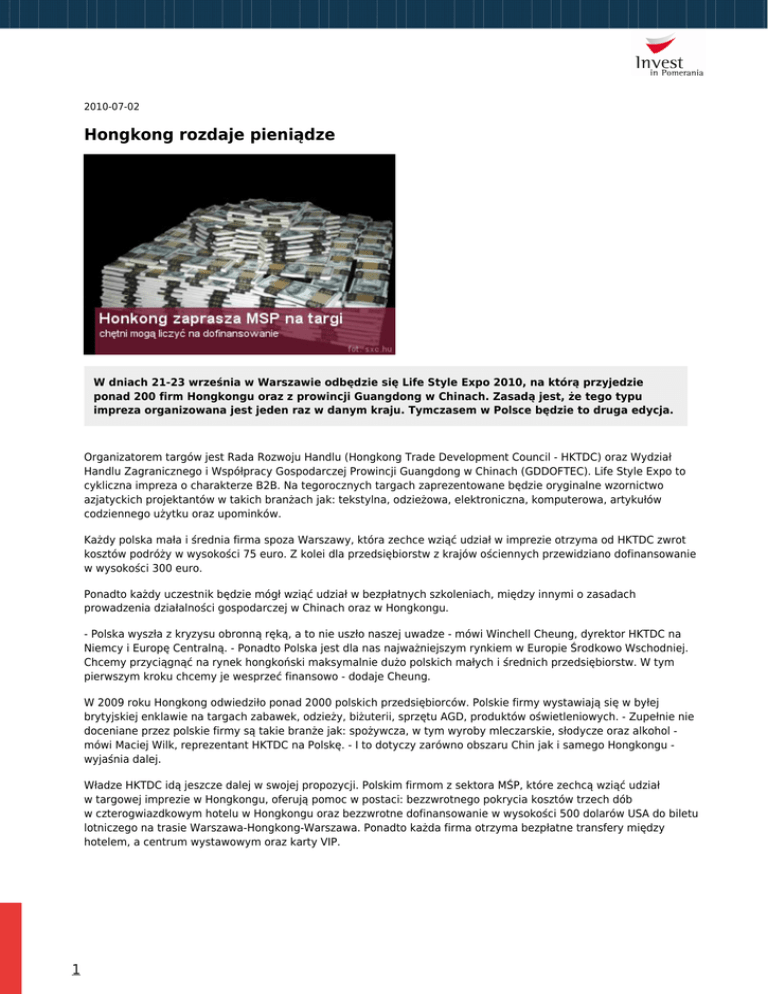 2010-07-02 Hongkong rozdaje pieniądze W dniach 21-23 września w Warszawie odbędzie się Life Style Expo 2010, na którą przyjedzie ponad 200 firm Hongkongu oraz z prowincji Guangdong w Chinach. Zasadą jest, że tego typu impreza organizowana jest jeden raz w danym kraju. Tymczasem w Polsce będzie to druga edycja. Organizatorem targów jest Rada Rozwoju Handlu (Hongkong Trade Development Council - HKTDC) oraz Wydział Handlu Zagranicznego i Współpracy Gospodarczej Prowincji Guangdong w Chinach (GDDOFTEC). Life Style Expo to cykliczna impreza o charakterze B2B. Na tegorocznych targach zaprezentowane będzie oryginalne wzornictwo azjatyckich projektantów w takich branżach jak: tekstylna, odzieżowa, elektroniczna, komputerowa, artykułów codziennego użytku oraz upominków. Każdy polska mała i średnia firma spoza Warszawy, która zechce wziąć udział w imprezie otrzyma od HKTDC zwrot kosztów podróży w wysokości 75 euro. Z kolei dla przedsiębiorstw z krajów ościennych przewidziano dofinansowanie w wysokości 300 euro. Ponadto każdy uczestnik będzie mógł wziąć udział w bezpłatnych szkoleniach, między innymi o zasadach prowadzenia działalności gospodarczej w Chinach oraz w Hongkongu. - Polska wyszła z kryzysu obronną ręką, a to nie uszło naszej uwadze - mówi Winchell Cheung, dyrektor HKTDC na Niemcy i Europę Centralną. - Ponadto Polska jest dla nas najważniejszym rynkiem w Europie Środkowo Wschodniej. Chcemy przyciągnąć na rynek hongkoński maksymalnie dużo polskich małych i średnich przedsiębiorstw. W tym pierwszym kroku chcemy je wesprzeć finansowo - dodaje Cheung. W 2009 roku Hongkong odwiedziło ponad 2000 polskich przedsiębiorców. Polskie firmy wystawiają się w byłej brytyjskiej enklawie na targach zabawek, odzieży, biżuterii, sprzętu AGD, produktów oświetleniowych. - Zupełnie nie doceniane przez polskie firmy są takie branże jak: spożywcza, w tym wyroby mleczarskie, słodycze oraz alkohol mówi Maciej Wilk, reprezentant HKTDC na Polskę. - I to dotyczy zarówno obszaru Chin jak i samego Hongkongu wyjaśnia dalej. Władze HKTDC idą jeszcze dalej w swojej propozycji. Polskim firmom z sektora MŚP, które zechcą wziąć udział w targowej imprezie w Hongkongu, oferują pomoc w postaci: bezzwrotnego pokrycia kosztów trzech dób w czterogwiazdkowym hotelu w Hongkongu oraz bezzwrotne dofinansowanie w wysokości 500 dolarów USA do biletu lotniczego na trasie Warszawa-Hongkong-Warszawa. Ponadto każda firma otrzyma bezpłatne transfery między hotelem, a centrum wystawowym oraz karty VIP. 1 Wymiana handlowa Polska - Hongkong: Obroty handlowe w 2009 - 723 mln dolarów. Export 2009 rok: wzrost o 84.1 % styczeń - kwiecień 2010 wzrost o 17.9 %. Najlepiej sprzedające się polskie produkty: mięso i artykuły spożywcze (20%), sprzęt telekomunikacyjny (15%) sprzęt i części dla przemysłu (27%). biżuteria, szkło artystyczne Jacek Strzelecki Autor Gazeta Bankowa 2