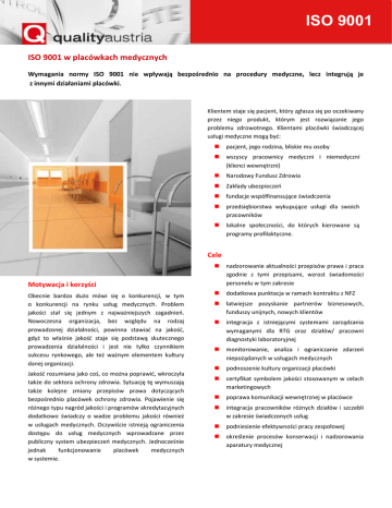 ISO 9001 ISO 9001 w placówkach medycznych Wymagania normy ISO 9001 nie wpływają bezpośrednio na procedury medyczne, lecz integrują je z innymi działaniami placówki. Klientem staje się pacjent, który zgłasza się po oczekiwany przez niego produkt, którym jest rozwiązanie jego problemu zdrowotnego. Klientami placówki świadczącej usługi medyczne mogą być: pacjent, jego rodzina, bliskie mu osoby wszyscy pracownicy medyczni i niemedyczni (klienci wewnętrzni) Narodowy Fundusz Zdrowia Zakłady ubezpieczeń fundacje współfinansujące świadczenia przedsiębiorstwa wykupujące usługi dla swoich pracowników lokalne społeczności, do których kierowane są programy profilaktyczne. Cele nadzorowanie aktualności przepisów prawa i praca zgodnie z tymi przepisami, wzrost świadomości personelu w tym zakresie dodatkowa punktacja w ramach kontraktu z NFZ łatwiejsze pozyskanie partnerów biznesowych, funduszy unijnych, nowych klientów integracja z istniejącymi systemami zarządzania wymaganymi dla RTG oraz działów/ pracowni diagnostyki laboratoryjnej monitorowanie, analiza i ograniczanie zdarzeń niepożądanych w usługach medycznych podnoszenie kultury organizacji placówki certyfikat symbolem jakości stosowanym w celach marketingowych poprawa komunikacji wewnętrznej w placówce integracja pracowników różnych działów i szczebli w zakresie świadczonych usług podniesienie efektywności pracy zespołowej określenie procesów konserwacji i nadzorowania aparatury medycznej Motywacja i korzyści Obecnie bardzo dużo mówi się o konkurencji, w tym o konkurencji na rynku usług medycznych. Problem jakości stał się jednym z najważniejszych zagadnień. Nowoczesna organizacja, bez względu na rodzaj prowadzonej działalności, powinna stawiać na jakość, gdyż to właśnie jakość staje się podstawą skutecznego prowadzenia działalności i jest nie tylko czynnikiem sukcesu rynkowego, ale też ważnym elementem kultury danej organizacji. Jakość rozumiana jako coś, co można poprawić, wkroczyła także do sektora ochrony zdrowia. Sytuację tę wymuszają także kolejne zmiany przepisów prawa dotyczących bezpośrednio placówek ochrony zdrowia. Pojawienie się różnego typu nagród jakości i programów akredytacyjnych dodatkowo świadczy o wadze problemu jakości również w usługach medycznych. Oczywiście istnieją ograniczenia dostępu do usług medycznych wprowadzane przez publiczny system ubezpieczeń medycznych. Jednocześnie jednak funkcjonowanie placówek medycznych w systemie. ISO 9001 ustalenie zasad i procedur utrzymywania higieny w placówce poprawa obiegu dokumentacji poprawa organizacji pracy podnoszenie pracowników podnoszenie świadomości pracowników dotyczącej indywidualnej odpowiedzialności za świadczone usługi zapewnienie bezpiecznego środowiska pracy uporządkowanie obowiązków, uprawnień i odpowiedzialności pracowników kwalifikacji zawodowych Grupa docelowa placówki medyczne prywatne i państwowe laboratoria medyczne ośrodki badawcze i medycyny doświadczalnej szpitale, kliniki, instytuty Akredytacja Ścisły związek krajowego przedstawiciela z międzynarodowymi organizacjami tj. IQNet, EOQ i EFQM , a także współpraca z firmami: IPC, VDA-QMC , IATF dają niepowtarzalną szansę aktywnego uczestniczenia w wypracowywaniu wymagań standardów, które staną się powszechne w niedalekiej przyszłości. Stawia to klientów Quality Austria w niezwykle uprzywilejowanej pozycji. Ponad 12 tys. klientów w prawie 50 krajach osiąga poprzez tę współpracę wymierne korzyści, uzyskując efekt synergii. Kontakt Michał Kubista Dyrektor Marketingu i Działu Szkoleń tel. 516687768 e-mail: [email protected] Quality Austria od lipca 1993 roku posiada akredytację na certyfikowanie organizacji wg ISO 9001, nadaną rozporządzeniem Ministerstwa Gospodarki Austrii. Inne normy i standardy ISO 9001, ISO 14644, KTQ O Quality Austria Quality Austria GmbH jest Państwa kompetentnym partnerem dla zintegrowanych systemów zarządzania w zakresie jakości, środowiska, bezpieczeństwa pracy i standardów branżowych. Usługi świadczone przez Quality Austria obejmują zakres od szkoleń w zakresie międzynarodowych trendów i metod zarządzania, poprzez certyfikację systemów zarządzania na zgodność z międzynarodowymi standardami i krajowymi wymaganiami, aż po oceny w oparciu o model doskonałości EFQM. Quality Austria jest akredytowana przez BMWFJ w zakresie certyfikacji systemów zarządzania i certyfikacji personelu. Posiada również liczne, międzynarodowe dopuszczenia. Quality Austria z ponad 650 audytorami, trenerami i ekspertami technicznymi zapewnienia skuteczny transfer wiedzy, kompetencji i doświadczenia. Quality Austria Polska Sp. z o.o. ul. Żwirki i Wigury 14 43-190 Mikołów Tel.: +48 32 226 60 07 Fax: +48 32 216 26 41 e-mail: [email protected] web: www.qualityaustria.com.pl