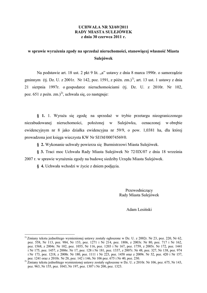 UCHWAŁA NR XI/69/2011 RADY MIASTA SULEJÓWEK z dnia 30 czerwca 2011 r. w sprawie wyrażenia zgody na sprzedaż nieruchomości, stanowiącej własność Miasta Sulejówek Na podstawie art. 18 ust. 2 pkt 9 lit. „a” ustawy z dnia 8 marca 1990r. o samorządzie gminnym (tj. Dz. U. z 2001r. Nr 142, poz. 1591, z późn. zm.)1), art. 13 ust. 1 ustawy z dnia 21 sierpnia 1997r. o gospodarce nieruchomościami (tj. Dz. U. z 2010r. Nr 102, poz. 651 z poźn. zm.)2), uchwala się, co następuje: § 1. 1. Wyraża się zgodę na sprzedaż w trybie przetargu nieograniczonego niezabudowanej nieruchomości, położonej w Sulejówku, oznaczonej w obrębie ewidencyjnym nr 8 jako działka ewidencyjna nr 59/9, o pow. 1,0381 ha, dla której prowadzona jest księga wieczysta KW Nr SI1M/00074569/0. § 2. Wykonanie uchwały powierza się Burmistrzowi Miasta Sulejówek. § 3. Traci moc Uchwała Rady Miasta Sulejówek Nr 72/IIX/07 z dnia 18 września 2007 r. w sprawie wyrażenia zgody na budowę siedziby Urzędu Miasta Sulejówek. § 4. Uchwała wchodzi w życie z dniem podjęcia. Przewodniczący Rady Miasta Sulejówek Adam Lesiński 1) Zmiany tekstu jednolitego wymienionej ustawy zostały ogłoszone w Dz. U. z 2002r. Nr 23, poz. 220, Nr 62, poz. 558, Nr 113, poz. 984, Nr 153, poz. 1271 i Nr 214, poz. 1806, z 2003r. Nr 80, poz. 717 i Nr 162, poz. 1568, z 2004r. Nr 102, poz. 1055, Nr 116, poz. 1203 i Nr 167, poz. 1759, z 2005r. Nr 172, poz. 1441 i Nr 175, poz. 1457, z 2006r. Nr 17, poz. 128 i Nr 181, poz. 1337, z 2007r. Nr 48, poz. 327, Nr 138, poz. 974 i Nr 173, poz. 1218, z 2008r. Nr 180, poz. 1111 i Nr 223, poz. 1458 oraz z 2009r. Nr 52, poz. 420 i Nr 157, poz. 1241 oraz z 2010r. Nr 28, poz. 142 i 146, Nr 106 poz. 675 i Nr 40, poz. 230. 2) Zmiany tekstu jednolitego wymienionej ustawy zostały ogłoszone w Dz. U. z 2010r. Nr 106, poz. 675, Nr 143, poz. 963, Nr 155, poz. 1043, Nr 197, poz. 1307 i Nr 200, poz. 1323. UZASADNIENIE UCHWAŁY RADY MIASTA SULEJÓWEK w sprawie wyrażenia zgody na sprzedaż nieruchomości, stanowiącej własność Miasta Sulejówek W marcu br. podjęta została uchwała o sprzedaży nieruchomości niezabudowanych w celu realizacji budżetu miasta. Procedura sprzedaży nieruchomości jest na etapie podania do publicznej wiadomości wykazu nieruchomości przeznaczonych do sprzedaży. Przetargi na sprzedaż nieruchomości odbędą się w możliwie najszybszym terminie tj. pod koniec września br. Biorąc pod uwagę publikowane przez Komisję Nadzoru Finansowego rekomendacje, które aczkolwiek nie narzucają sztywnych ram prawnych (nie są źródłem prawa) lecz są zbiorami dobrych praktyk, a banki powinny się do nich stosować, aby uniknąć interwencji ze strony „nadzorcy”, można spodziewać się że dostępność kredytów dla osób fizycznych ulegnie pogorszeniu. W związku z powyższym należy założyć wariant, że nie na wszystkie nieruchomości przeznaczone do sprzedaży znajdą się nabywcy, i stanie się zagrożona realizacja budżetu, po stronie dochodów ze sprzedaży mienia. Mając na uwadze powyższe przedkładam niniejszy projekt uchwały z propozycją sprzedaży nieruchomości położonej w rozwijającym się centrum sportu i rekreacji, której nabyciem mogą być zainteresowani przedsiębiorcy, celem rozszerzenia oferty sprzedaży nieruchomości gminnych w 2011r. W dniu 18 września 2007r. podjęta została Uchwała Rady Miasta nr 72/IIX/07 w sprawie wyrażenia zgody na budowę siedziby Urzędu Miasta Sulejówek na działce nr 59/9 w obrębie 8, o pow. 1,0381 ha w Sulejówku. Mając na uwadze ograniczone możliwości inwestycyjne Miasta Sulejówek przez najbliższe kilka lat w związku z obsługą zadłużenia, wykonanie ww. uchwały jest nierealne i należy odstąpić od realizacji ww. uchwały.