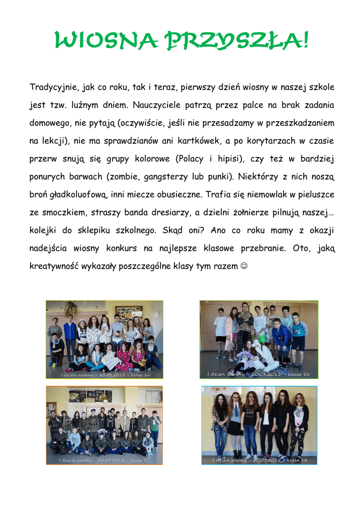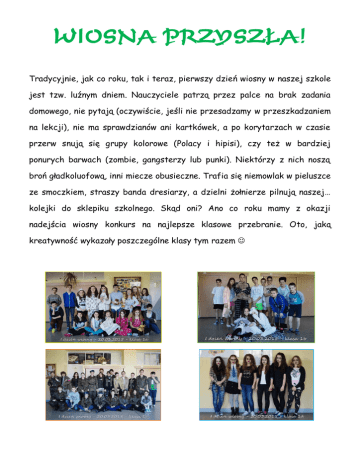 WIOSNA PRZYSZŁA! Tradycyjnie, jak co roku, tak i teraz, pierwszy dzień wiosny w naszej szkole jest tzw. luźnym dniem. Nauczyciele patrzą przez palce na brak zadania domowego, nie pytają (oczywiście, jeśli nie przesadzamy w przeszkadzaniem na lekcji), nie ma sprawdzianów ani kartkówek, a po korytarzach w czasie przerw snują się grupy kolorowe (Polacy i hipisi), czy też w bardziej ponurych barwach (zombie, gangsterzy lub punki). Niektórzy z nich noszą broń gładkoluofową, inni miecze obusieczne. Trafia się niemowlak w pieluszce ze smoczkiem, straszy banda dresiarzy, a dzielni żołnierze pilnują naszej… kolejki do sklepiku szkolnego. Skąd oni? Ano co roku mamy z okazji nadejścia wiosny konkurs na najlepsze klasowe przebranie. Oto, jaką kreatywność wykazały poszczególne klasy tym razem Szkoda, że nie wszyscy przyłączyli się do zabawy… Nagrody otrzymują: KLASOWO: INDYWIDUALNIE: I miejsce - kl. 2c I miejsce - Natasza Gąsior kl. 3d II miejsce - kl. 1c II miejsce - Gaba Świder kl. 1b III miejsce - kl. 3d III miejsce - Weronika Derendarz i Madzia Międlar kl. 1c