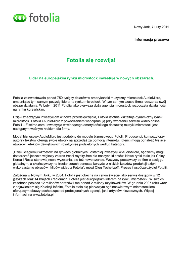Nowy Jork, 7 Luty 2011 Informacja prasowa Fotolia się rozwija! Lider na europejskim rynku microstock inwestuje w nowych obszarach. Fotolia zainwestowała ponad 750 tysięcy dolarów w amerykański muzyczny microstock AudioMicro, umacniając tym samym pozycję lidera na rynku microstock. W tym samym czasie firma rozszerza swój obszar działania. W Lutym 2011 Fotolia jako pierwsza duża agencja microstock rozpoczęła działalność na rynku koreańskim. Dzięki znaczącym inwestycjom w nowe przedsięwzięcia, Fotolia istotnie kształtuje dynamiczny rynek microstock. Fotolia i AudioMicro z powodzeniem współpracują przy tworzeniu serwisu wideo online Fotolii – Flixtime.com. Inwestycja w wiodącego amerykańskiego dostawcę muzyki microstock jest następnym ważnym krokiem dla firmy. Model biznesowy AudioMicro jest podobny do modelu biznesowego Fotolii. Producenci, kompozytorzy i autorzy tekstów oferują swoje utwory na sprzedaż za pomocą internetu. Klienci mogą odnaleźć tysiące utworów i efektów dźwiękowych royalty-free podzielonych według kategorii. „Dzięki ciągłemu wzrostowi na rynkach globalnych i ostatniej inwestycji w AudioMicro, będziemy mogli dostarczać jeszcze większy zakres treści royalty-free dla naszych klientów. Nowe rynki takie jak Chiny, Korea i Rosia stanowią nowe wyzwania, ale też nowe szanse. Wszyscy począwszy od firm o zasięgu globalnym, a skończywszy na freelancerach odnoszą korzyści z niskich kosztów produkcji dzięki wykorzystaniu obrazów i klipów wideo z Fotolia”, mówi Oleg Tscheltzoff, Prezes i współzałożyciel Fotolii. Założona w Nowym Jorku w 2004, Fotolia jest obecna na całym świecie jako serwis dostępny w 12 językach oraz 14 krajach i regionach. Fotolia jest europejskim liderem na rynku microstock. W swoich zasobach posiada 12 milionów obrazów i ma ponad 2 miliony użytkowników. W grudniu 2007 roku wraz z pojawieniem się Kolekcji Infinite, Fotolia stała się pierwszym ogólnoświatowym microstockiem oferującym obrazy pochodzące od profesjonalnych agencji, jak i artystów niezależnych. Więcej informacji na www.fotolia.pl.