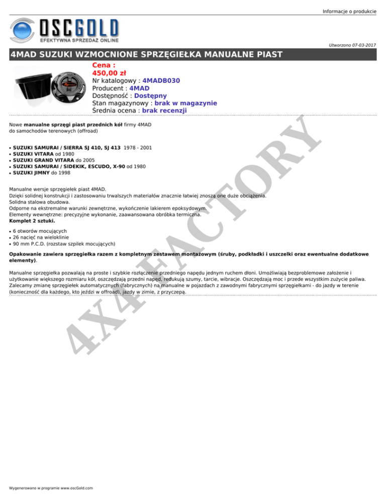 Informacje o produkcie Utworzono 07-03-2017 4MAD SUZUKI WZMOCNIONE SPRZĘGIEŁKA MANUALNE PIAST Cena : 450,00 zł Nr katalogowy : 4MADB030 Producent : 4MAD Dostępność : Dostępny Stan magazynowy : brak w magazynie Średnia ocena : brak recenzji ● ● ● SAMURAI / SIERRA SJ 410, SJ 413 1978 - 2001 VITARA od 1980 GRAND VITARA do 2005 SAMURAI / SIDEKIK, ESCUDO, X-90 od 1980 JIMNY do 1998 TO ● SUZUKI SUZUKI SUZUKI SUZUKI SUZUKI R ● Y Nowe manualne sprzęgi piast przednich kół firmy 4MAD do samochodów terenowych (offroad) ● ● FA ● 6 otworów mocujących 26 nacięć na wieloklinie 90 mm P.C.D. (rozstaw szpilek mocujących) C Manualne wersje sprzęgiełek piast 4MAD. Dzięki solidnej konstrukcji i zastosowaniu trwalszych materiałów znacznie łatwiej znoszą one duże obciążenia. Solidna stalowa obudowa. Odporne na ekstremalne warunki zewnętrzne, wykończenie lakierem epoksydowym. Elementy wewnętrzne: precyzyjne wykonanie, zaawansowana obróbka termiczna. Komplet 2 sztuki. Opakowanie zawiera sprzęgiełka razem z kompletnym zestawem montażowym (śruby, podkładki i uszczelki oraz ewentualne dodatkowe elementy). 4X 4 Manualne sprzęgiełka pozwalają na proste i szybkie rozłączenie przedniego napędu jednym ruchem dłoni. Umożliwiają bezproblemowe założenie i użytkowanie większego rozmiaru kół, oszczędzają przedni napęd, redukują szumy, tarcie, wibracje. Oszczędzają moc i przede wszystkim zużycie paliwa. Zalecamy zmianę sprzęgiełek automatycznych (fabrycznych) na manualne w pojazdach z zawodnymi fabrycznymi sprzęgiełkami - do jazdy w terenie (konieczność dla każdego, kto jeździ w offroad), jazdy w zimie, z przyczepą. Wygenerowano w programie www.oscGold.com