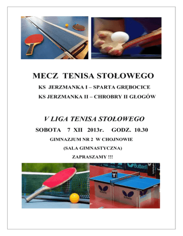 MECZ TENISA STOŁOWEGO KS JERZMANKA I – SPARTA GRĘBOCICE KS JERZMANKA II – CHROBRY II GŁOGÓW V LIGA TENISA STOŁOWEGO SOBOTA 7 XII 2013r. GODZ. 10.30 GIMNAZJUM NR 2 W CHOJNOWIE (SALA GIMNASTYCZNA) ZAPRASZAMY !!!