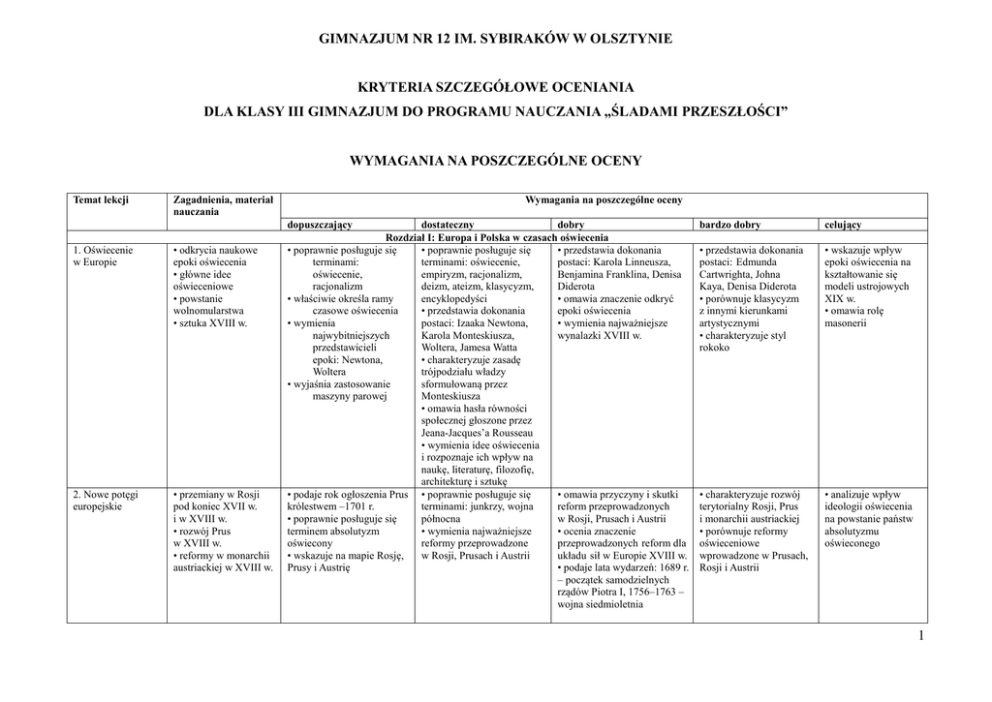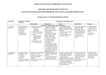 GIMNAZJUM NR 12 IM. SYBIRAKÓW W OLSZTYNIE KRYTERIA SZCZEGÓŁOWE OCENIANIA DLA KLASY III GIMNAZJUM DO PROGRAMU NAUCZANIA „ŚLADAMI PRZESZŁOŚCI” WYMAGANIA NA POSZCZEGÓLNE OCENY Temat lekcji Zagadnienia, materiał nauczania Wymagania na poszczególne oceny dopuszczający 1. Oświecenie w Europie • odkrycia naukowe epoki oświecenia • główne idee oświeceniowe • powstanie wolnomularstwa • sztuka XVIII w. 2. Nowe potęgi europejskie • przemiany w Rosji pod koniec XVII w. i w XVIII w. • rozwój Prus w XVIII w. • reformy w monarchii austriackiej w XVIII w. dostateczny dobry Rozdział I: Europa i Polska w czasach oświecenia • poprawnie posługuje się • poprawnie posługuje się • przedstawia dokonania terminami: terminami: oświecenie, postaci: Karola Linneusza, oświecenie, empiryzm, racjonalizm, Benjamina Franklina, Denisa racjonalizm deizm, ateizm, klasycyzm, Diderota • właściwie określa ramy encyklopedyści • omawia znaczenie odkryć czasowe oświecenia • przedstawia dokonania epoki oświecenia • wymienia postaci: Izaaka Newtona, • wymienia najważniejsze najwybitniejszych Karola Monteskiusza, wynalazki XVIII w. przedstawicieli Woltera, Jamesa Watta epoki: Newtona, • charakteryzuje zasadę Woltera trójpodziału władzy • wyjaśnia zastosowanie sformułowaną przez maszyny parowej Monteskiusza • omawia hasła równości społecznej głoszone przez Jeana-Jacques’a Rousseau • wymienia idee oświecenia i rozpoznaje ich wpływ na naukę, literaturę, filozofię, architekturę i sztukę • podaje rok ogłoszenia Prus • poprawnie posługuje się • omawia przyczyny i skutki królestwem –1701 r. terminami: junkrzy, wojna reform przeprowadzonych • poprawnie posługuje się północna w Rosji, Prusach i Austrii terminem absolutyzm • wymienia najważniejsze • ocenia znaczenie oświecony reformy przeprowadzone przeprowadzonych reform dla • wskazuje na mapie Rosję, w Rosji, Prusach i Austrii układu sił w Europie XVIII w. Prusy i Austrię • podaje lata wydarzeń: 1689 r. – początek samodzielnych rządów Piotra I, 1756–1763 – wojna siedmioletnia bardzo dobry celujący • przedstawia dokonania postaci: Edmunda Cartwrighta, Johna Kaya, Denisa Diderota • porównuje klasycyzm z innymi kierunkami artystycznymi • charakteryzuje styl rokoko • wskazuje wpływ epoki oświecenia na kształtowanie się modeli ustrojowych XIX w. • omawia rolę masonerii • charakteryzuje rozwój terytorialny Rosji, Prus i monarchii austriackiej • porównuje reformy oświeceniowe wprowadzone w Prusach, Rosji i Austrii • analizuje wpływ ideologii oświecenia na powstanie państw absolutyzmu oświeconego 1 GIMNAZJUM NR 12 IM. SYBIRAKÓW W OLSZTYNIE 3. Rzeczpospolita za panowania Wettinów • polsko-saska unia personalna • wojna północna i jej skutki • rządy Augusta III • skutki unii polsko-saskiej • poprawnie posługuje się terminami: wojna północna, Sejm Niemy • podaje lata wydarzeń: 1697 r. – koronacja Augusta II Mocnego, 1763 r. – śmierć Augusta III Sasa • przedstawia dokonania Stanisława Leszczyńskiego • podaje lata wydarzeń: 1699 r. – pokój w Karłowicach, 1717 r. – Sejm Niemy • przedstawia dokonania postaci: Augusta II Mocnego, Augusta III Sasa • charakteryzuje skutki wojny północnej dla Polski • wskazuje na mapie zasięg terytorialny Rzeczypospolitej za panowania Sasów • wyjaśnia zmiany położenia międzynarodowego Rzeczypospolitej w XVIII w. • poprawnie posługuje się terminami: konfederacja warszawska, konfederacja sandomierska, Order Orła Białego • podaje lata wydarzeń: 1704–1709 i 1733–1736 – panowanie Stanisława Leszczyńskiego, 1709 r. – bitwa pod Połtawą, 1721 r. – pokój w Nystad, 1736 r. – sejm pacyfikacyjny • wyjaśnia okoliczności elekcji Augusta II Mocnego • opisuje przebieg wojny północnej • wymienia przyczyny i przejawy kryzysu państwa polskiego w czasach saskich • analizuje politykę wewnętrzną i zewnętrzną Wettinów • szczegółowo omawia znaczenie oraz skutki wojny północnej • przy pomocy mapy wyjaśnia zmiany położenia międzynarodowego Rzeczypospolitej w XVIII w. na tle sytuacji międzynarodowej • analizuje politykę wewnętrzną i zewnętrzną Wettinów • dokonuje samodzielnej oceny znaczenia i następstw rządów Wettinów w Rzeczypospolitej • charakteryzuje przyczyny wzrostu nietolerancji religijnej w Polsce 4. Ostatni król elekcyjny • elekcja Stanisława Augusta Poniatowskiego • początek rządów Stanisława Augusta Poniatowskiego • konfederacja barska • pierwszy rozbiór Rzeczypospolitej • poprawnie posługuje się terminami: konfederacja barska, sejm rozbiorowy • podaje rok pierwszego rozbioru Polski – 1772 r. • wymienia przyczyny i skutki pierwszego rozbioru • poprawnie posługuje się terminami: Familia, Rada Nieustająca • podaje rok koronacji Stanisława Augusta Poniatowskiego – 1764 r. • omawia okoliczności elekcji Stanisława Augusta Poniatowskiego • przedstawia rolę postaci: Tadeusza Rejtana, Mikołaja Repnina • wskazuje na mapie zmiany terytorialne po pierwszym rozbiorze Polski • wymienia przyczyny i skutki pierwszego rozbioru • poprawnie posługuje się terminami: konfederacja słucka, toruńska, radomska, prawa kardynalne, ryngraf, innowierca • podaje rok zawiązania konfederacji barskiej – 1768 r. • omawia reformy sejmu konwokacyjnego • przedstawia rolę postaci: Maurycego Beniowskiego, Kajetana Sołtyka, Józefa Andrzeja Załuskiego, Wacława Rzewuskiego, Józefa Pułaskiego, Michała Krasińskiego oraz ocenia ich wpływ na dzieje Polski • samodzielnie ocenia działalność króla w latach 1764–1772 5. Tajemnice sprzed wieków – Co przedstawia „Kołacz królewski”? • reakcje mieszkańców Europy wobec rozbioru Rzeczypospolitej • rycina „Kołacz królewski” • kopie i interpretacje rysunku przedstawiającego rozbiór Polski • charakte