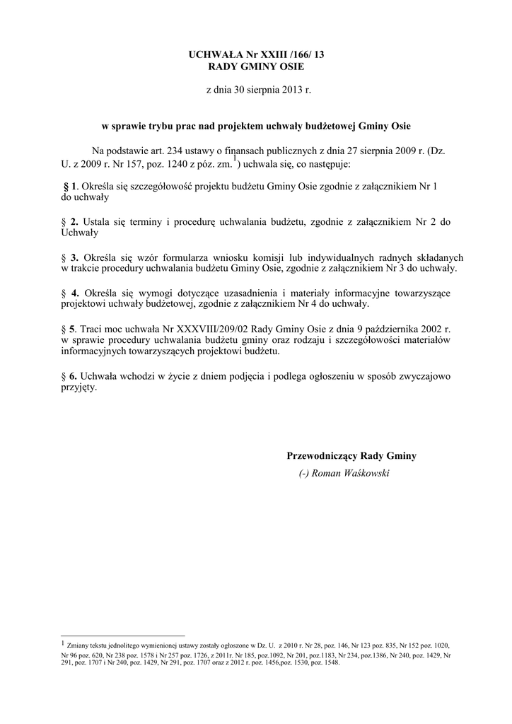 UCHWAŁA Nr XXIII /166/ 13 RADY GMINY OSIE z dnia 30 sierpnia 2013 r. w sprawie trybu prac nad projektem uchwały budżetowej Gminy Osie Na podstawie art. 234 ustawy o finansach publicznych z dnia 27 sierpnia 2009 r. (Dz. 1 U. z 2009 r. Nr 157, poz. 1240 z póz. zm. ) uchwala się, co następuje: § 1. Określa się szczegółowość projektu budżetu Gminy Osie zgodnie z załącznikiem Nr 1 do uchwały § 2. Ustala się terminy i procedurę uchwalania budżetu, zgodnie z załącznikiem Nr 2 do Uchwały § 3. Określa się wzór formularza wniosku komisji lub indywidualnych radnych składanych w trakcie procedury uchwalania budżetu Gminy Osie, zgodnie z załącznikiem Nr 3 do uchwały. § 4. Określa się wymogi dotyczące uzasadnienia i materiały informacyjne towarzyszące projektowi uchwały budżetowej, zgodnie z załącznikiem Nr 4 do uchwały. § 5. Traci moc uchwała Nr XXXVIII/209/02 Rady Gminy Osie z dnia 9 października 2002 r. w sprawie procedury uchwalania budżetu gminy oraz rodzaju i szczegółowości materiałów informacyjnych towarzyszących projektowi budżetu. § 6. Uchwała wchodzi w życie z dniem podjęcia i podlega ogłoszeniu w sposób zwyczajowo przyjęty. Przewodniczący Rady Gminy (-) Roman Waśkowski 1 Zmiany tekstu jednolitego wymienionej ustawy zostały ogłoszone w Dz. U. z 2010 r. Nr 28, poz. 146, Nr 123 poz. 835, Nr 152 poz. 1020, Nr 96 poz. 620, Nr 238 poz. 1578 i Nr 257 poz. 1726, z 2011r. Nr 185, poz.1092, Nr 201, poz.1183, Nr 234, poz.1386, Nr 240, poz. 1429, Nr 291, poz. 1707 i Nr 240, poz. 1429, Nr 291, poz. 1707 oraz z 2012 r. poz. 1456,poz. 1530, poz. 1548. Uzasadnienie Na podstawie przepisów wynikających z ustawy z dnia 27 sierpnia 2009 roku o finansach publicznych z treści przepisu art.234 organ stanowiący jest zobowiązany uchwalić tryb prac nad projektem uchwały budżetowej. Na podstawie przepisu art.234 Rada Gminy określa w szczególności : procedurę uchwalania budżetu oraz rodzaj i szczegółowość materiałów informacyjnych towarzyszących projektowi budżetu . - wymaganą szczegółowość projektu budżetu jednostki samorządu terytorialnego, - terminy obowiązujące w toku prac nad projektem uchwały budżetowej jednostki samorządu terytorialnego; - wymogi dotyczące uzasadnienia i materiałów informacyjnych, które Wójt przedkłada organowi stanowiącemu jednostki samorządu terytorialnego wraz z projektem uchwały budżetowej, wobec czego podjęcie uchwały jest zasadne.